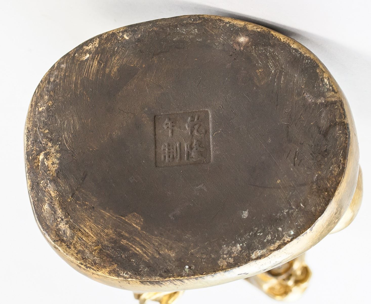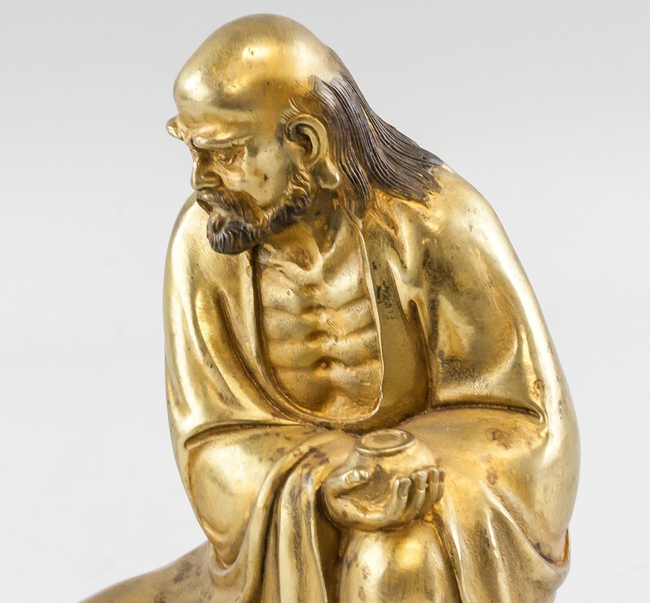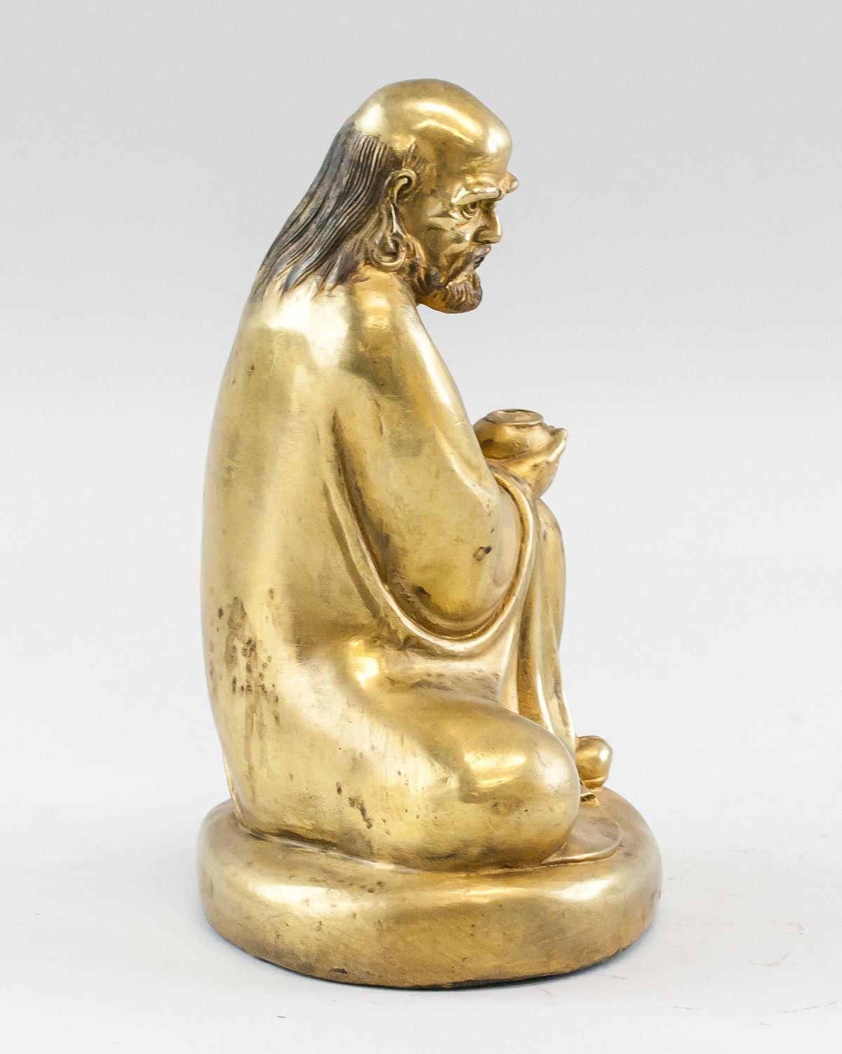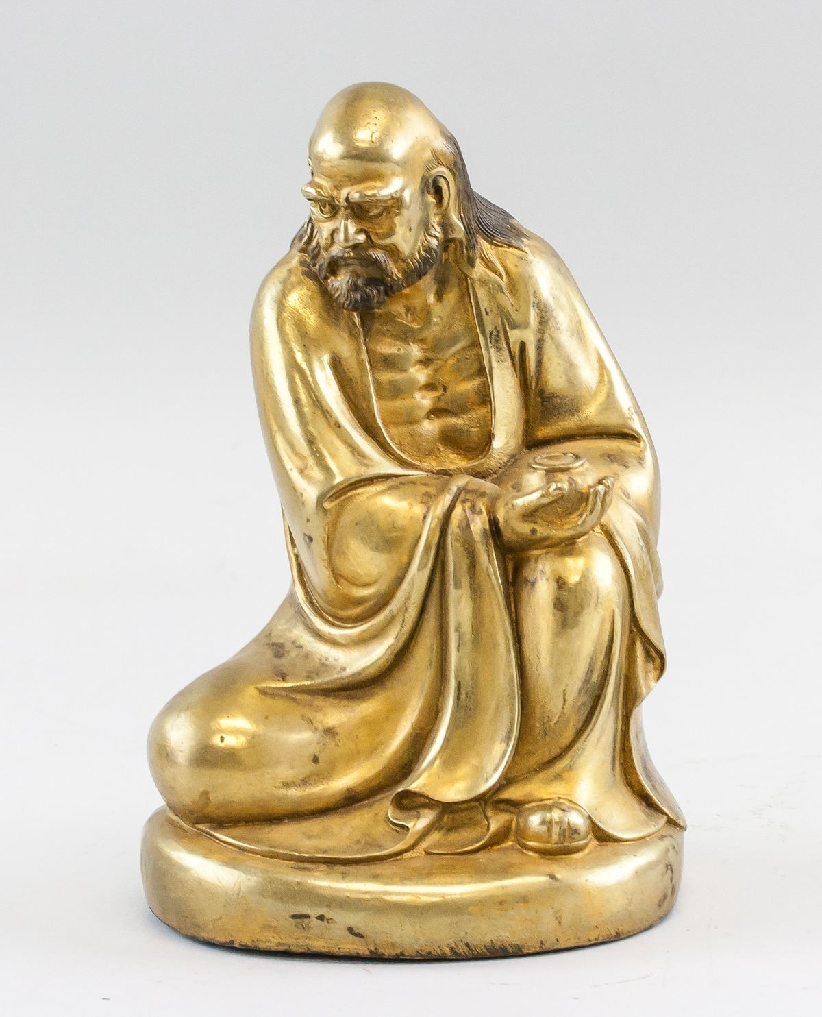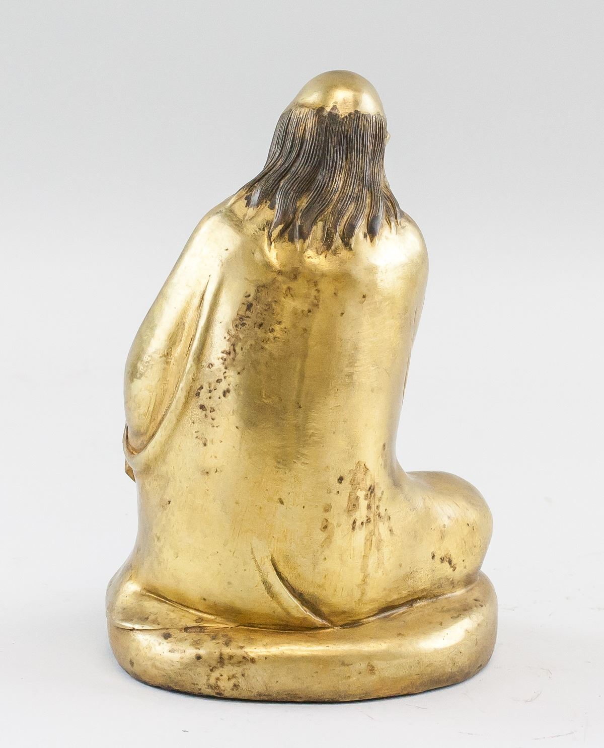 Chinese gilt bronze statue. Featuring semi-seated Lohan on base. Four-character Qing dynasty Qianlong mark on base. 24 x 15 cm, 1594 grams