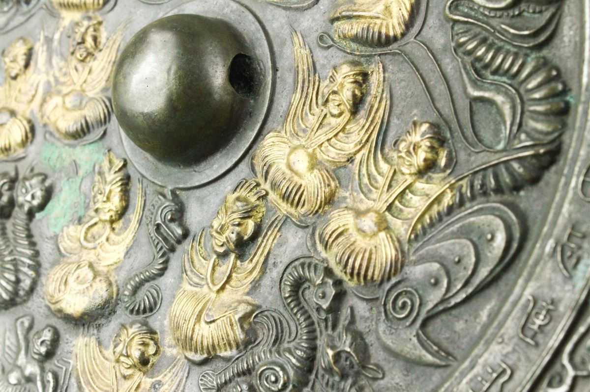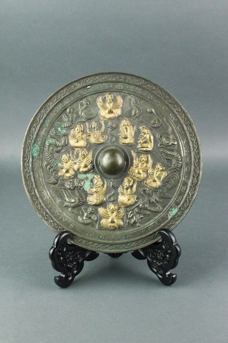 Chinese gilt bronze mirror; of circular form with a knob on front; featuring arhats and mythical beasts in low relief; H: 1 cm, D: 24 cm, 1458 grams