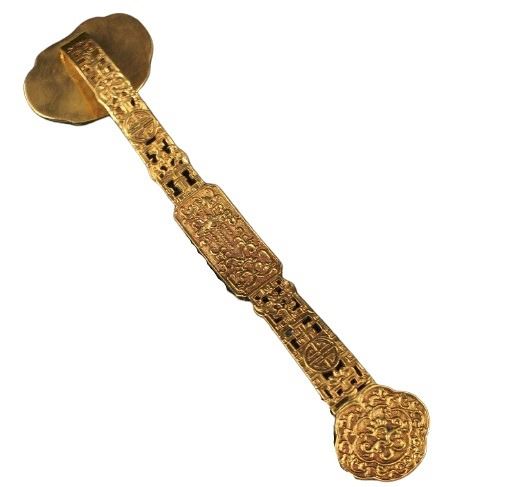 Chinese Gilt Bronze Scepter, decorated with dragon pattren. It was created by skilled craftsmen in traditional style with fine handcrafts. the handwork is very fine with incredible detailling. This is a great piece of valuable collection, a valuable personal alter or a very good present. Don't miss out this chance to get it .Good luck to you!