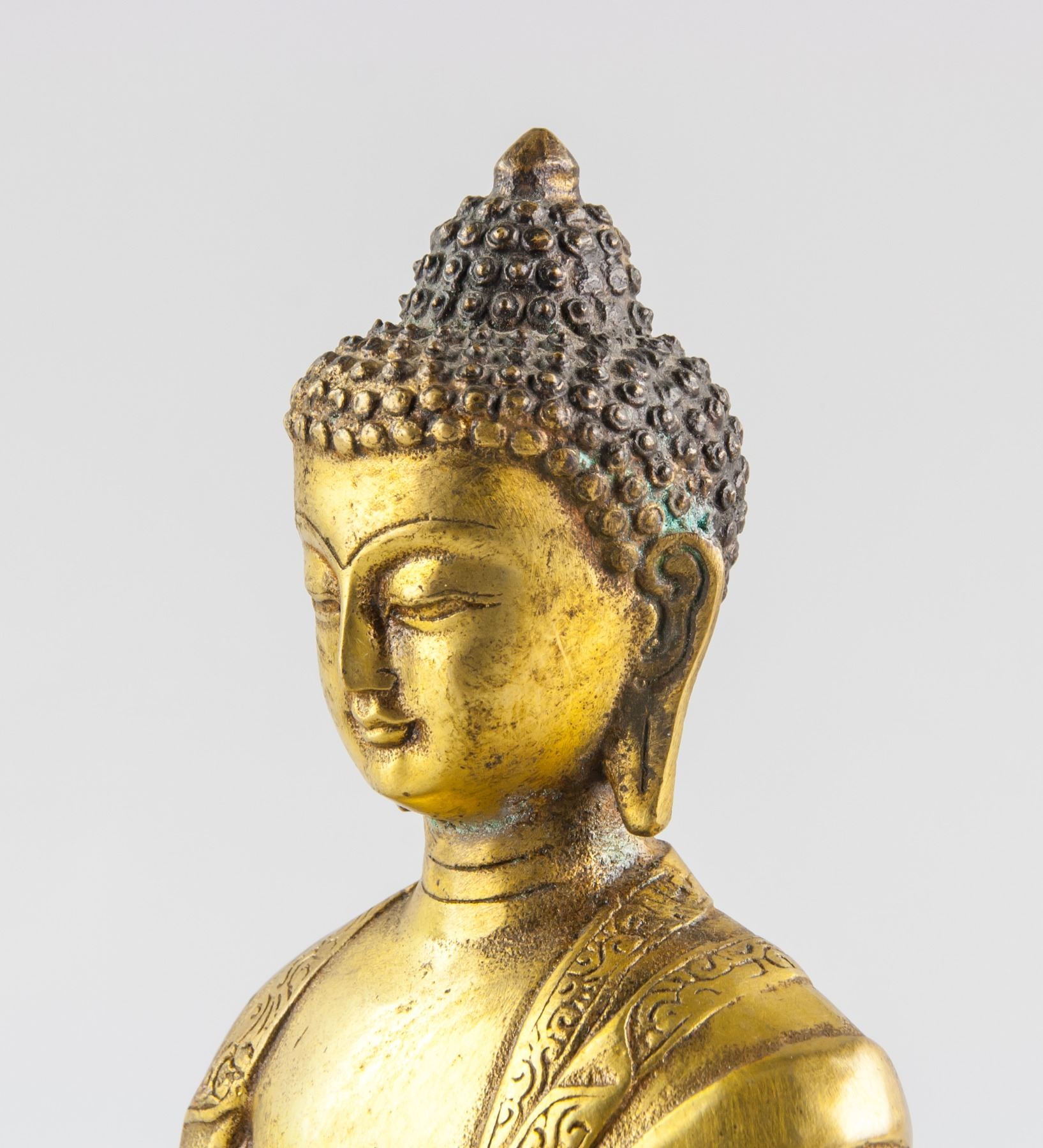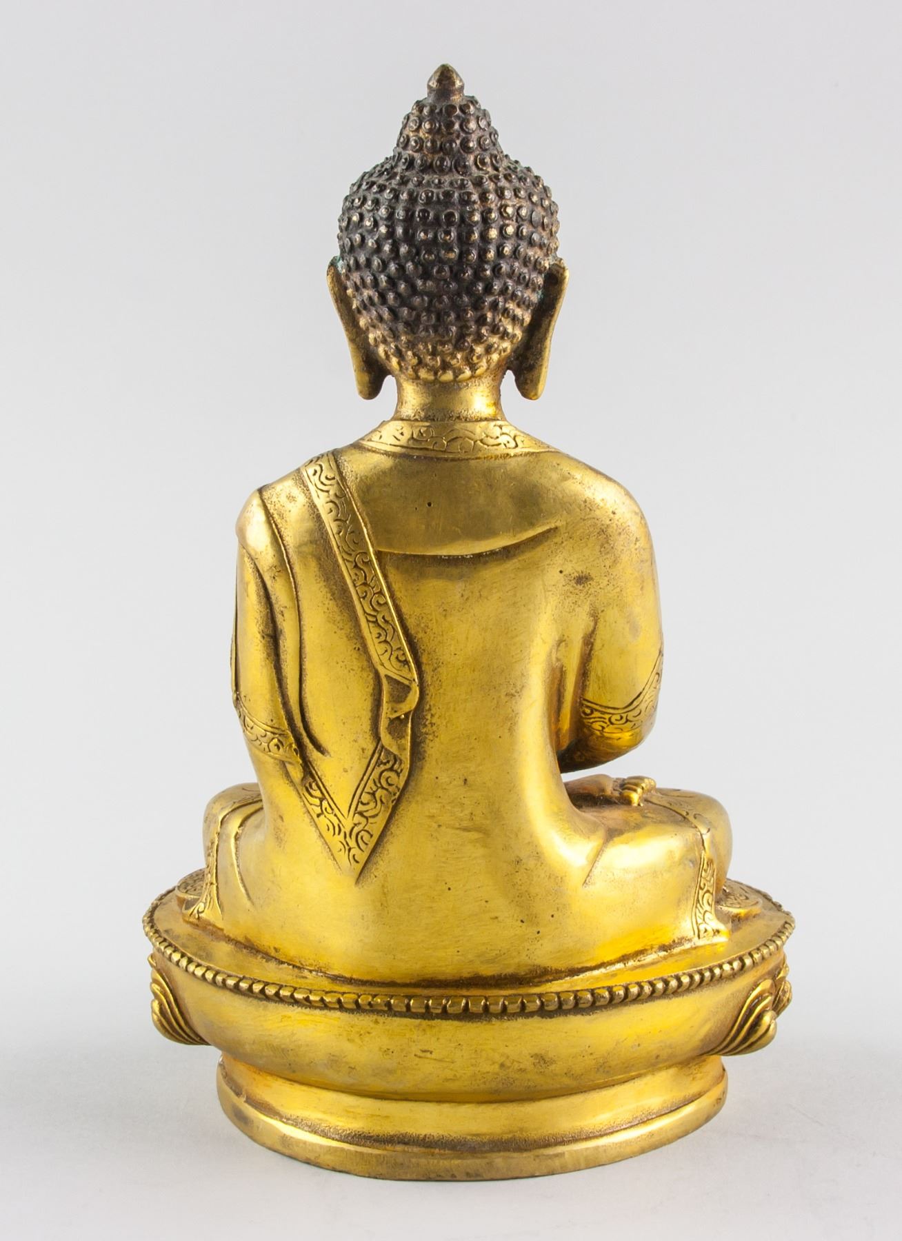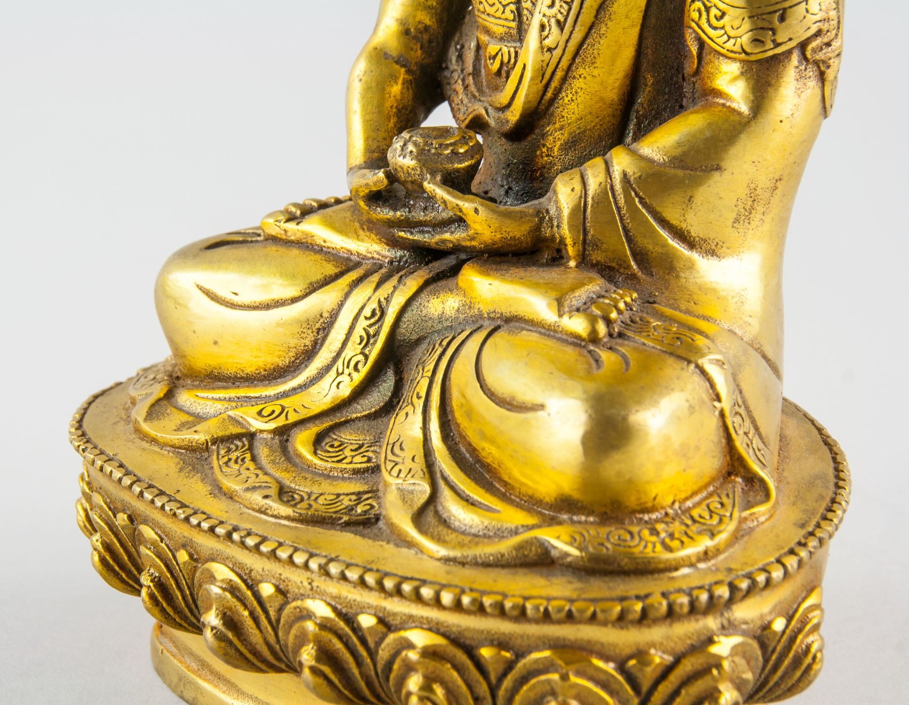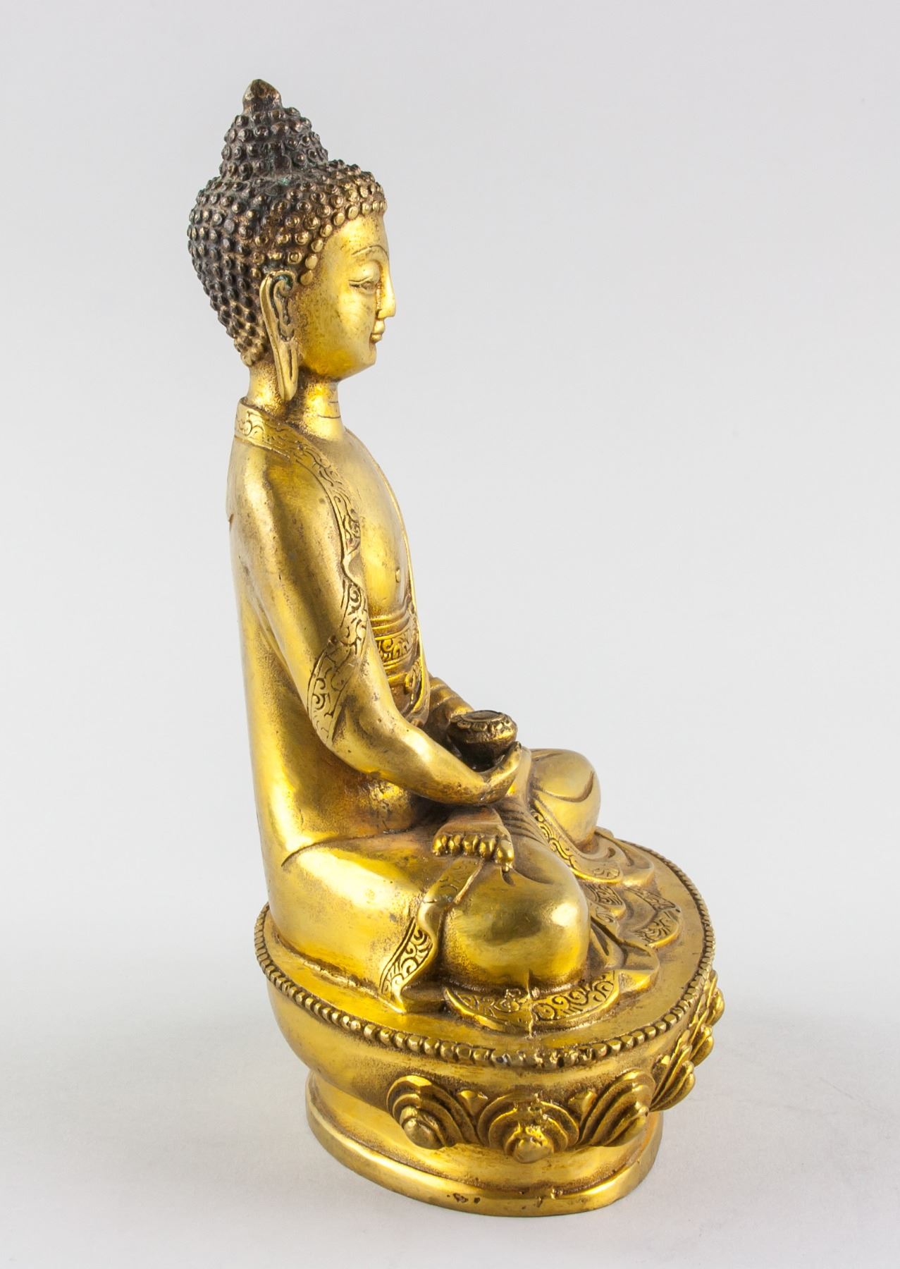 Chinese gilt bronze Buddha statue; depicting seated Shakyamuni Buddha on lotus pedal base; two hands in meditation mudra, holding a bowl; cross thunderbolt mark on base; H: 20 cm, W: 13 cm, 1034 grams
