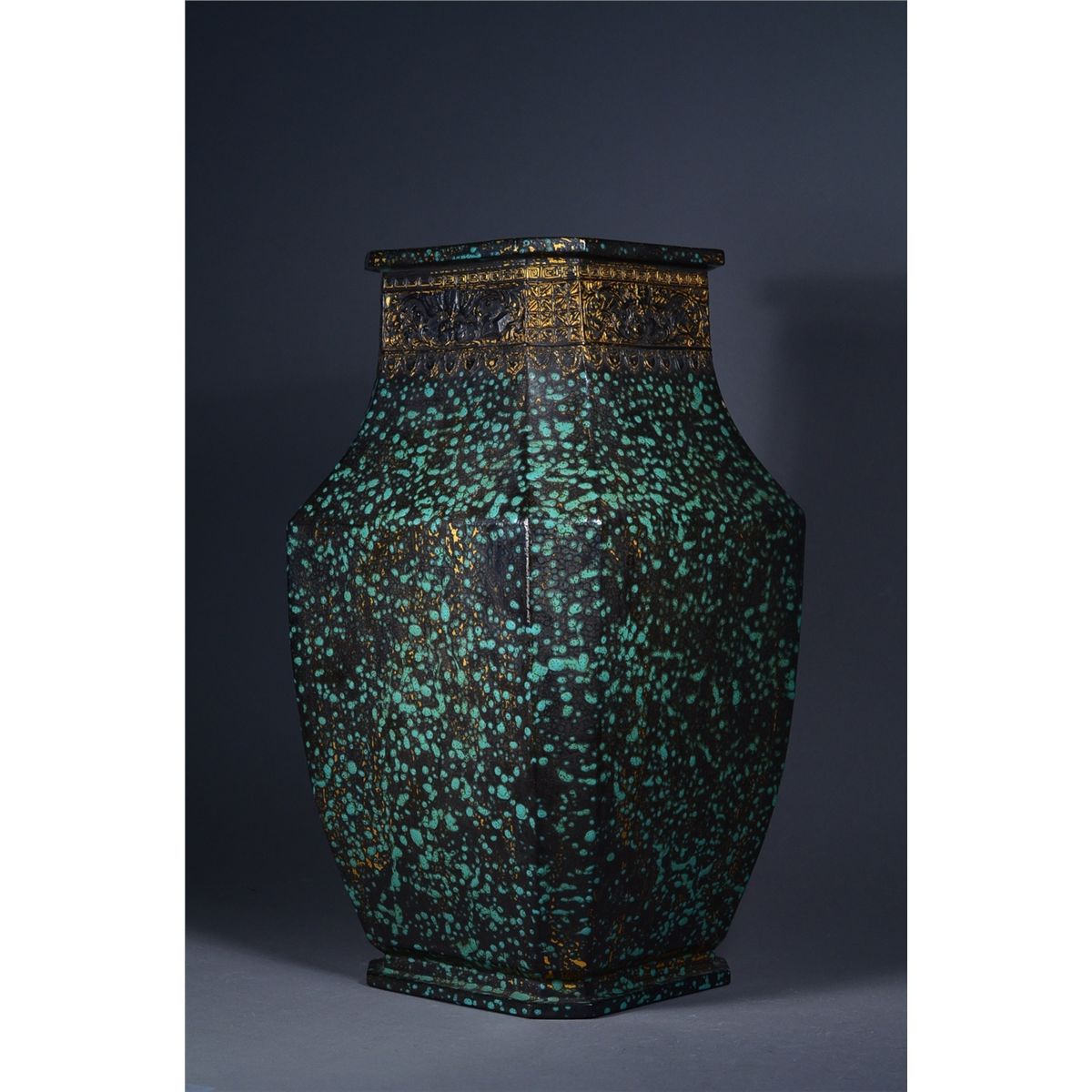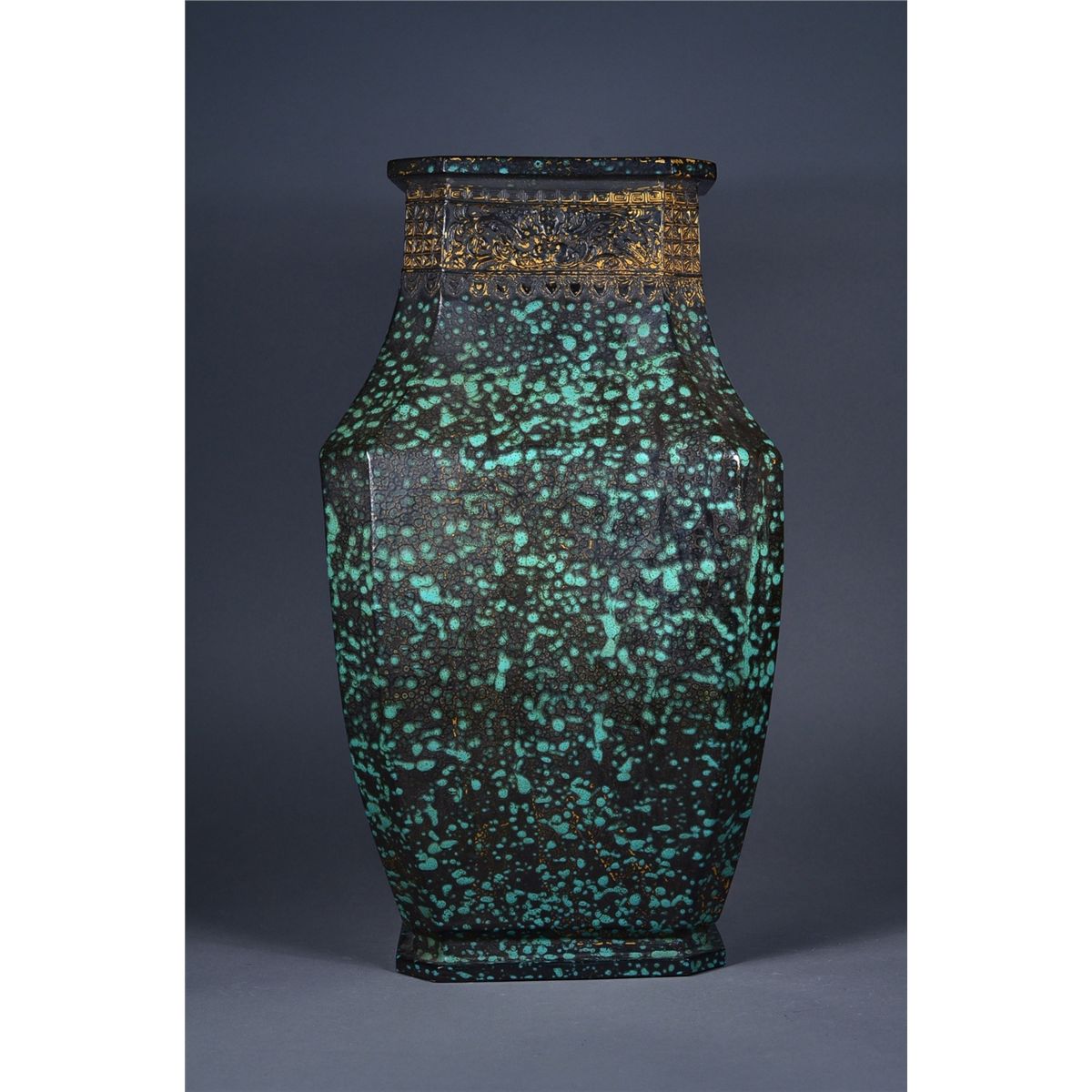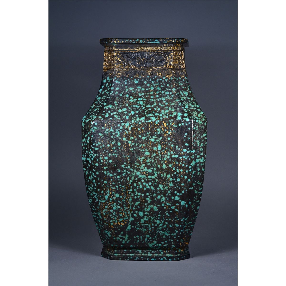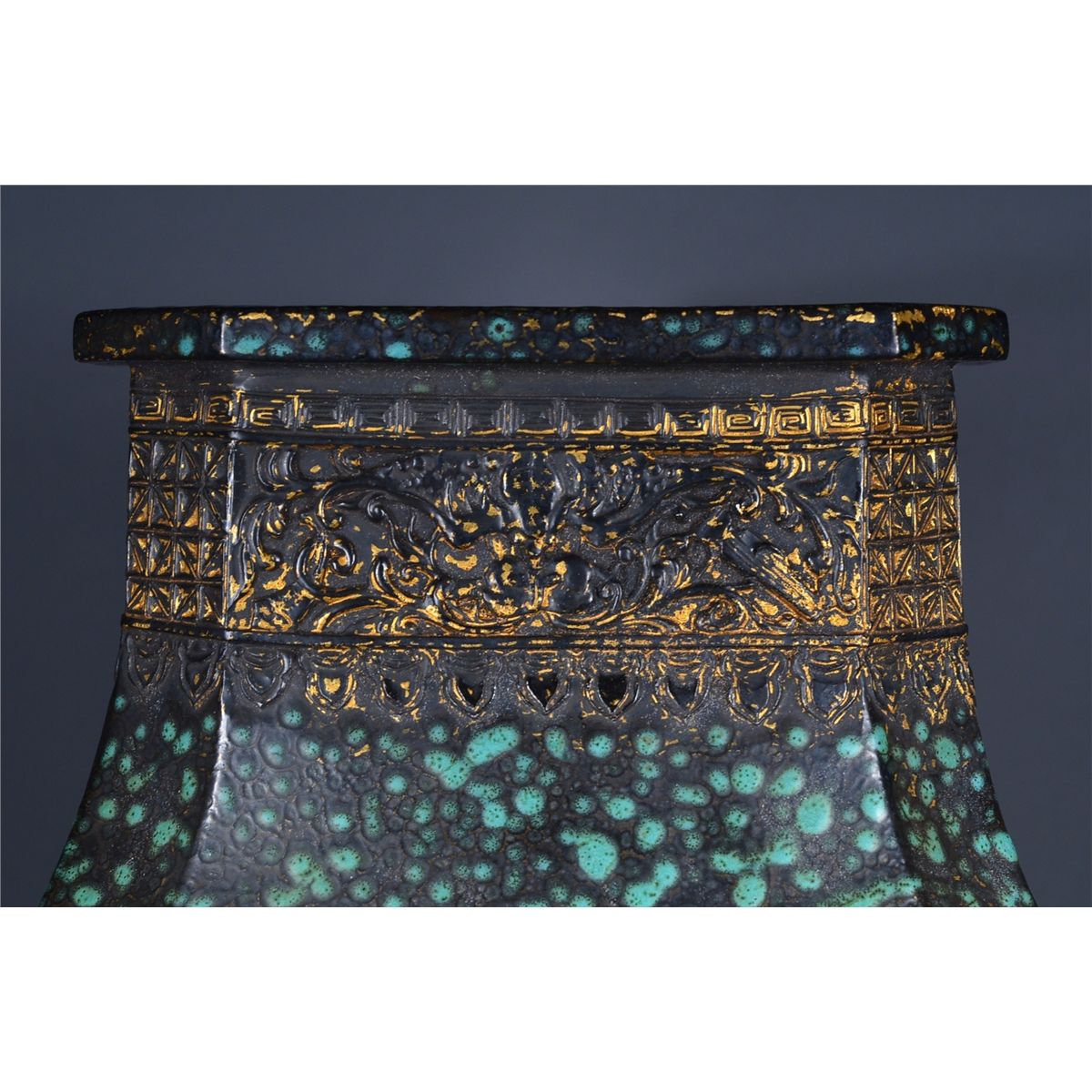 Rare Chinese square hu-shaped porcelain vase; the entire vase is covered with clear evidence of Gutoncai enameling: bronze glazes composed of speckled turquoise glazes fired at low temperatures for the specific purpose of emulating a patinated bronze object; a register of auspicious bats atop peaches with classic scroll below a key-fret border underneath a raised rim in gilt gold; recessed base with flaked gilt gold six-character Qianlong Mark on base; H: 43 cm, L: 23 cm, W: 23 cm