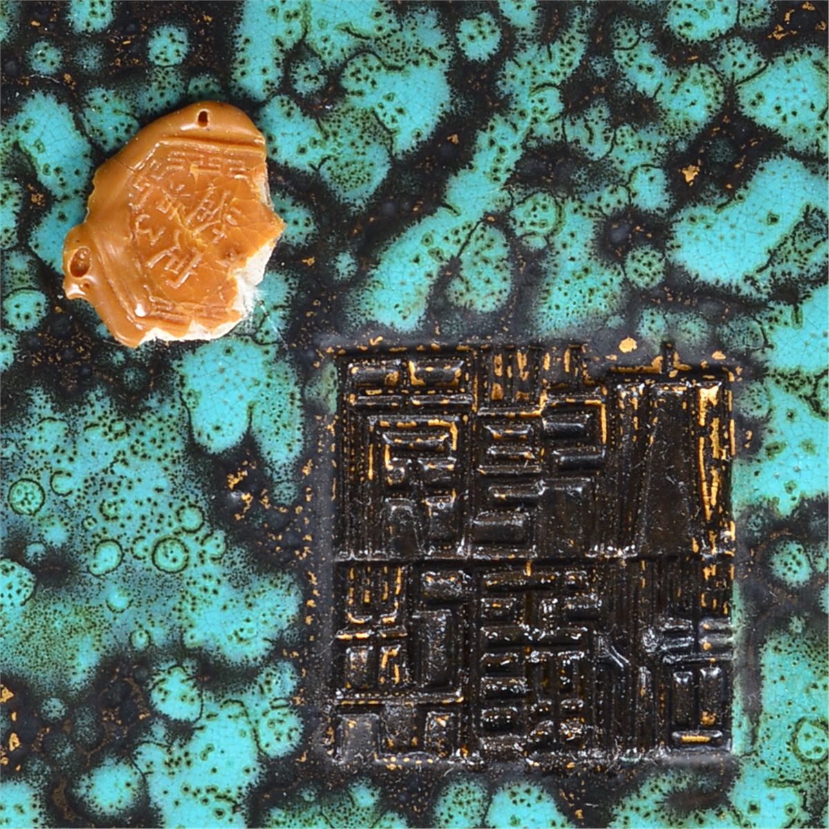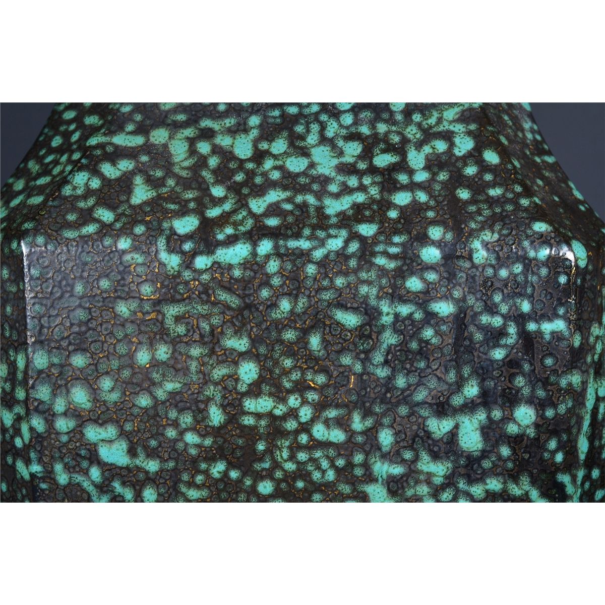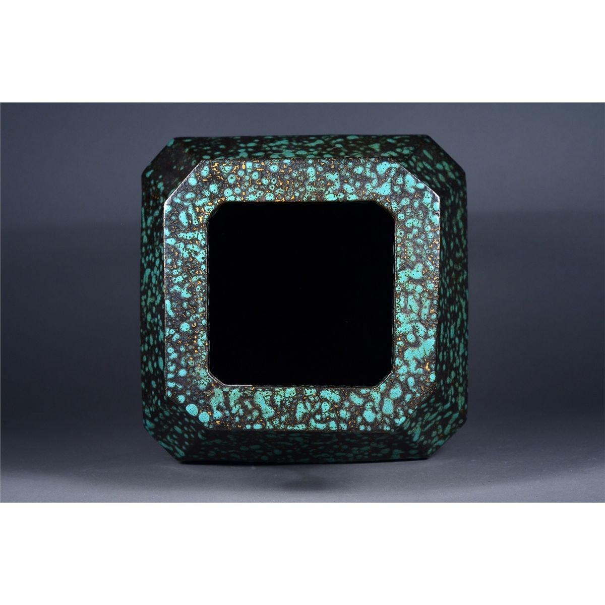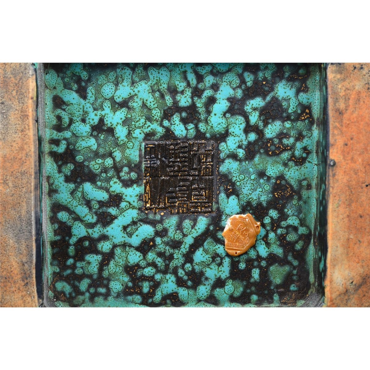 Rare Chinese square hu-shaped porcelain vase; the entire vase is covered with clear evidence of Gutoncai enameling: bronze glazes composed of speckled turquoise glazes fired at low temperatures for the specific purpose of emulating a patinated bronze object; a register of auspicious bats atop peaches with classic scroll below a key-fret border underneath a raised rim in gilt gold; recessed base with flaked gilt gold six-character Qianlong Mark on base; H: 43 cm, L: 23 cm, W: 23 cm