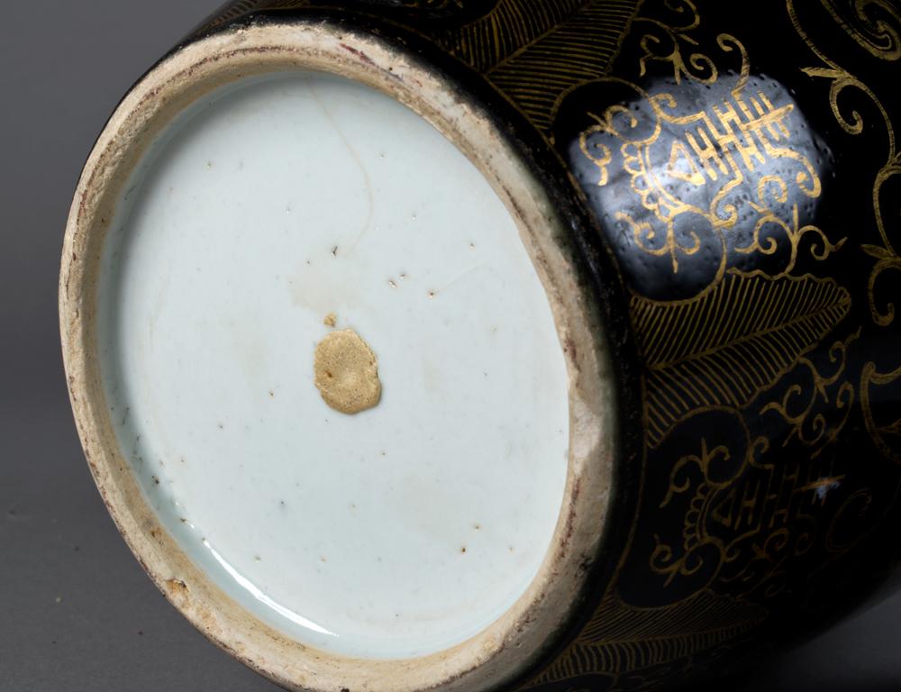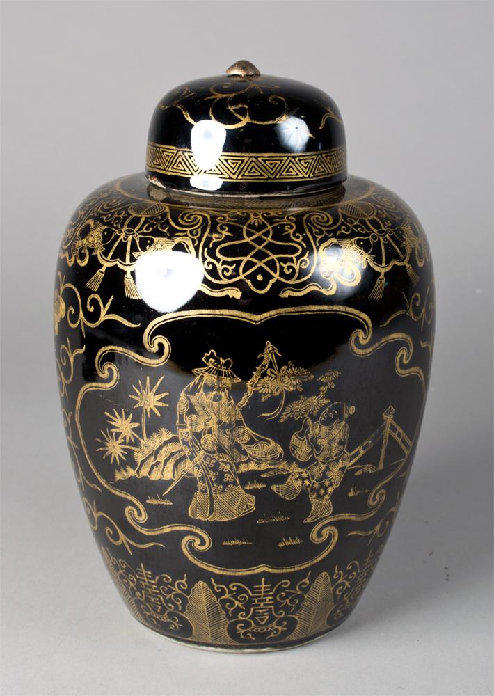 Finely decorated to depict two cartouche shaped panels depicting figures and animals, the balance decorated with lotus and precious objects all against a mirrored black ground, the base with partial wax seal, 11"H circa 19th century lid with added metal finial.