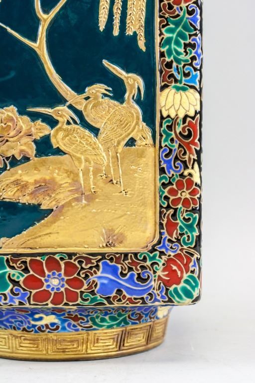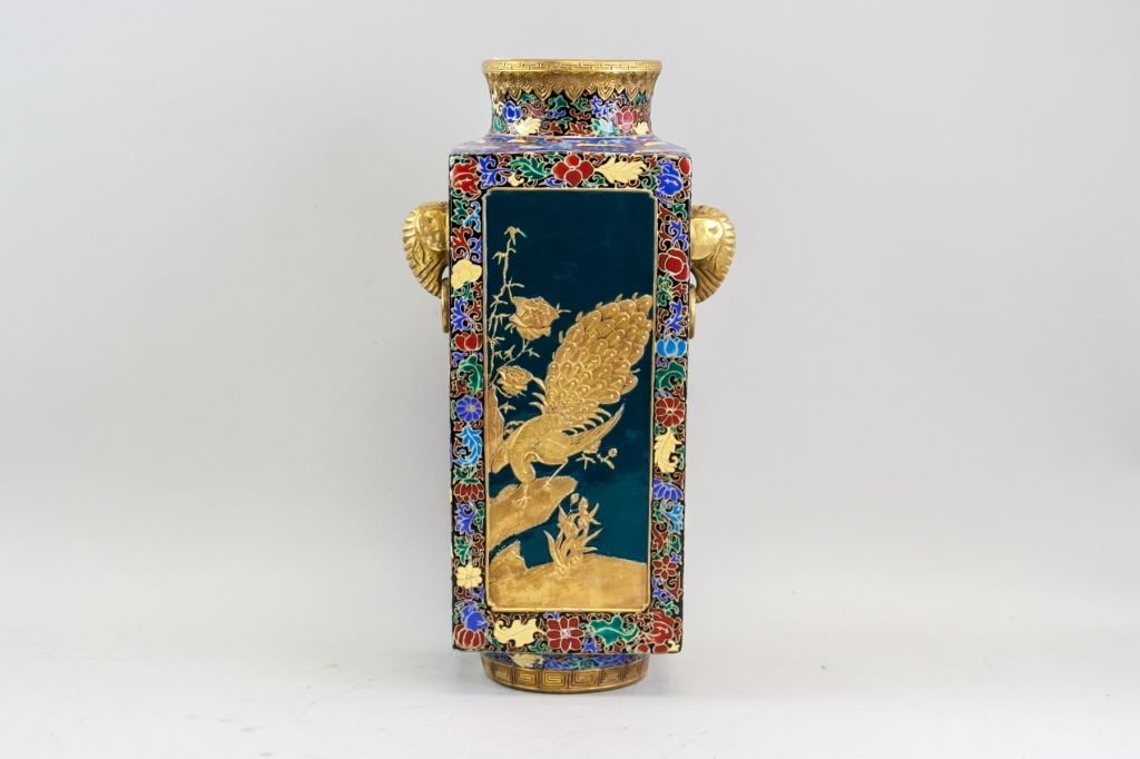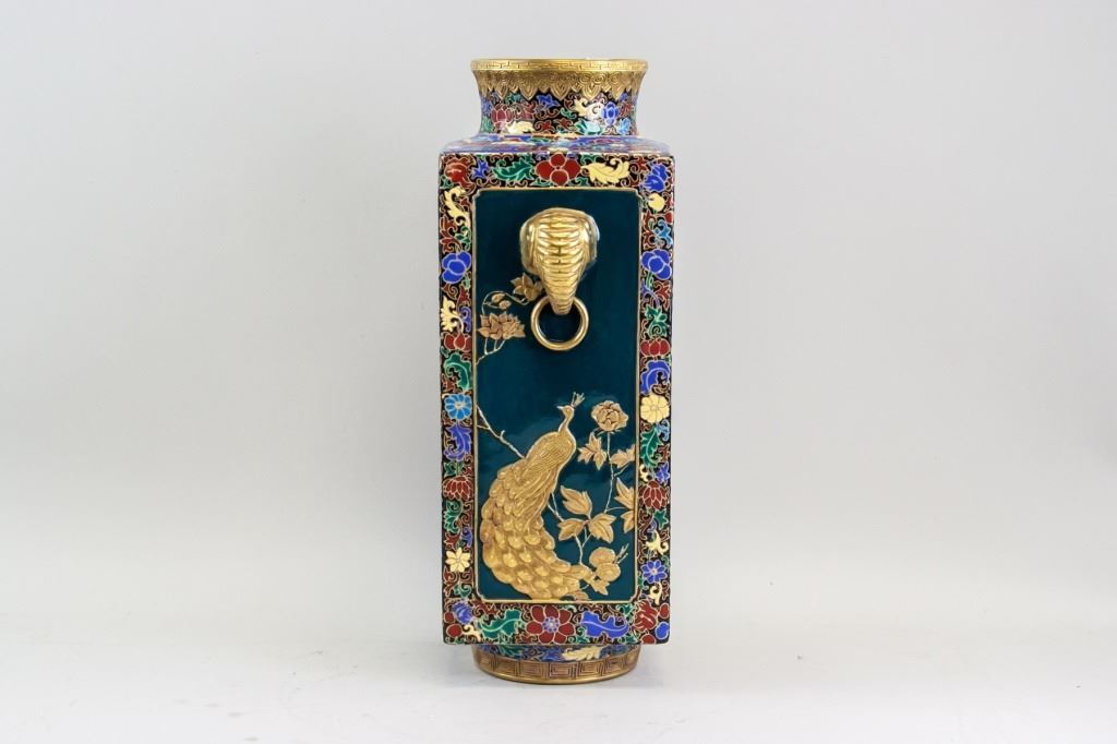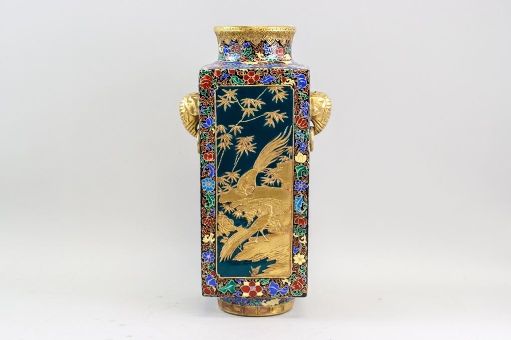 Chinese porcelain vase. With round opening and square body, resting on short round foot rim. Painted with gilt phoenix and peacock. Two gilded ears sit near the top of the vase. Six character Qing dynasty Qianlong mark on base. 38 x 21 cm, 4019 g.
