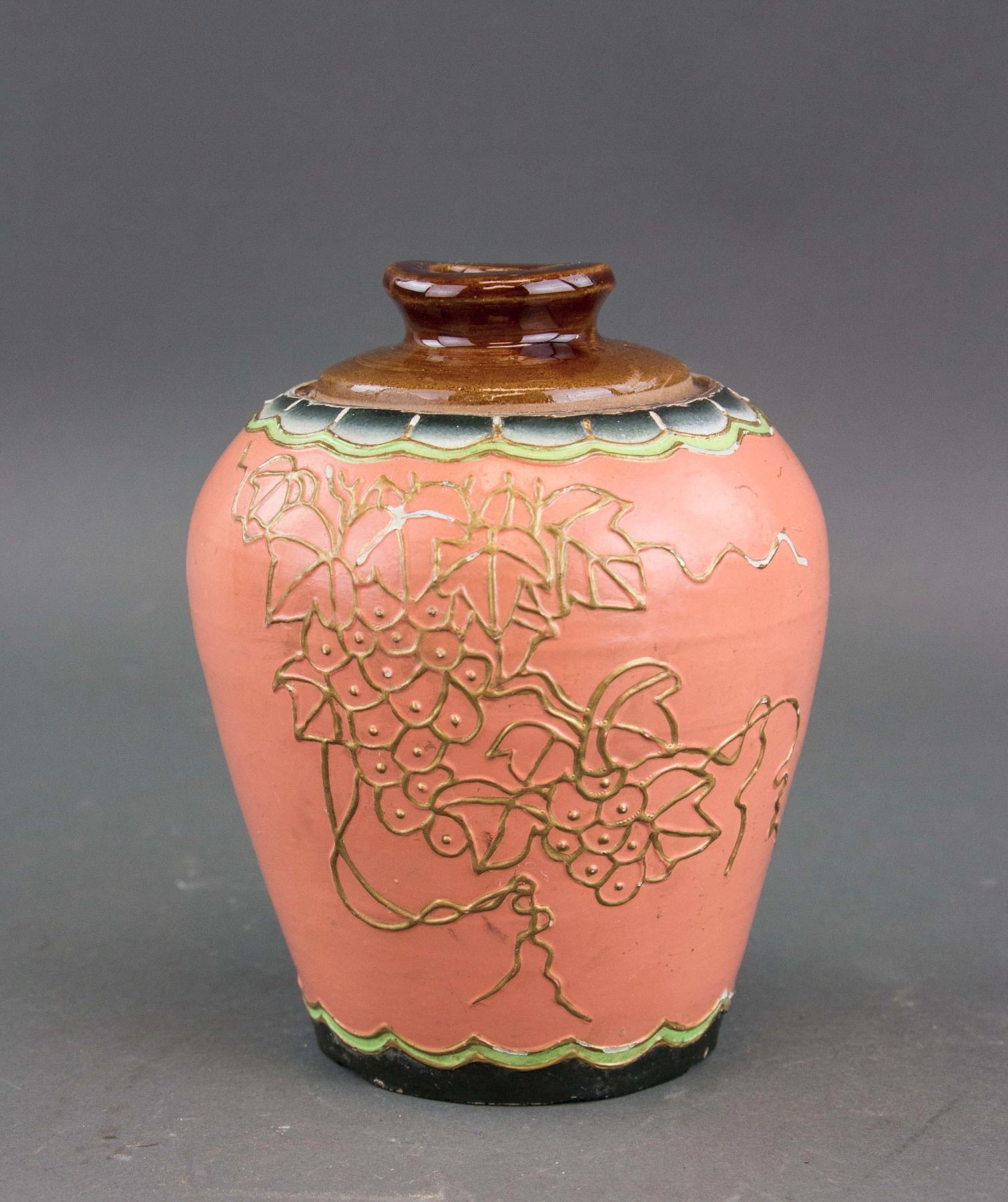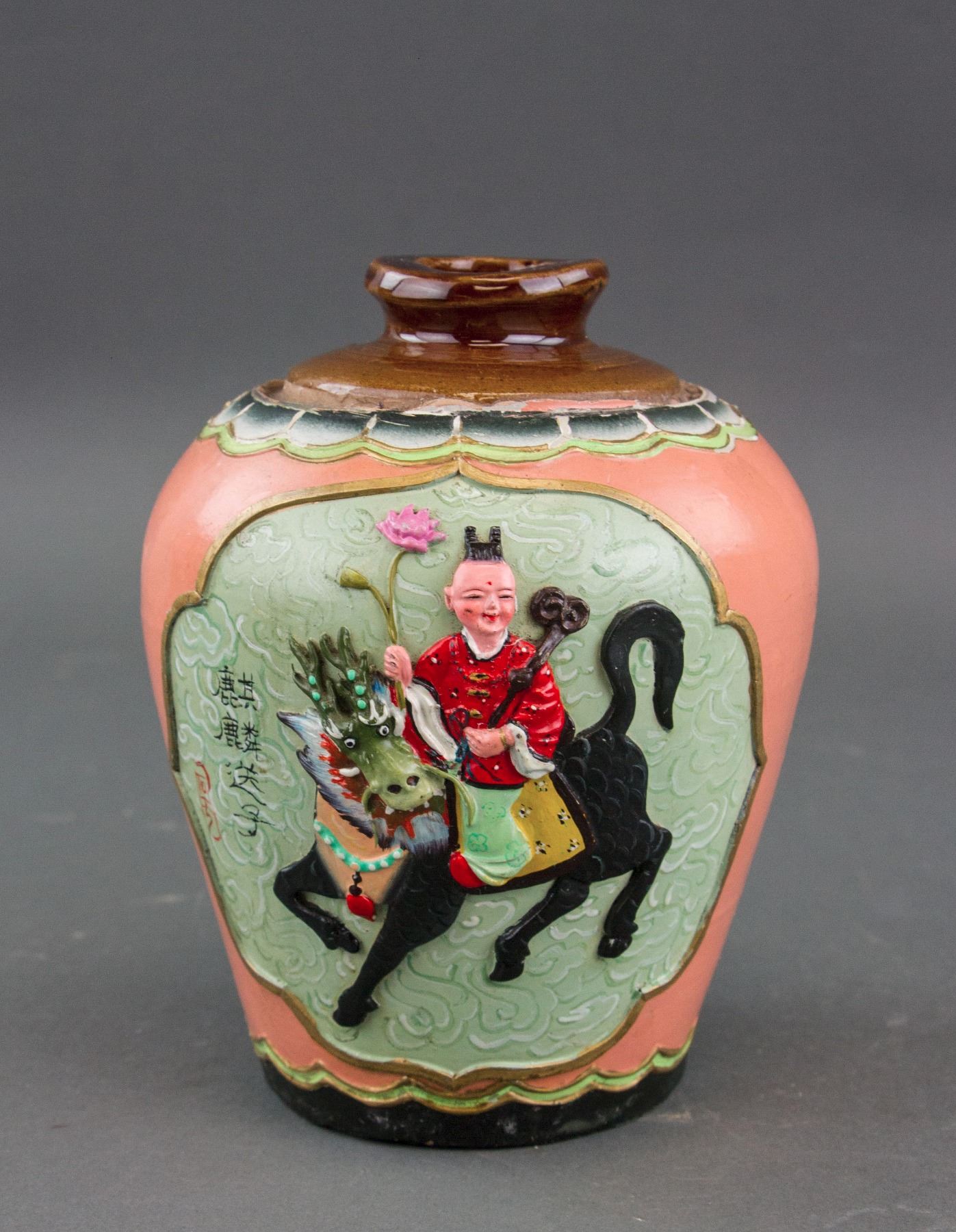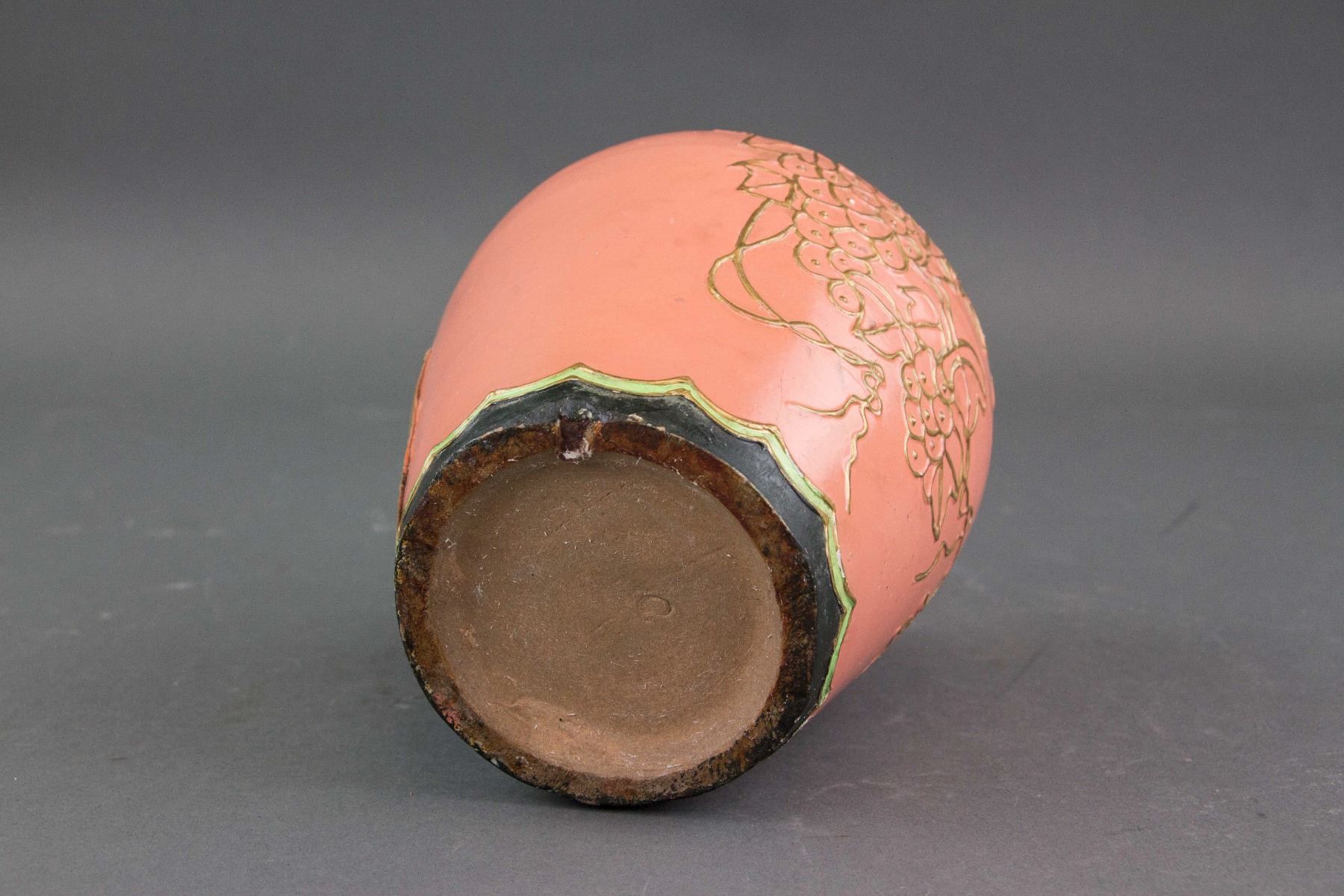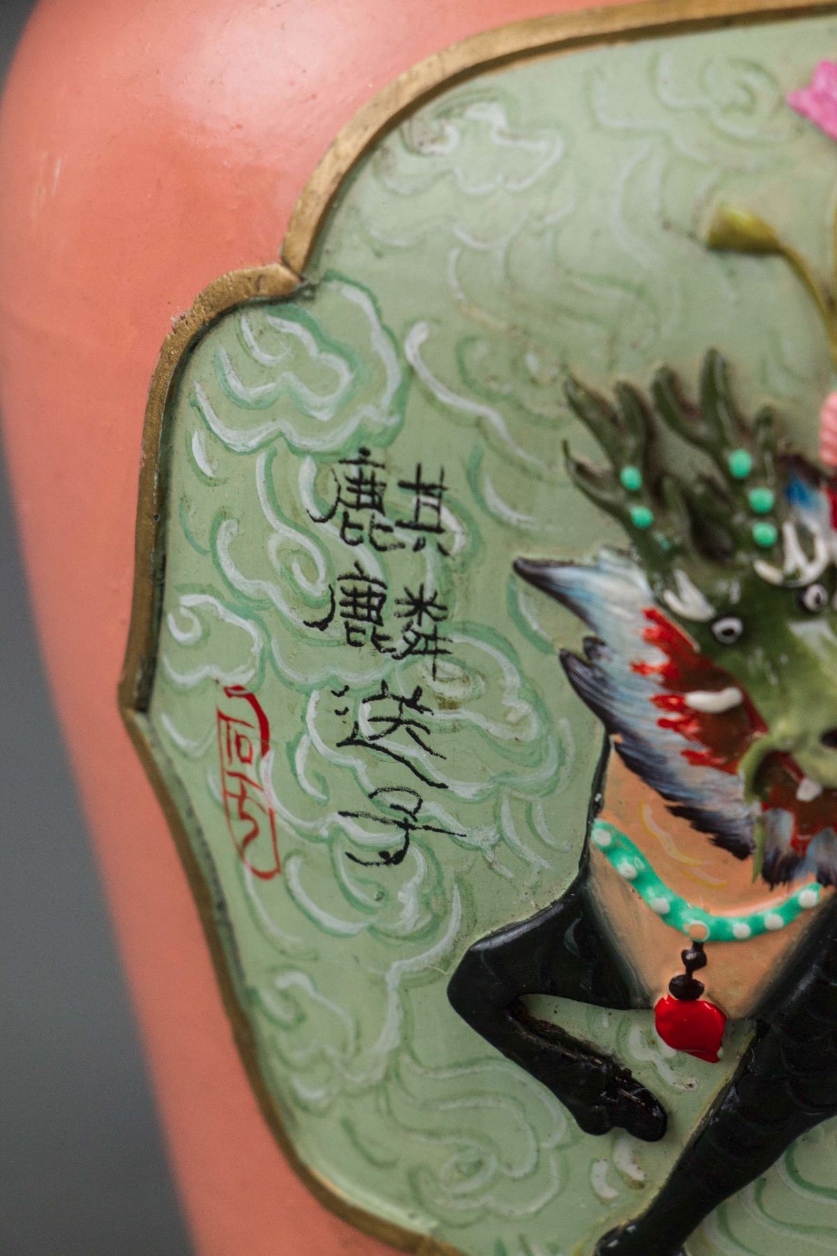 Chinese gilt porcelain vase; of ovoid form body; carved with kid and kirin; with artist mark; painted with colourful glaze; H: 17 cm, D: 13 cm, 796 grams
