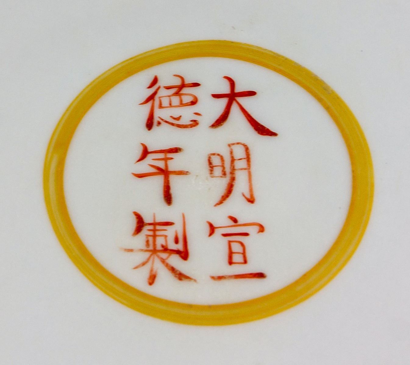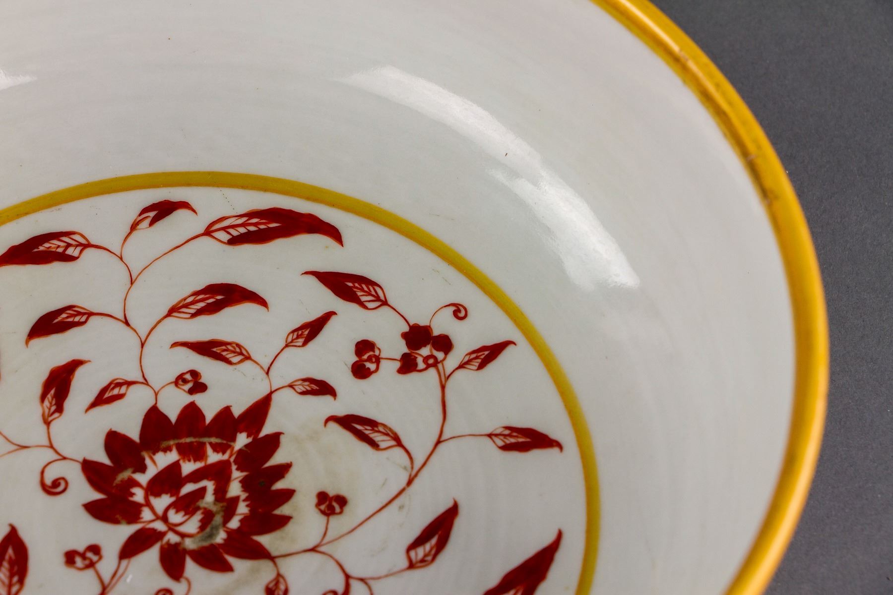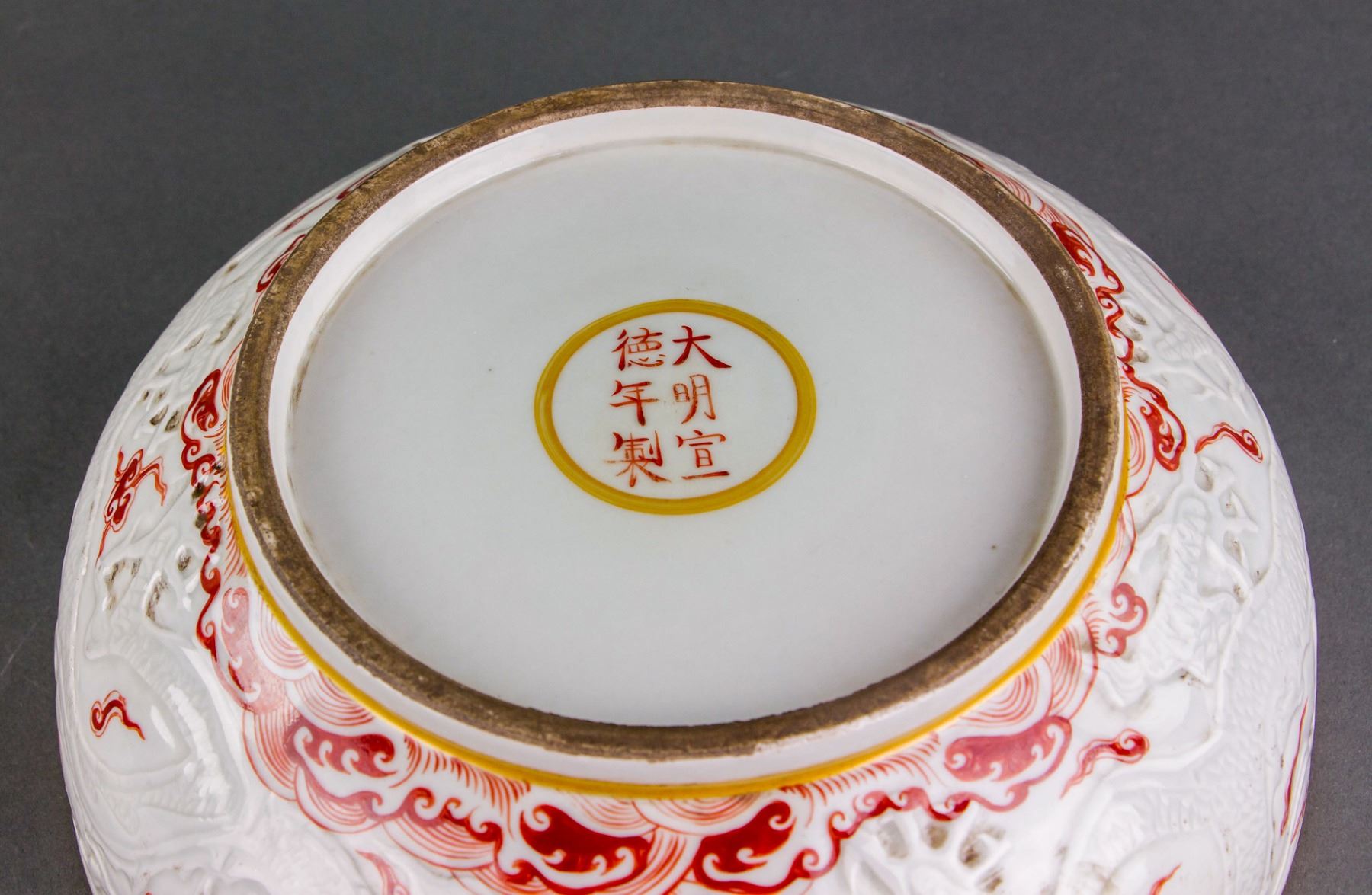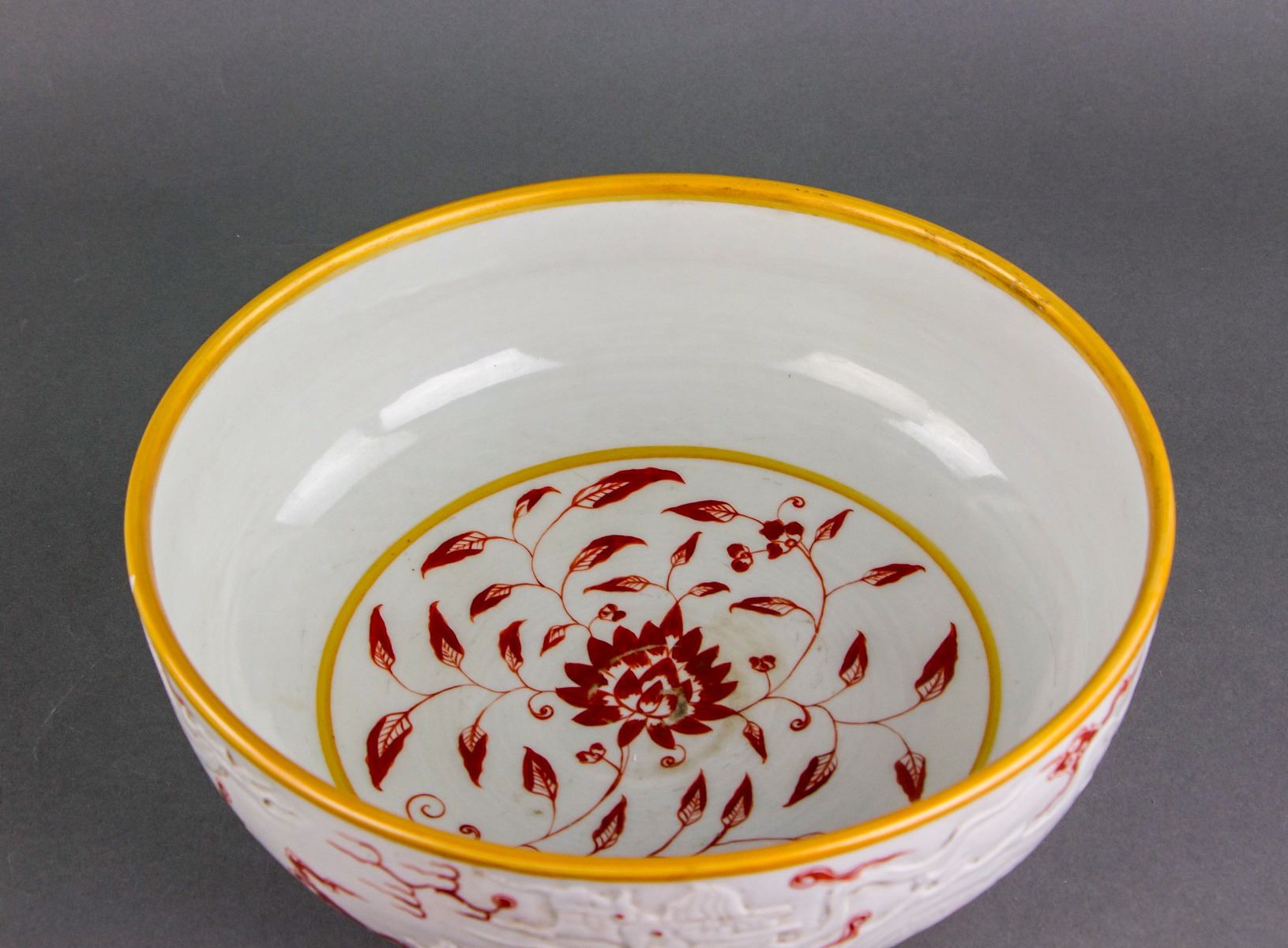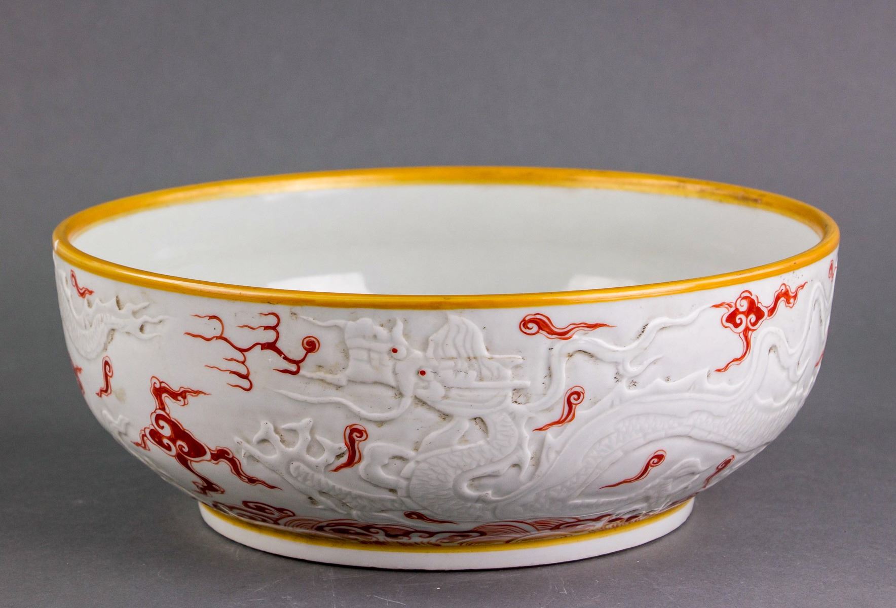 Chinese large gilt porcelain basin; of rounded edge, tapering to bottom; supported on short foot rim; carved with dragon; painted with fireballs on outside; painted with flower inside; six-character Xuande mark on base; H: 11 cm, L: 27 cm, 1428 grams