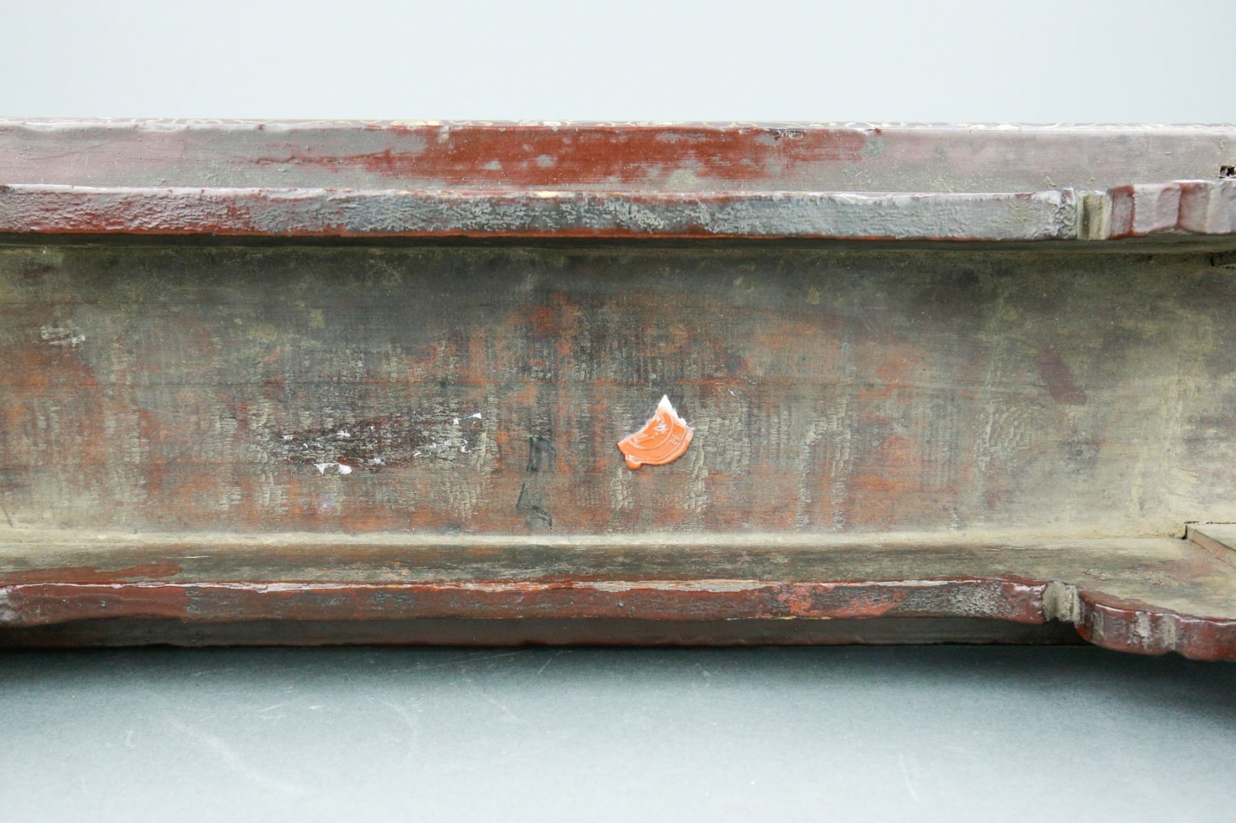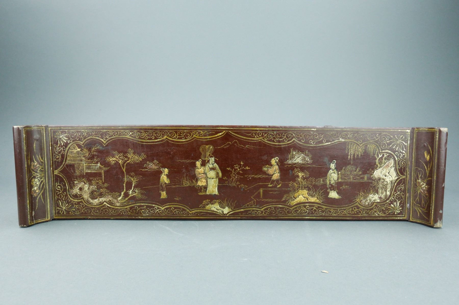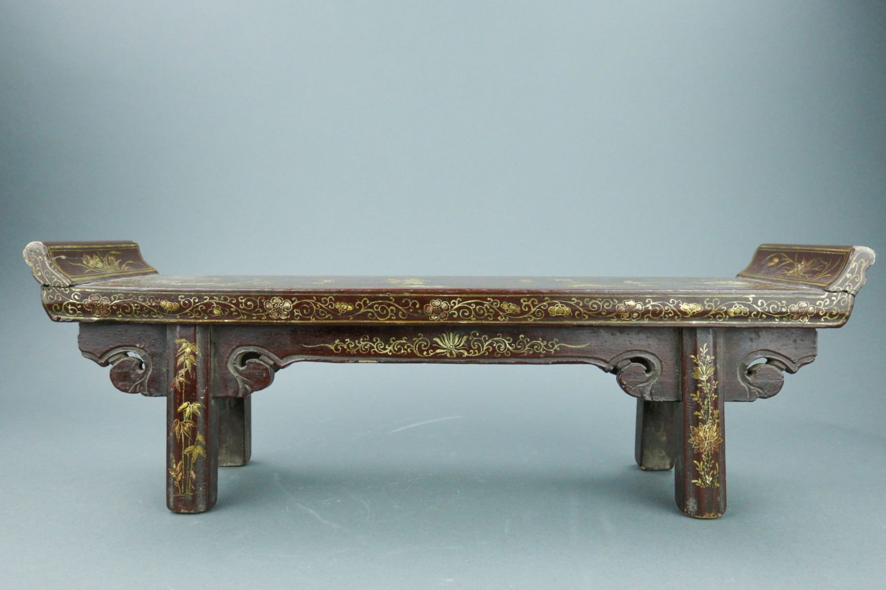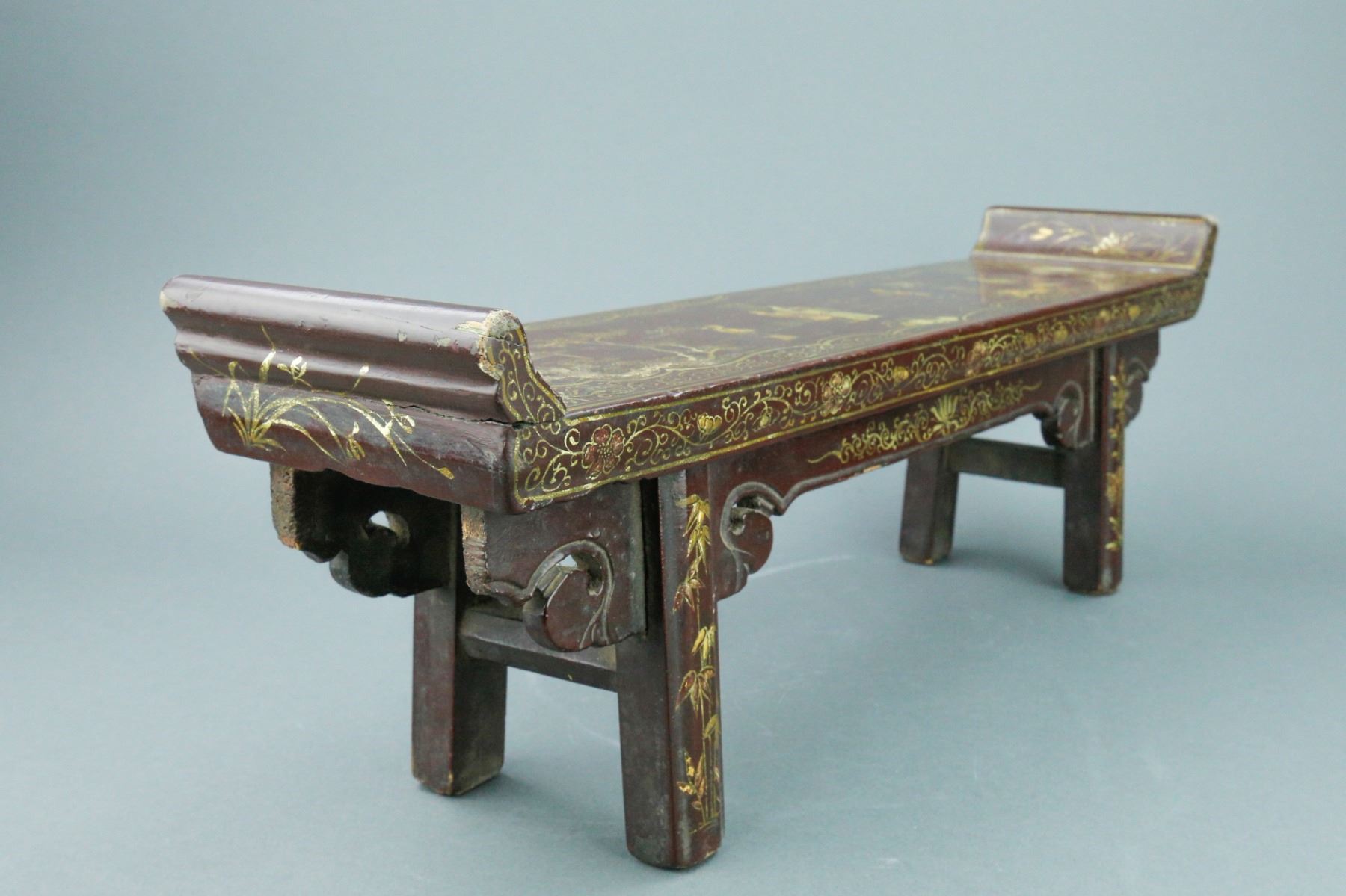 Chinese wood carved altar table; supported by four legs and low lying; features lacquered finish and gilt incised figural courtyard scene; Four Noble Ones (bamboo, chrysanthemum, orchid, plum blossom) featured on legs; H: 17 cm, W: 50.5 cm, 1255 grams