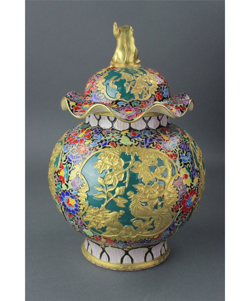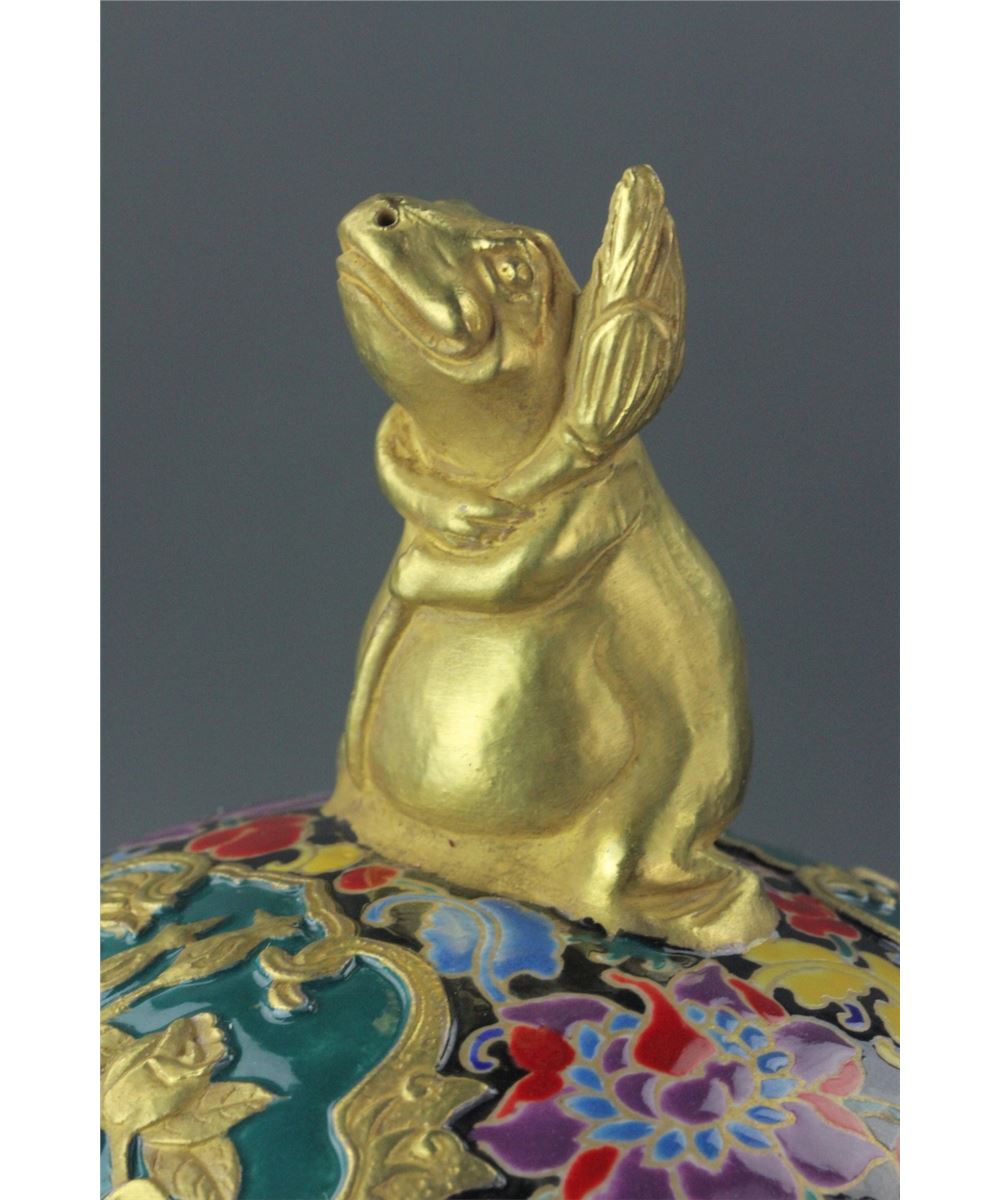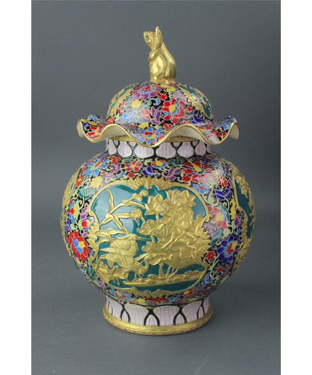 Chinese gilt porcelain jar; of globular body tapering to slight flared foot rim; dome-like cover with foliate rim and toad-shaped handle; featuring animals and plants on floral scrollwork ground; six-character Qianlong mark on base; H: 32 cm, D: 23 cm, 3262 grams
