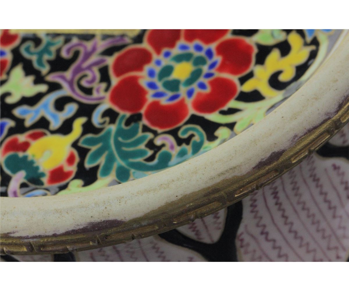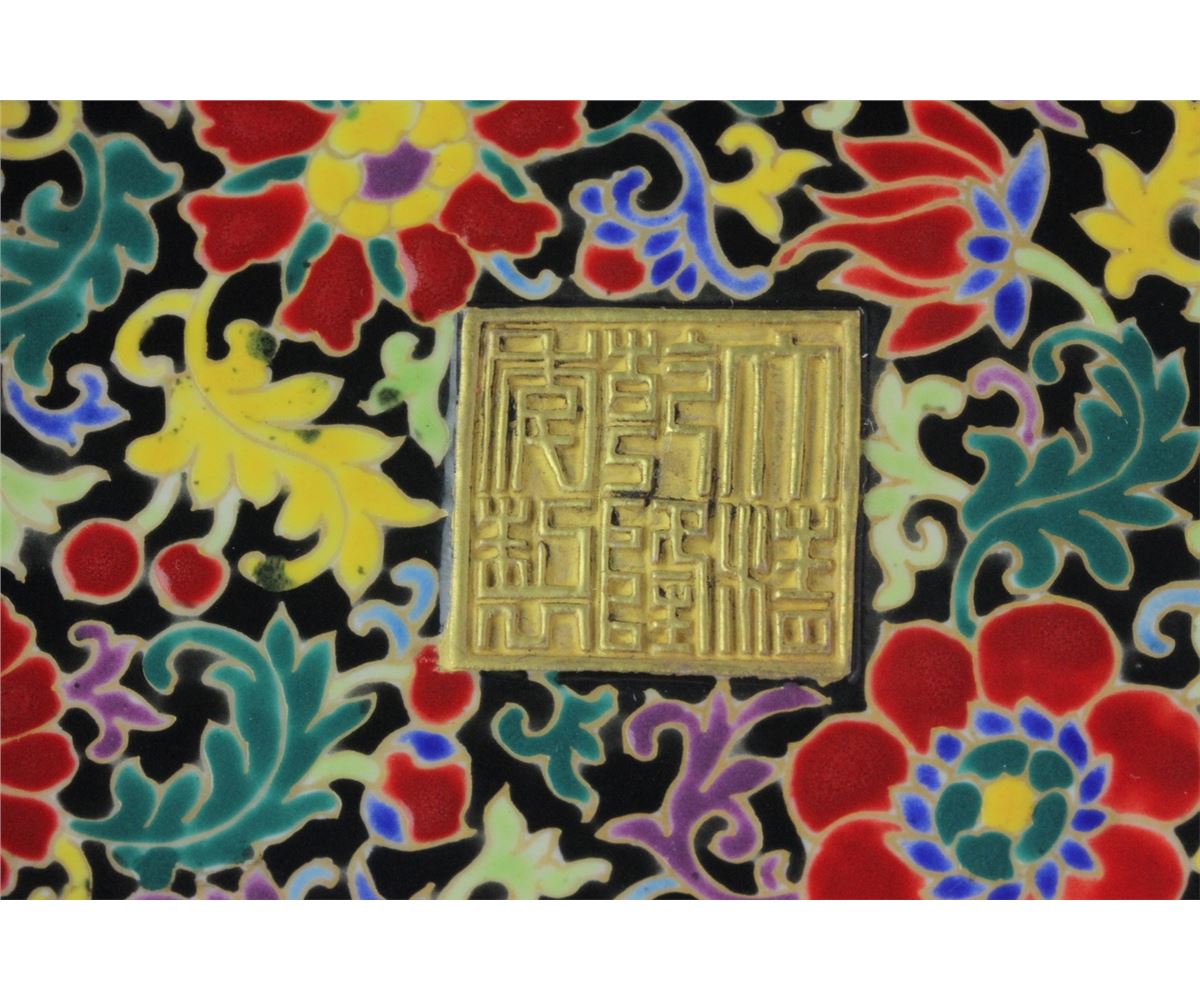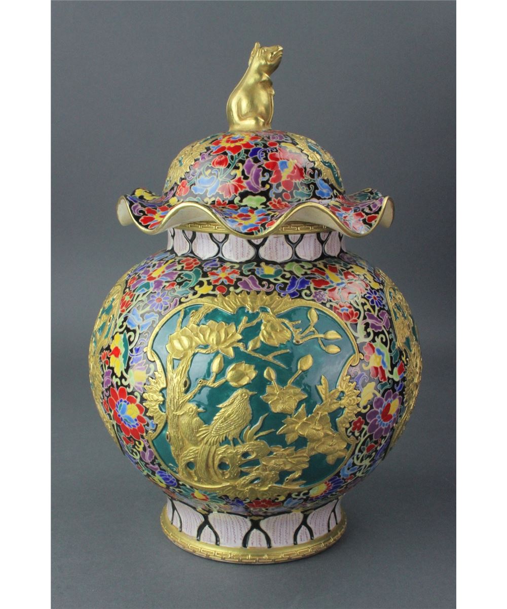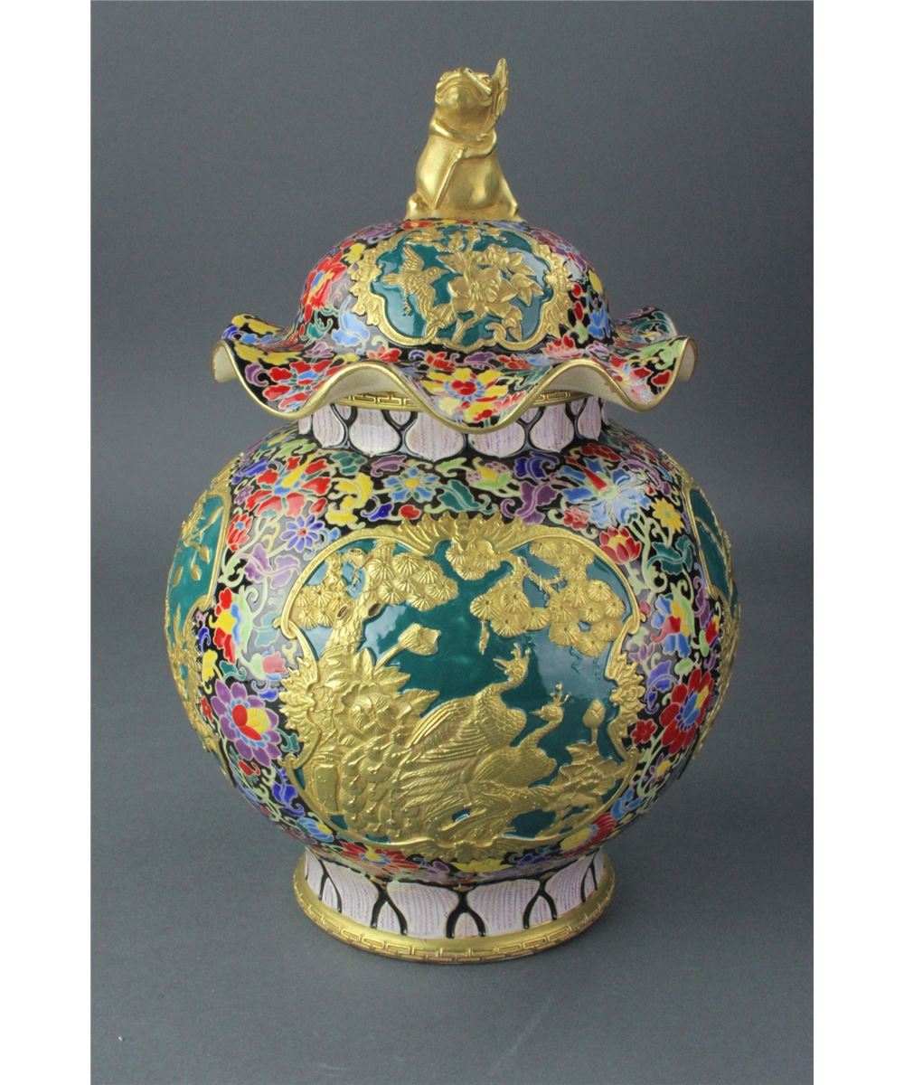 Chinese gilt porcelain jar; of globular body tapering to slight flared foot rim; dome-like cover with foliate rim and toad-shaped handle; featuring animals and plants on floral scrollwork ground; six-character Qianlong mark on base; H: 32 cm, D: 23 cm, 3262 grams