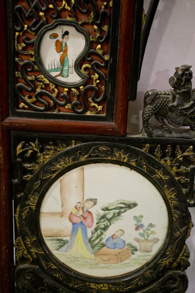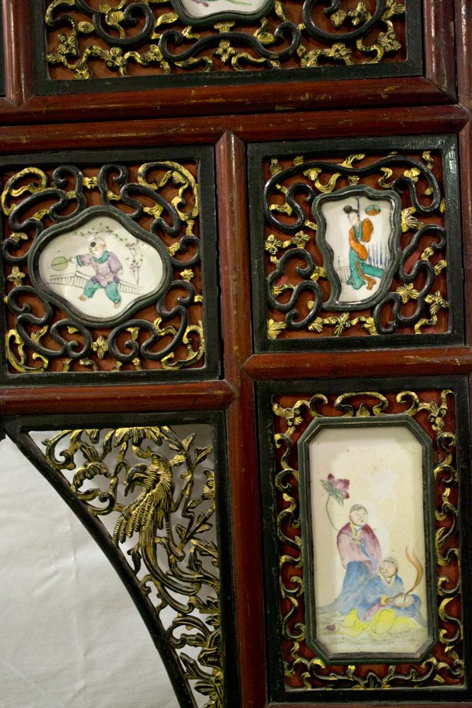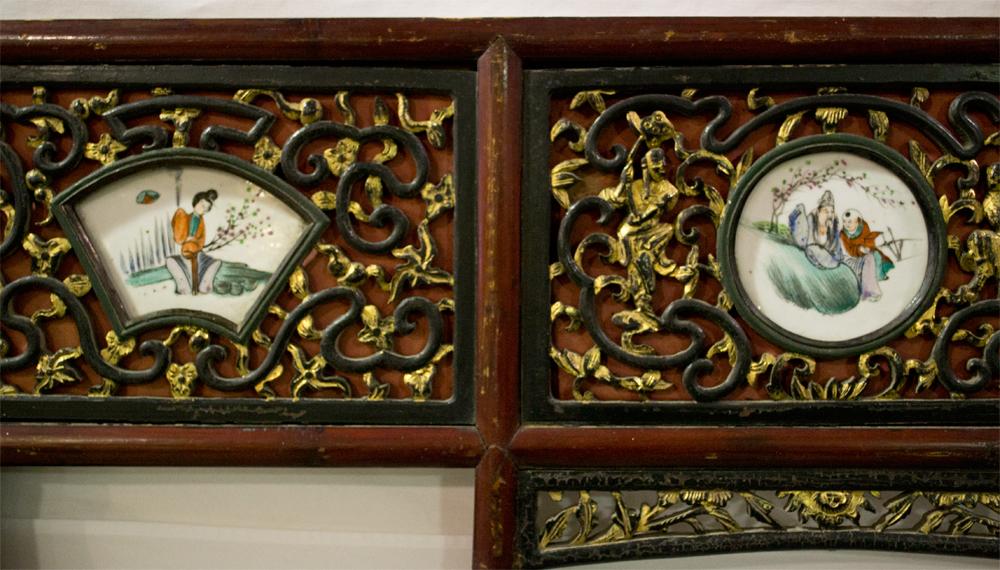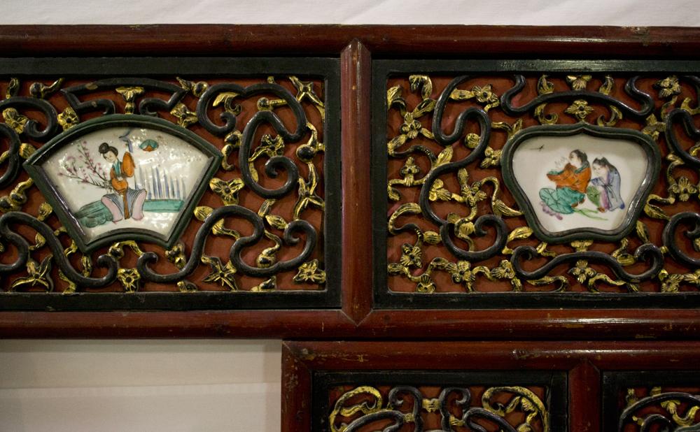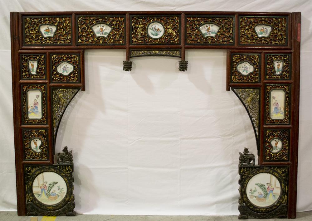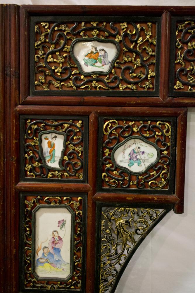 A finely carved giltwood and painted bedframe with carved dragons with riders inset with fifteen hand painted porcelain plaques in various forms all finely painted in the Famille rose palette some plaques in large circular form some in shape of fans largest plaques measure 10"D overall dimensions are 81"W X 60"H circa 19th century.