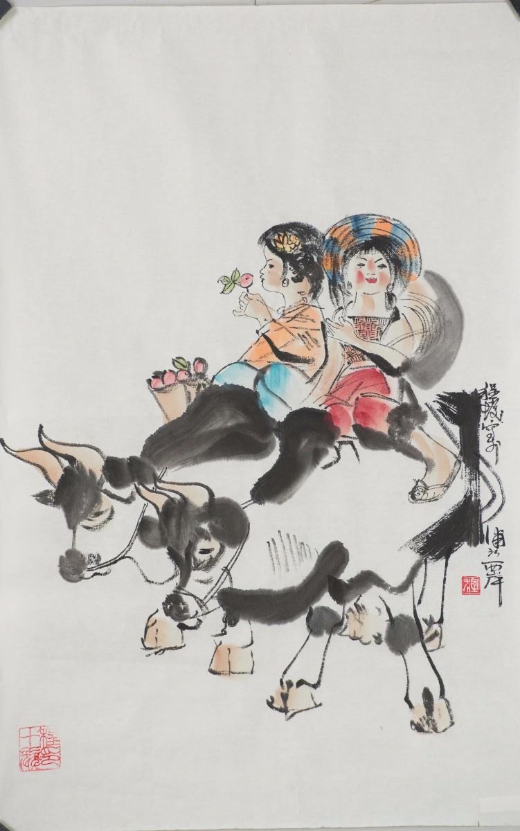 Chinese girls riding on cows, Chinese ink and watercolour on paper, style of Cheng Shifa. 69 cm x 45 cm