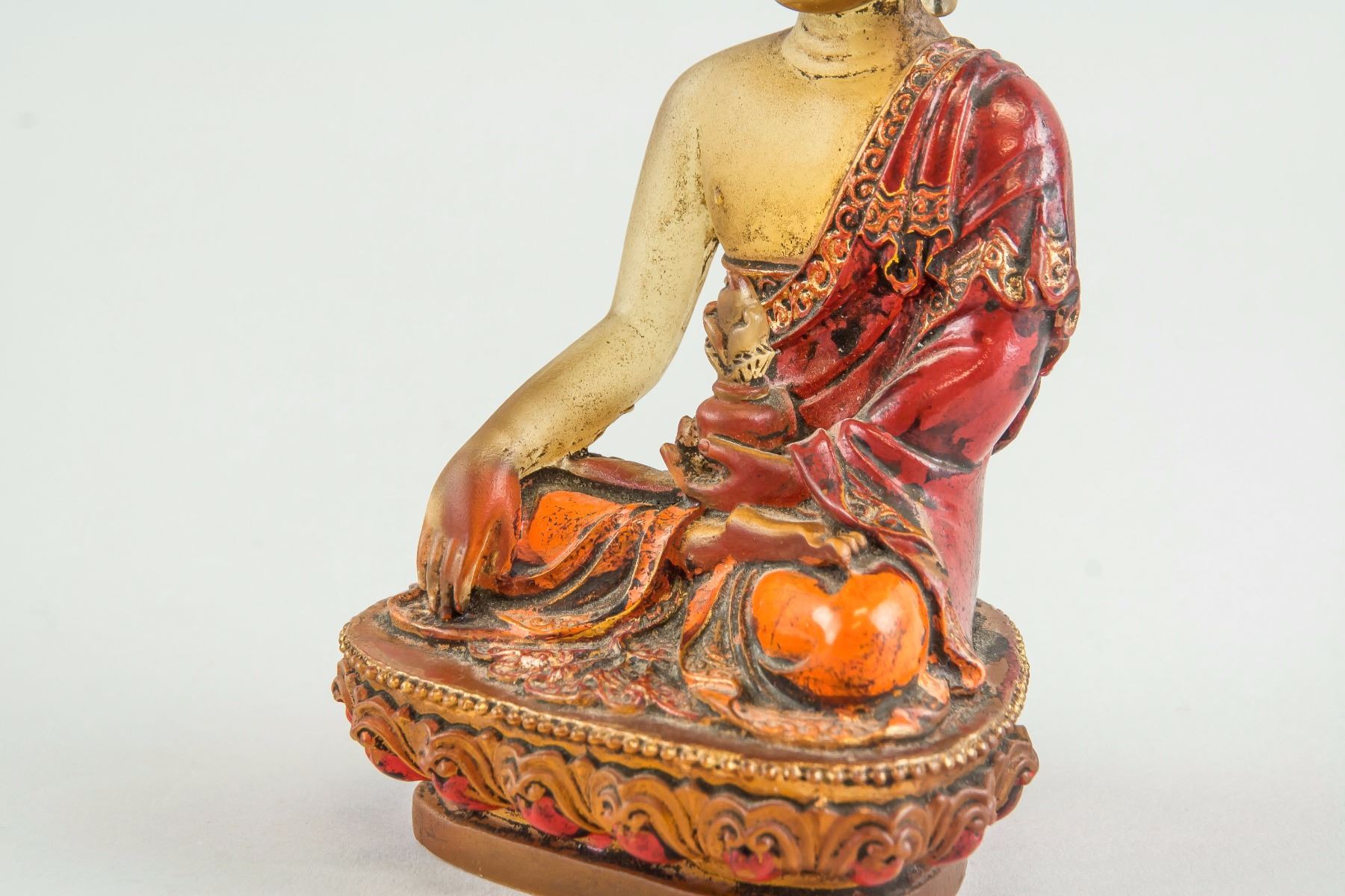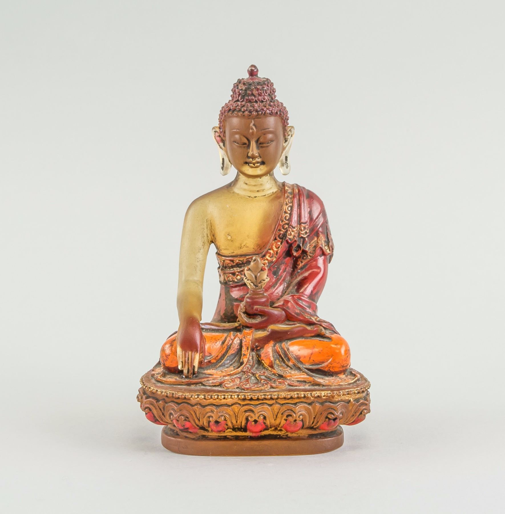 Chinese glass carved Buddha statue; depicting seated Shakyamuni Buddha on lotus pedal base; left hand with meditation mudra and right hand with earth witness mudra; Qing Dynasty (1644-1912); 9 cm x 13 cm, 496 grams