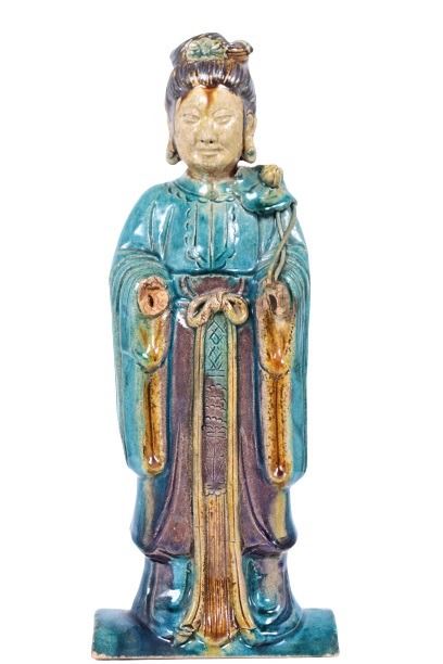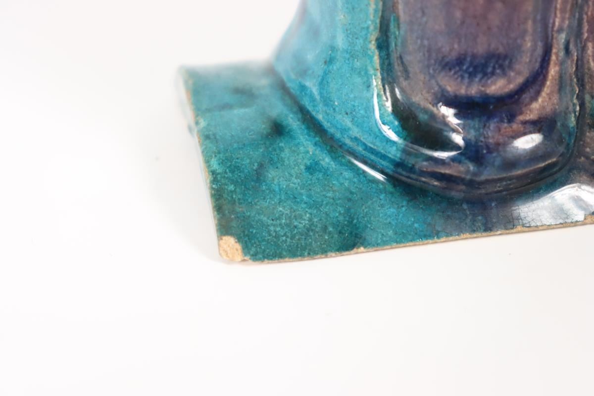 Chinese Glazed Ceramic Figural Roof Tile. This piece depicts a tall female figure in blue. This piece is damaged as the hands are broken, this can be seen in the images. Besides this, the piece is in overall great condition and the glaze is clean.