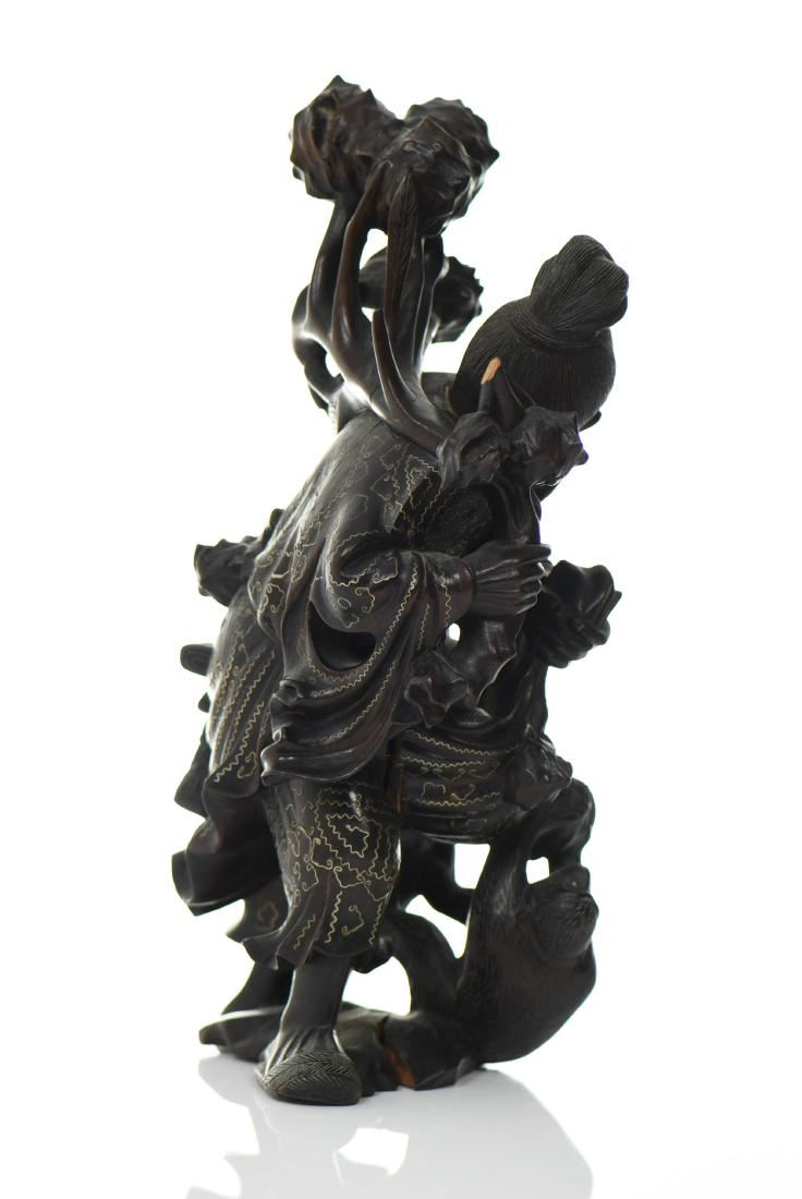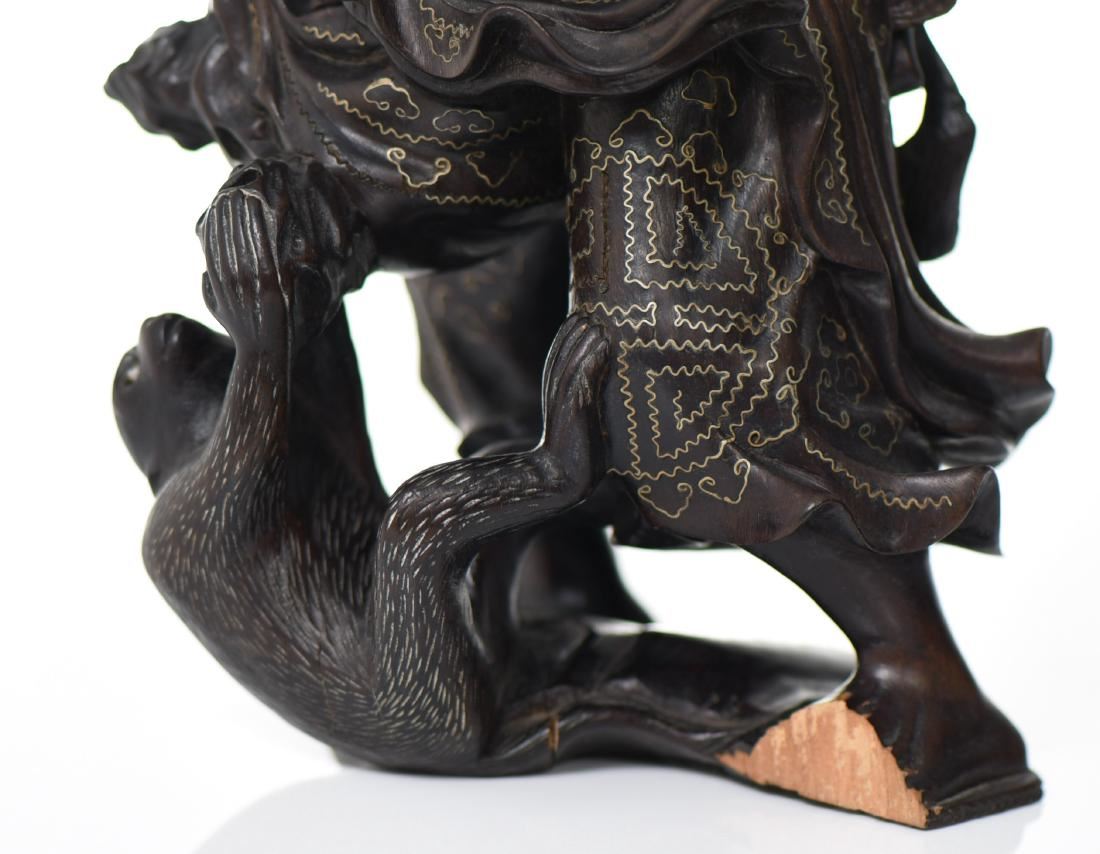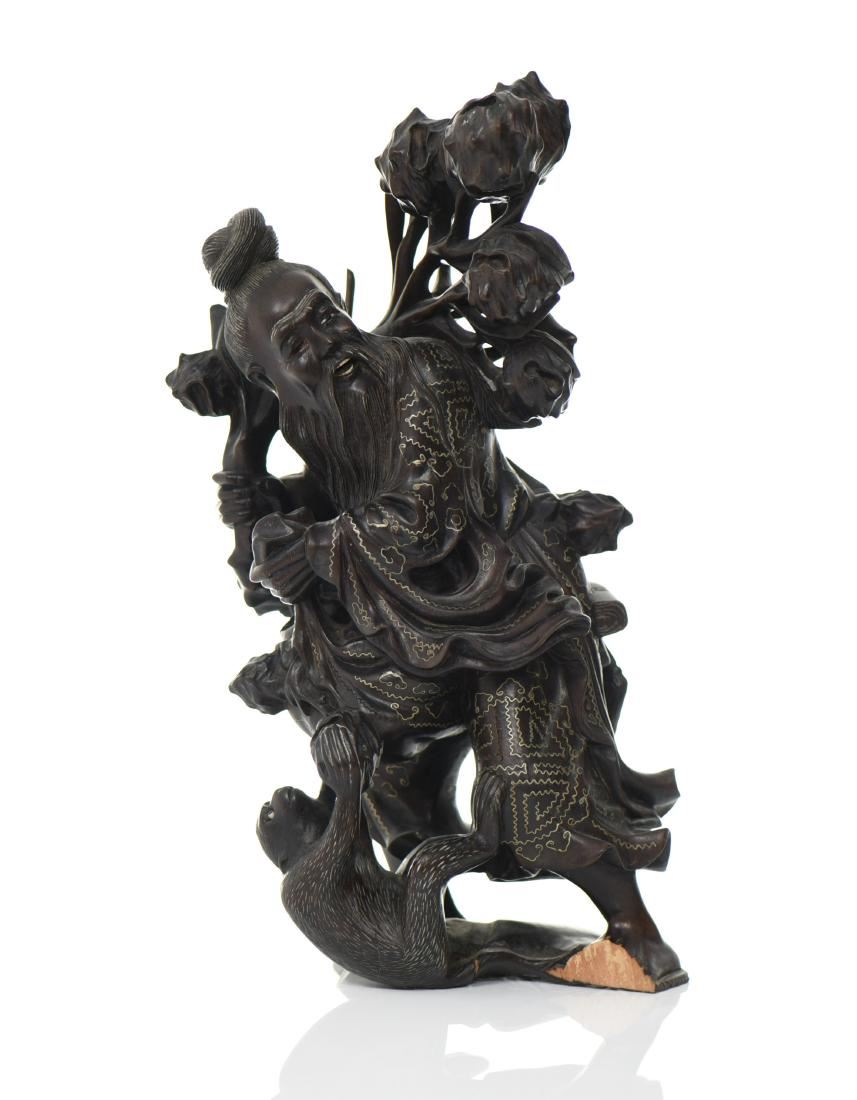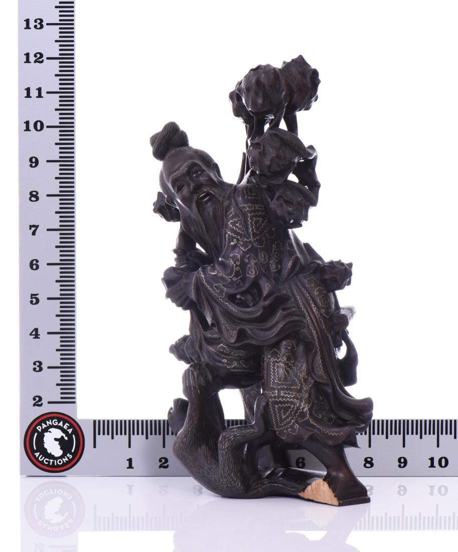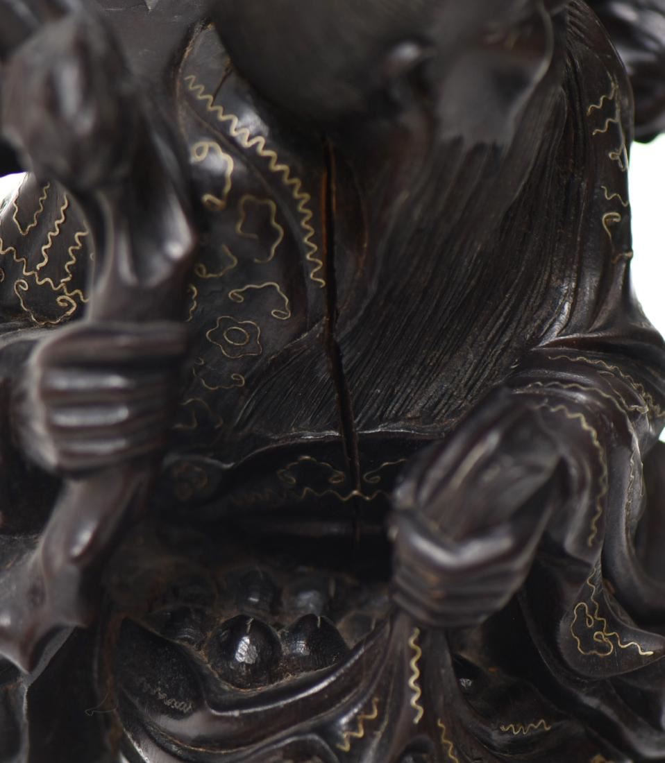 Chinese God Holding Pomegranate Branches With A Monkey Trying To Steal Fruit. Exquisite Hand Carved Black Patina Wood With Intricate Silver Wire Pattern Throughout The Robe. Details Of Glass Eyes And Bone Teeth, With A Wide Eyed Monkey Trying To Steal Some Fruit. Condition Report: Broken Left Foot And Branch That Makes For A Simple Repair. Estimated more than 50 yrs old. Chinese art is visual art that, whether ancient or modern. Early "stone age art" dates back to 10,000 BC, mostly consisting of simple pottery and sculptures. Chinese art has arguably the oldest continuous tradition in the world. Traditional Chinese painting involves essentially the same techniques as Chinese calligraphy and is done with a brush dipped in black or colored ink. As with calligraphy, the most popular materials on which paintings are made of paper and silk. Chinese ritual sculptures from the Shang and Western Zhou Dynasties come from a period of over a thousand years from c. 1500 and were cast with complex patterns and zoomorphic decoration, but avoid the human figure. Smaller figures in pottery or wood were placed in tombs for many centuries afterwards, reaching a peak of quality in the Tang Dynasty. Small Buddhist figures and groups were produced to a very high quality in a range of media, as was relief decoration of all sorts of objects, especially in metalwork and jade. Sculptors of all sorts were regarded as artisans and very few names are recorded. Chinese ceramic ware shows a continuous development since the pre-dynastic periods, and is one of the most significant forms of Chinese art. Most later Chinese ceramics, even of the finest quality, were made on an industrial scale, thus very few individual potters or painters are known. Many of the most renowned workshops were owned by or reserved for the Emperor, and large quantities of ceramics were exported as diplomatic gifts or for trade from an early date. (Wikipedia) Size: See Ruler Photo. (Photos Represent The Condition Of The Lot.)