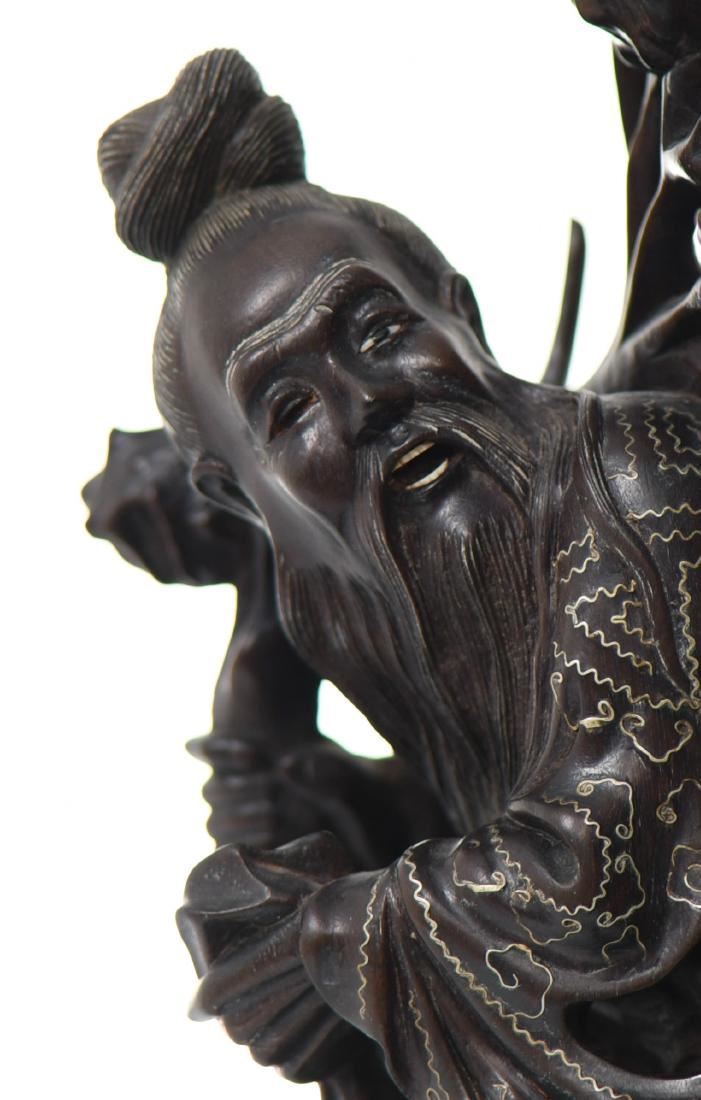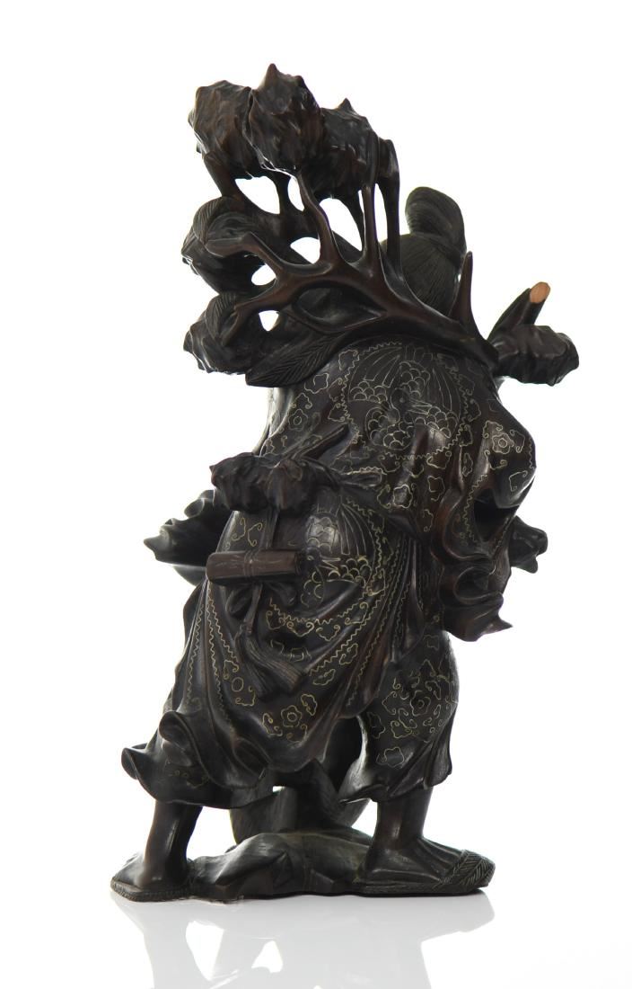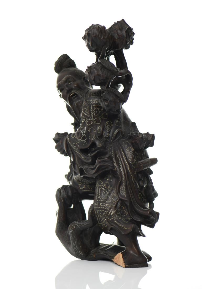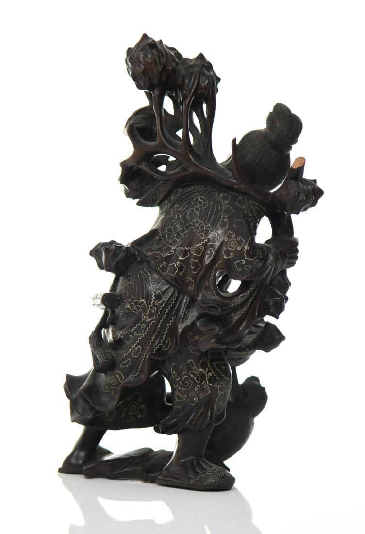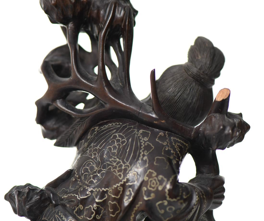 Chinese God Holding Pomegranate Branches With A Monkey Trying To Steal Fruit. Exquisite Hand Carved Black Patina Wood With Intricate Silver Wire Pattern Throughout The Robe. Details Of Glass Eyes And Bone Teeth, With A Wide Eyed Monkey Trying To Steal Some Fruit. Condition Report: Broken Left Foot And Branch That Makes For A Simple Repair. Estimated more than 50 yrs old. Chinese art is visual art that, whether ancient or modern. Early "stone age art" dates back to 10,000 BC, mostly consisting of simple pottery and sculptures. Chinese art has arguably the oldest continuous tradition in the world. Traditional Chinese painting involves essentially the same techniques as Chinese calligraphy and is done with a brush dipped in black or colored ink. As with calligraphy, the most popular materials on which paintings are made of paper and silk. Chinese ritual sculptures from the Shang and Western Zhou Dynasties come from a period of over a thousand years from c. 1500 and were cast with complex patterns and zoomorphic decoration, but avoid the human figure. Smaller figures in pottery or wood were placed in tombs for many centuries afterwards, reaching a peak of quality in the Tang Dynasty. Small Buddhist figures and groups were produced to a very high quality in a range of media, as was relief decoration of all sorts of objects, especially in metalwork and jade. Sculptors of all sorts were regarded as artisans and very few names are recorded. Chinese ceramic ware shows a continuous development since the pre-dynastic periods, and is one of the most significant forms of Chinese art. Most later Chinese ceramics, even of the finest quality, were made on an industrial scale, thus very few individual potters or painters are known. Many of the most renowned workshops were owned by or reserved for the Emperor, and large quantities of ceramics were exported as diplomatic gifts or for trade from an early date. (Wikipedia) Size: See Ruler Photo. (Photos Represent The Condition Of The Lot.)