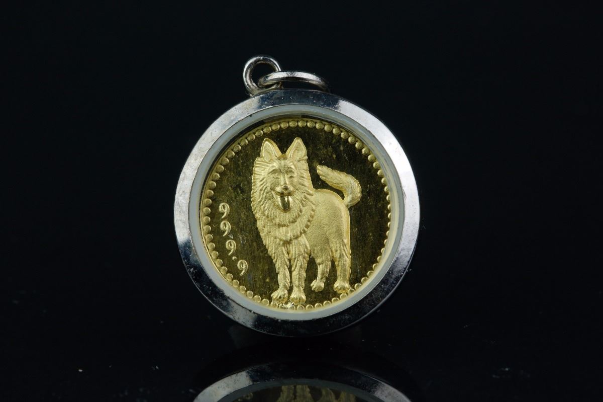 Chinese Year of Dog gold coin; sealed in a case with bail; featuring dog on one side and Fu character on the other side; 999.9 mark on both sides; D: 16 mm, 4 grams