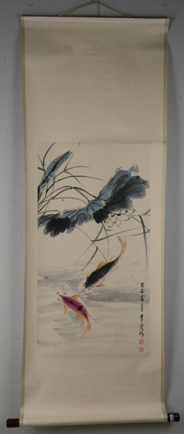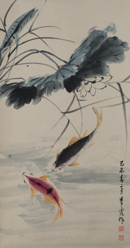 Carps in lotus pond, hanging scroll, Chinese ink and watercolour on paper, signed and sealed; 85 cm x 45 cm