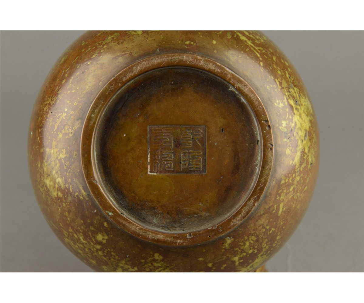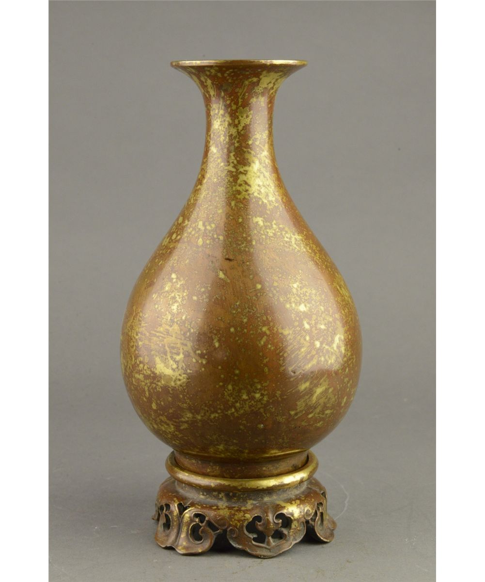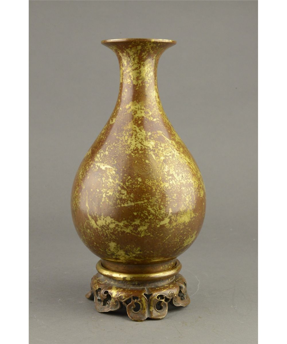 Chinese bronze vase; of ovoid form with gold splashes; custom bronze base with open works motif; bottom with four-character Qianlong reign mark; H: 26 cm, D: 13 cm, 3100 grams