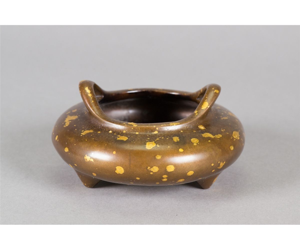Chinese gold-splashed bronze censer; featuring two handles on rim; supported on three feet; Ming Si Shan mark on bottom; H: 6 cm, D: 11 cm, 800 grams