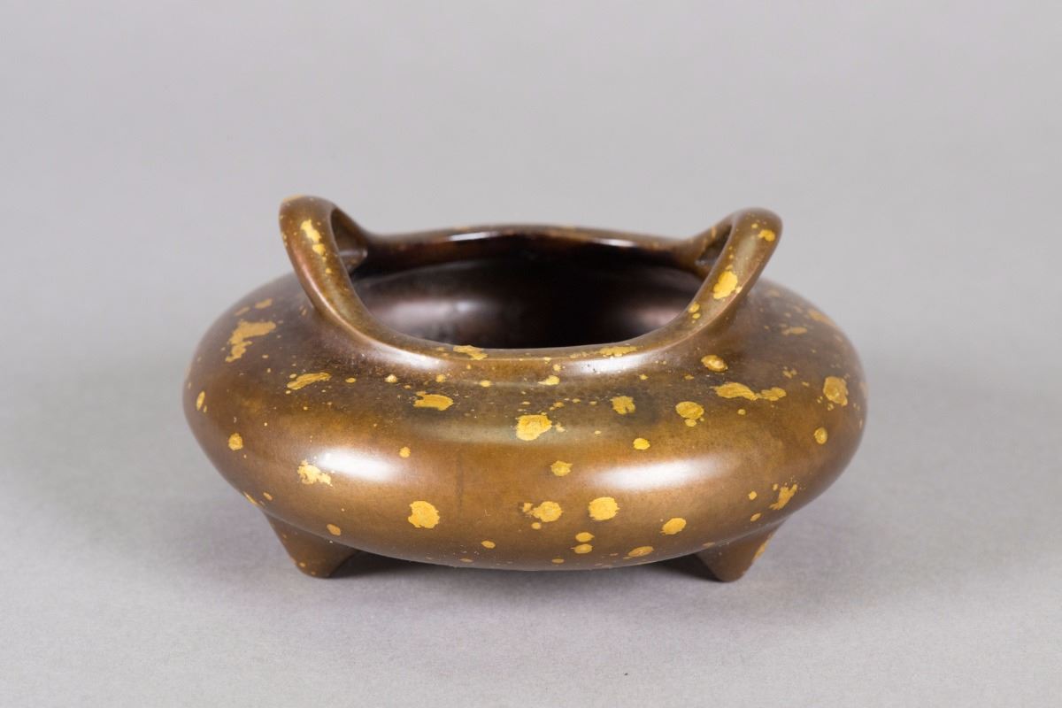 Chinese gold-splashed bronze censer; featuring two handles on rim; supported on three feet; Ming Si Shan mark on bottom; H: 6 cm, D: 11 cm, 800 grams