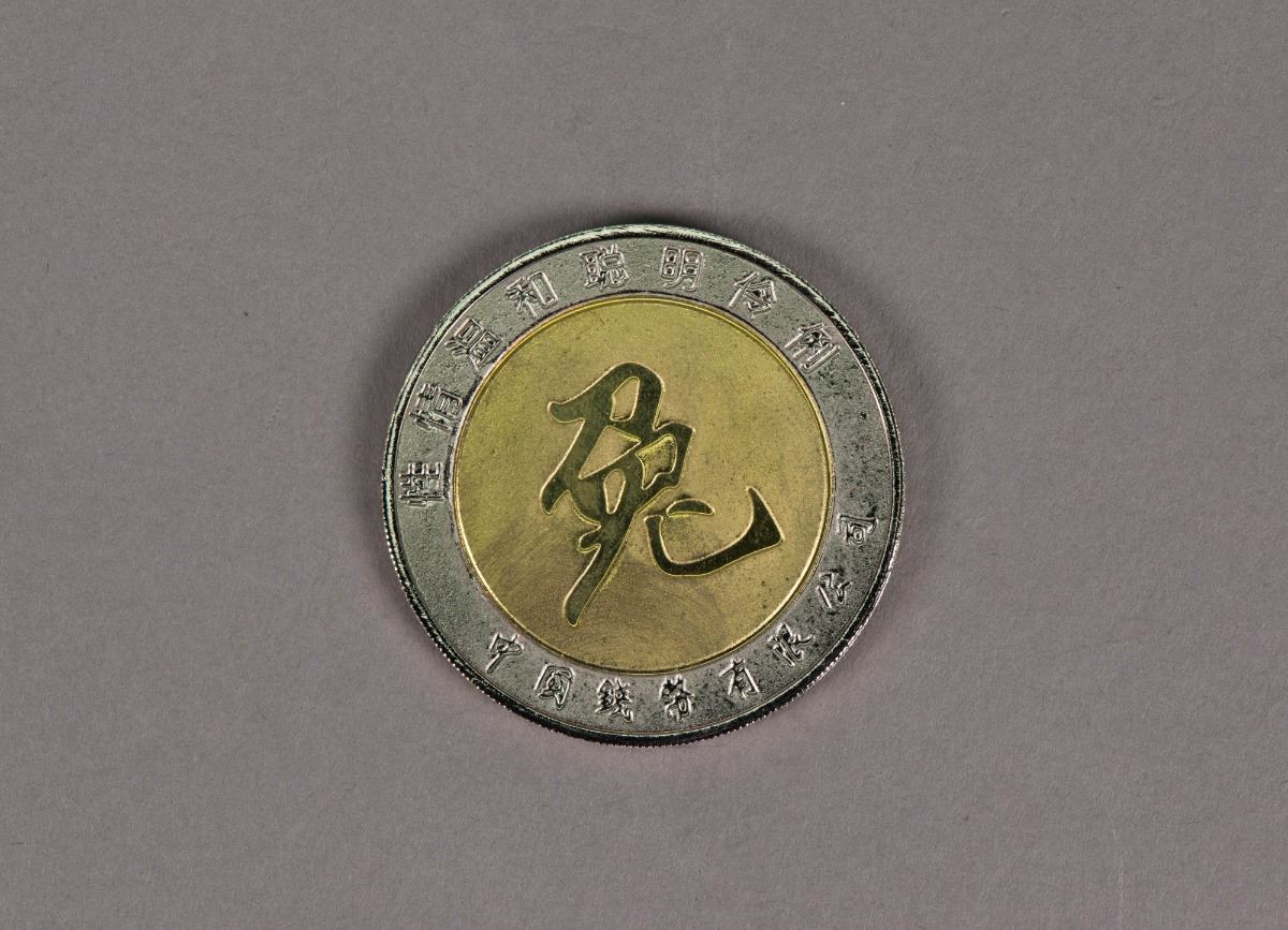 Chinese Rabbit Year commemorative coin; made by China Gold Coin Incorporation; featuring a rabbit drawing by Chinese artist Ma Jin on the front; framed by 12 Chinese characters representing 12 Zodiac animals; D: 4 cm, Thickness: 1.99 mm, 18 grams