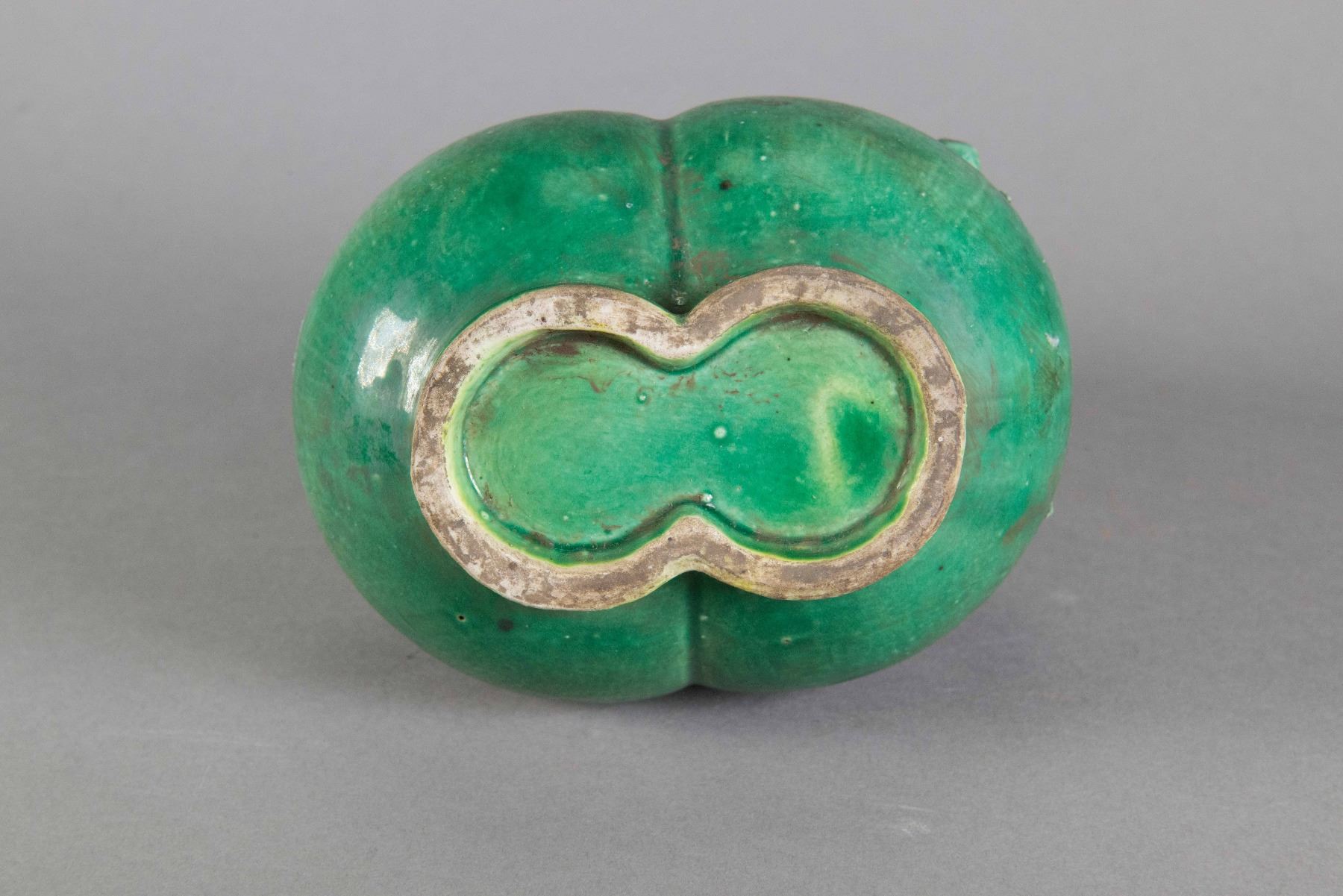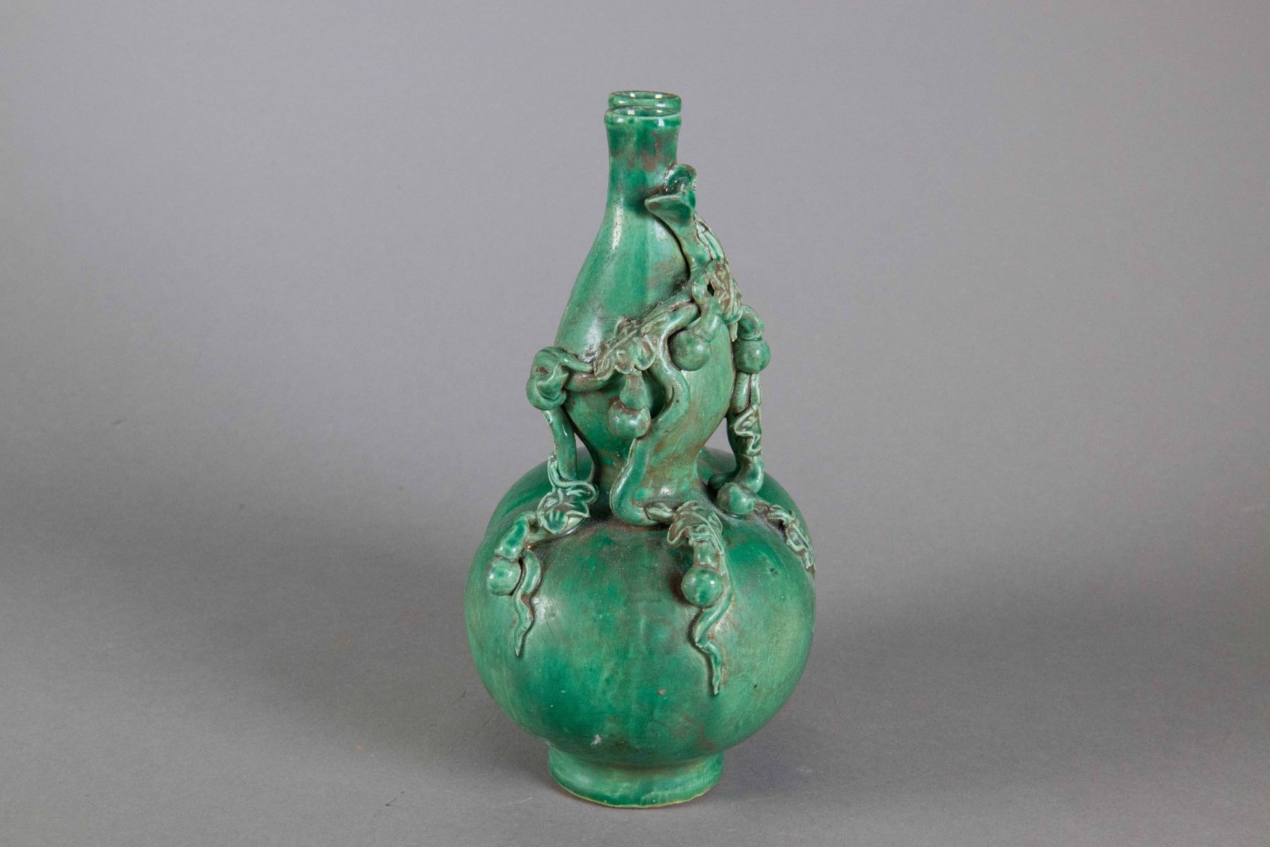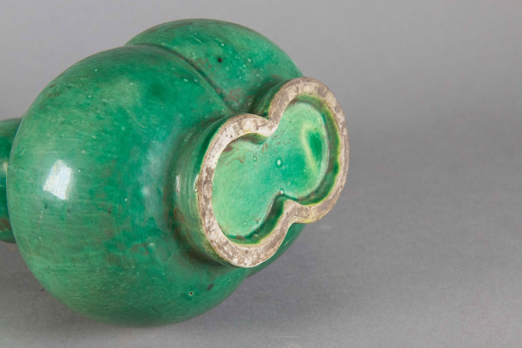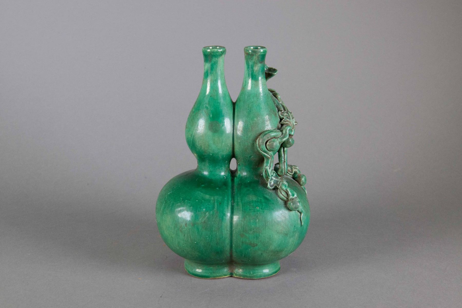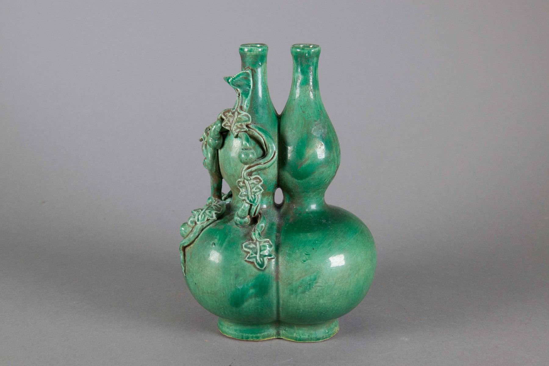 Chinese green glazed double gourd porcelain vase; featuring connected double gourd form with high-relief details of calabash veins; H: 21 cm. W: 14 cm, 773 grams