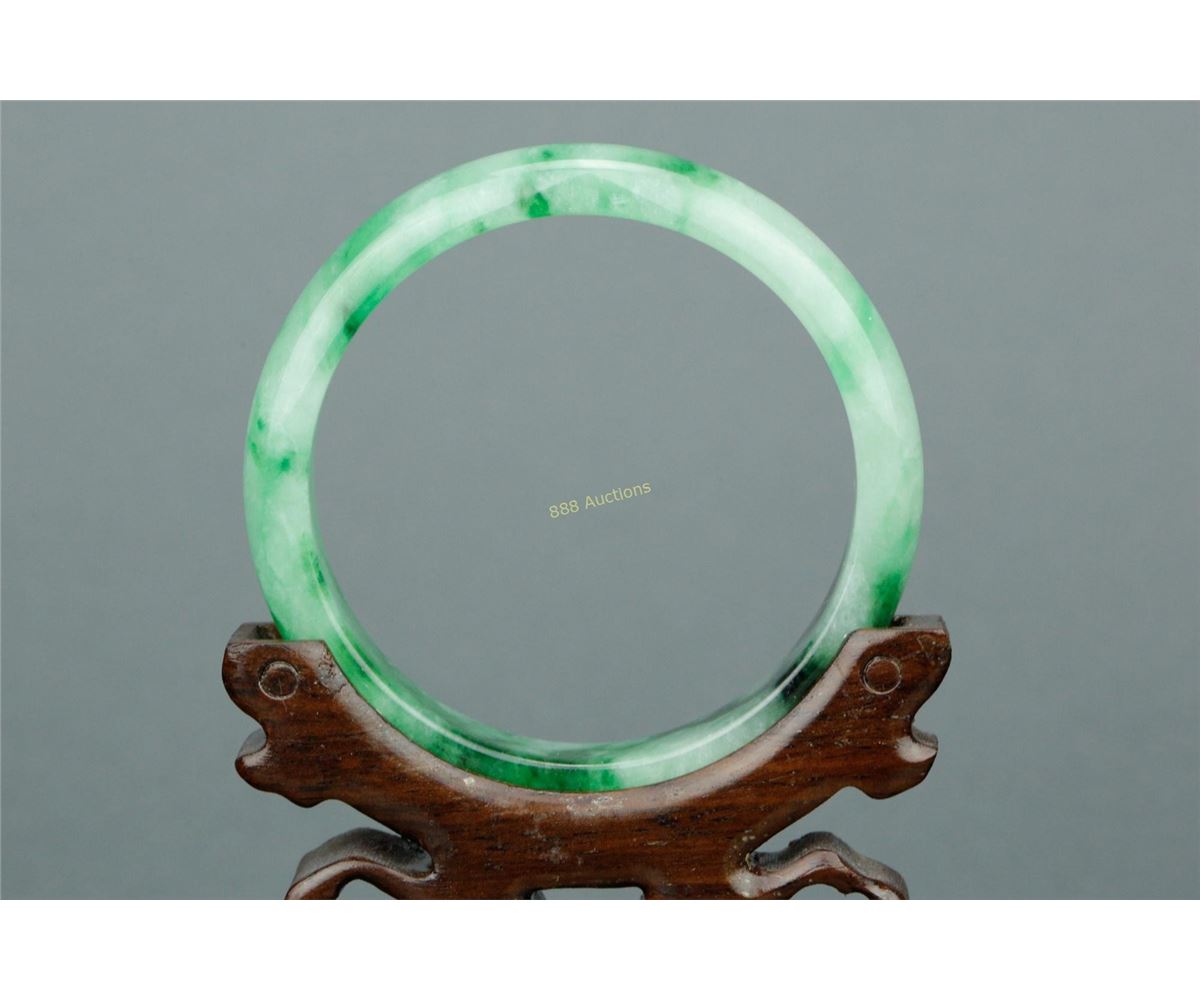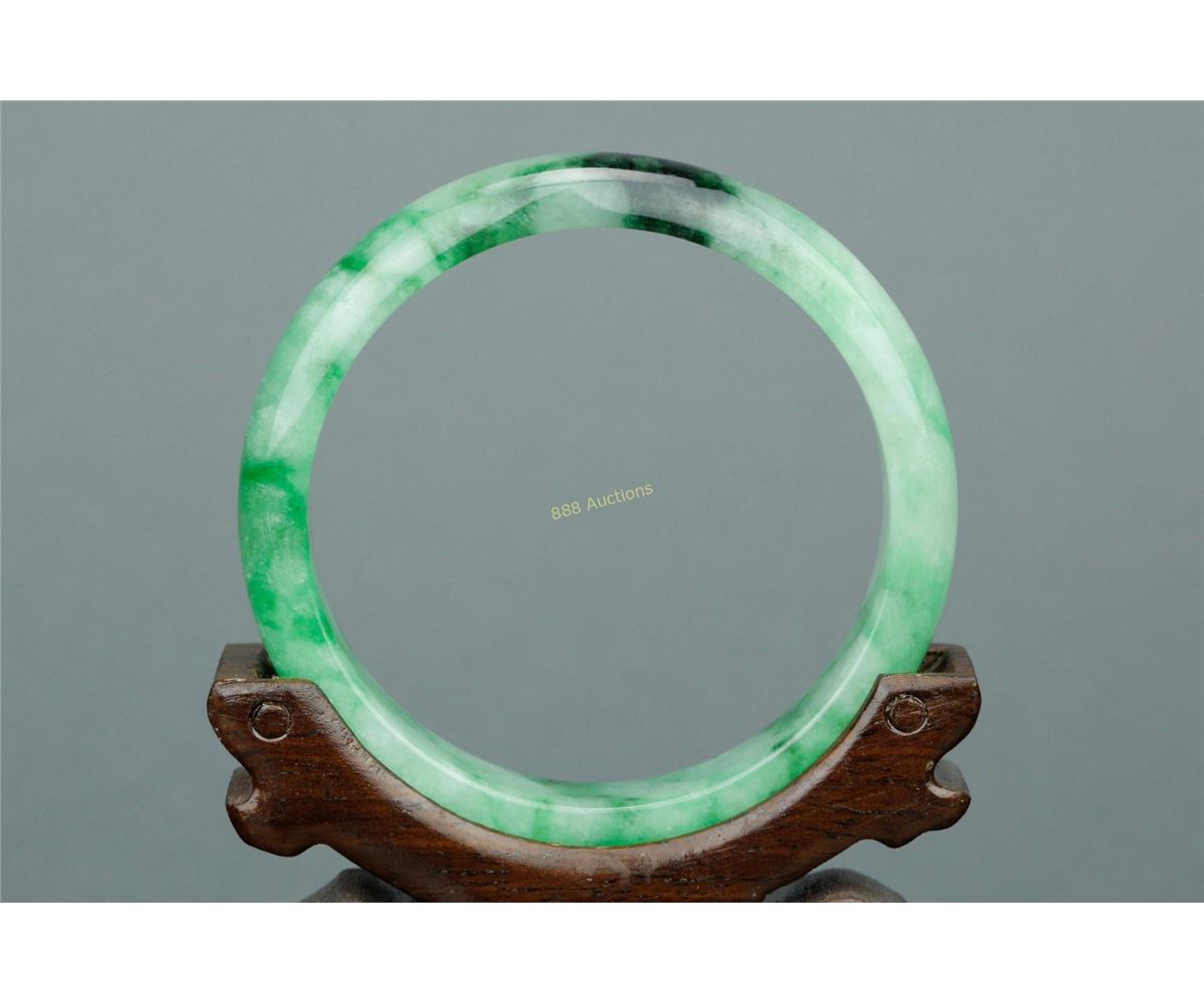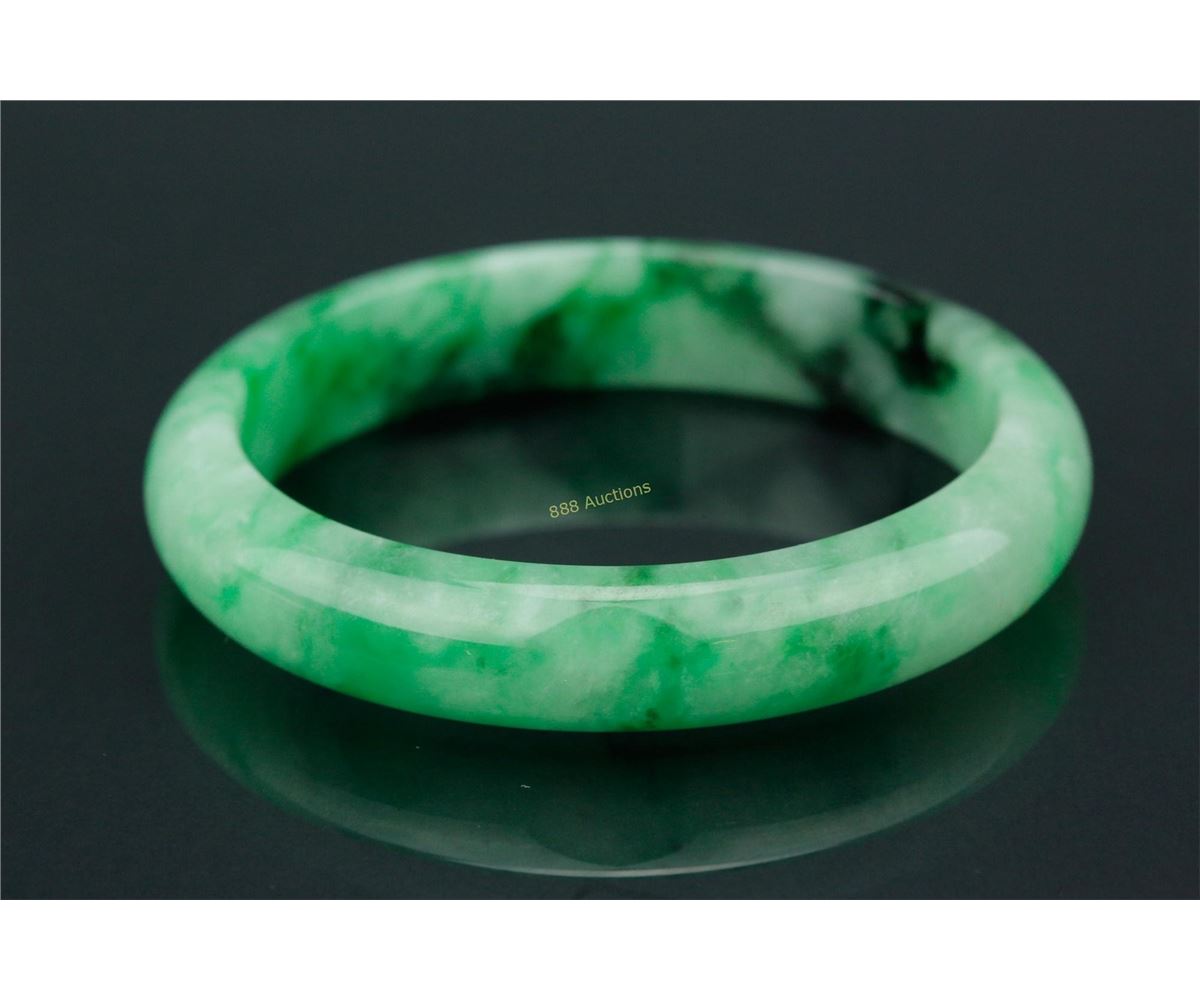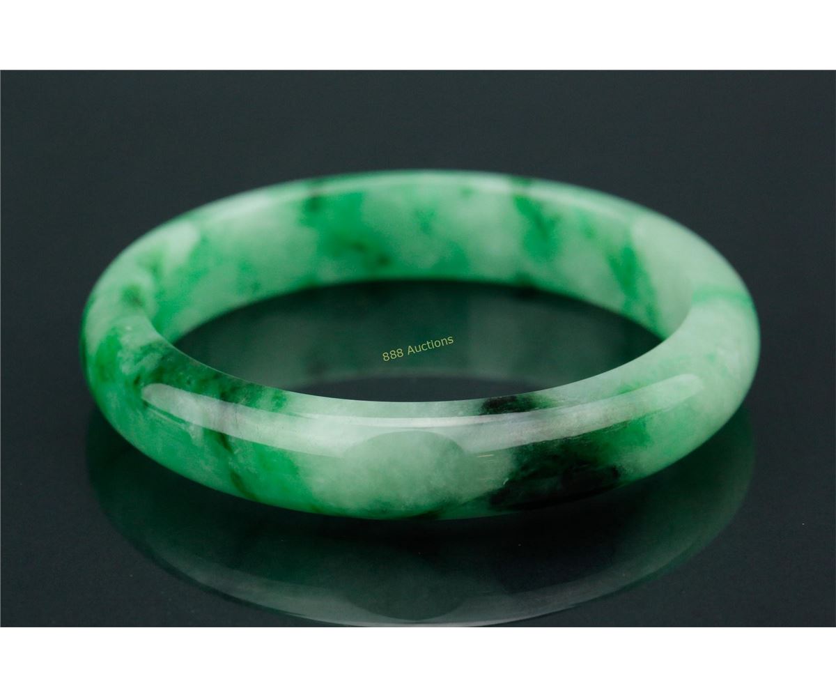 Chinese green hardstone carved bangle; of rounded outside and flatten inside; of white tone with emerald green and spinach green suffusions; D: 6 cm, 49 grams
