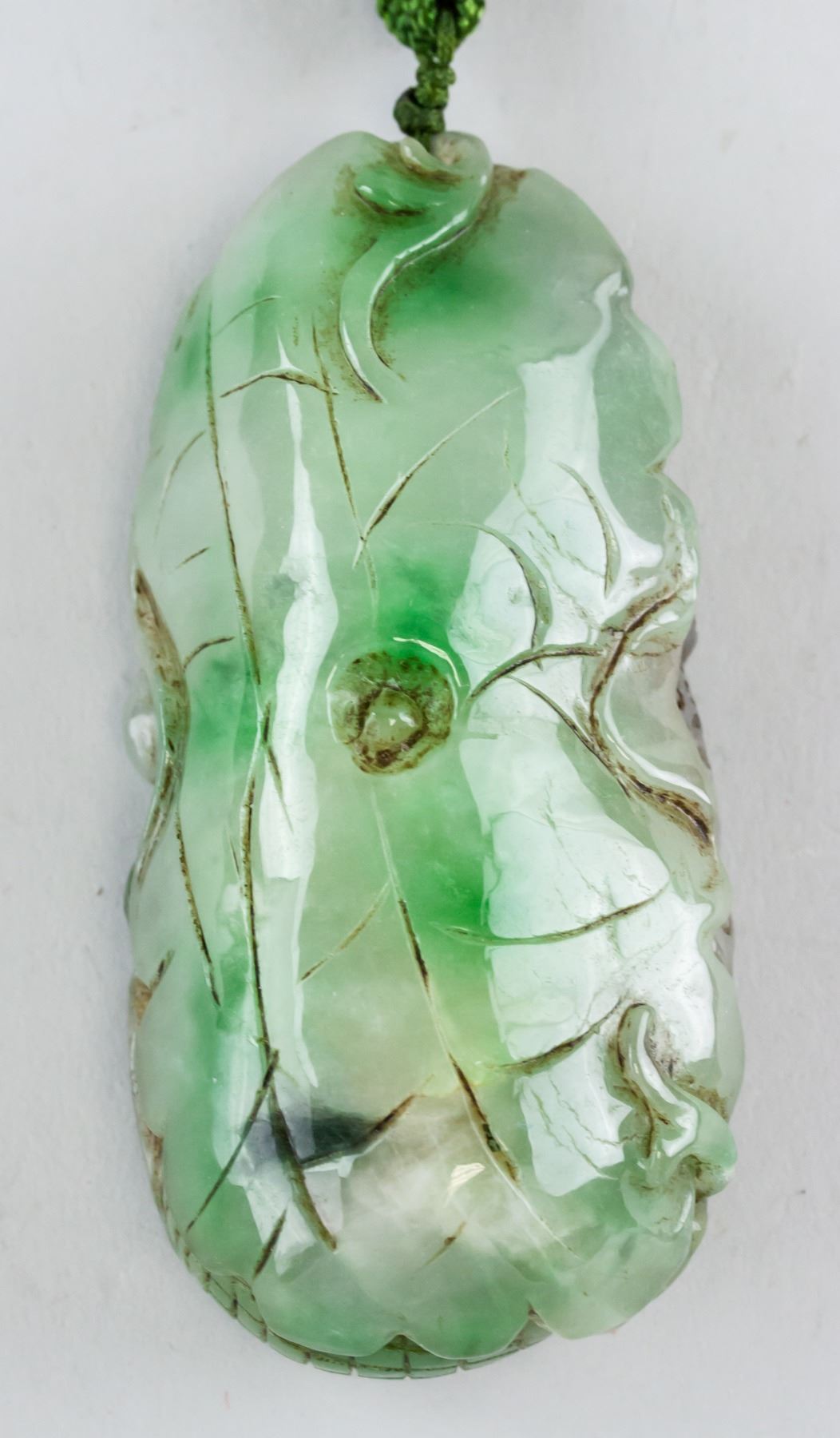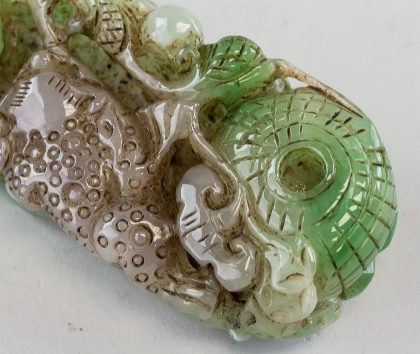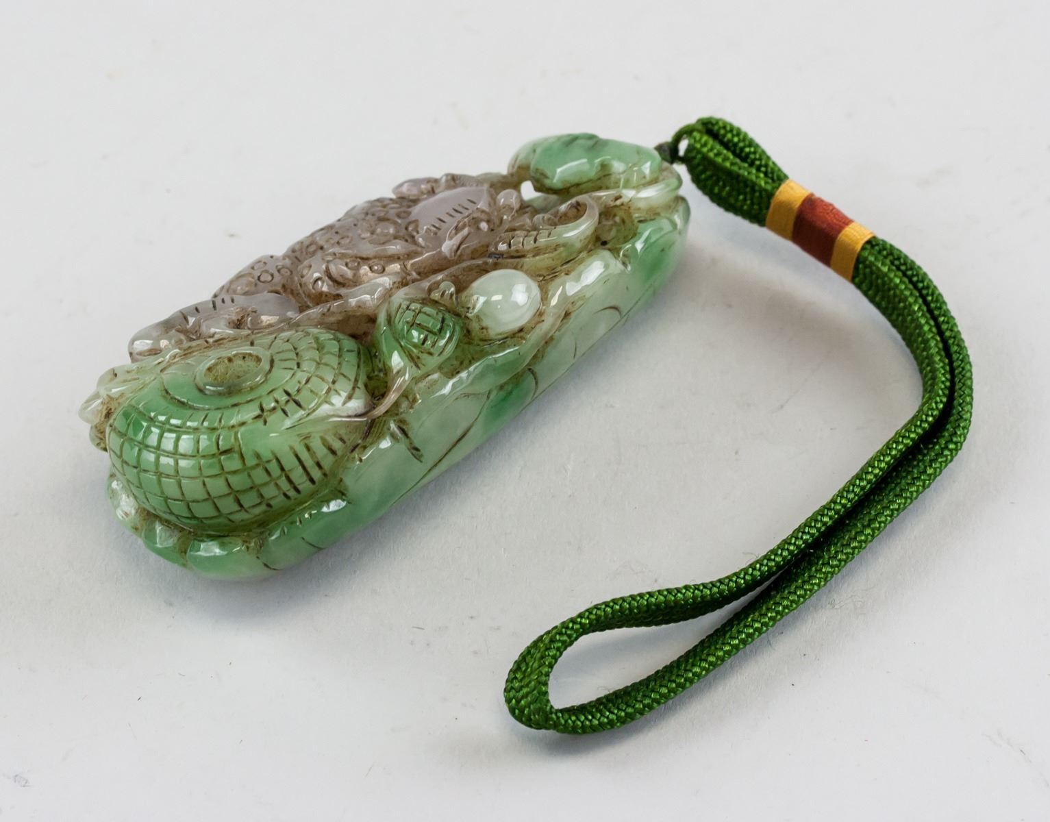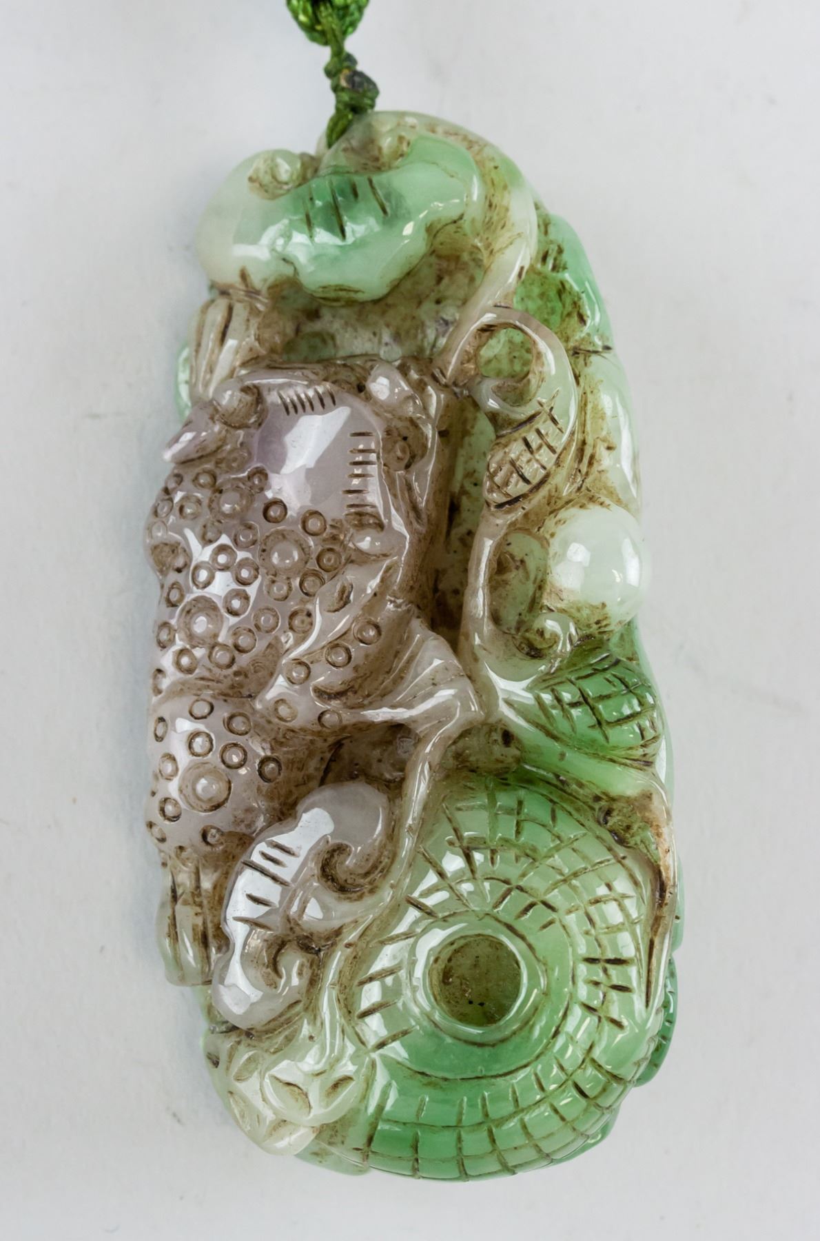 Chinese green and lavender hardstone carved toggle. Featuring Lingzhi and three-leg toad. Pierced for suspension. 10 x 5 cm, 238 grams. Density: 3.19