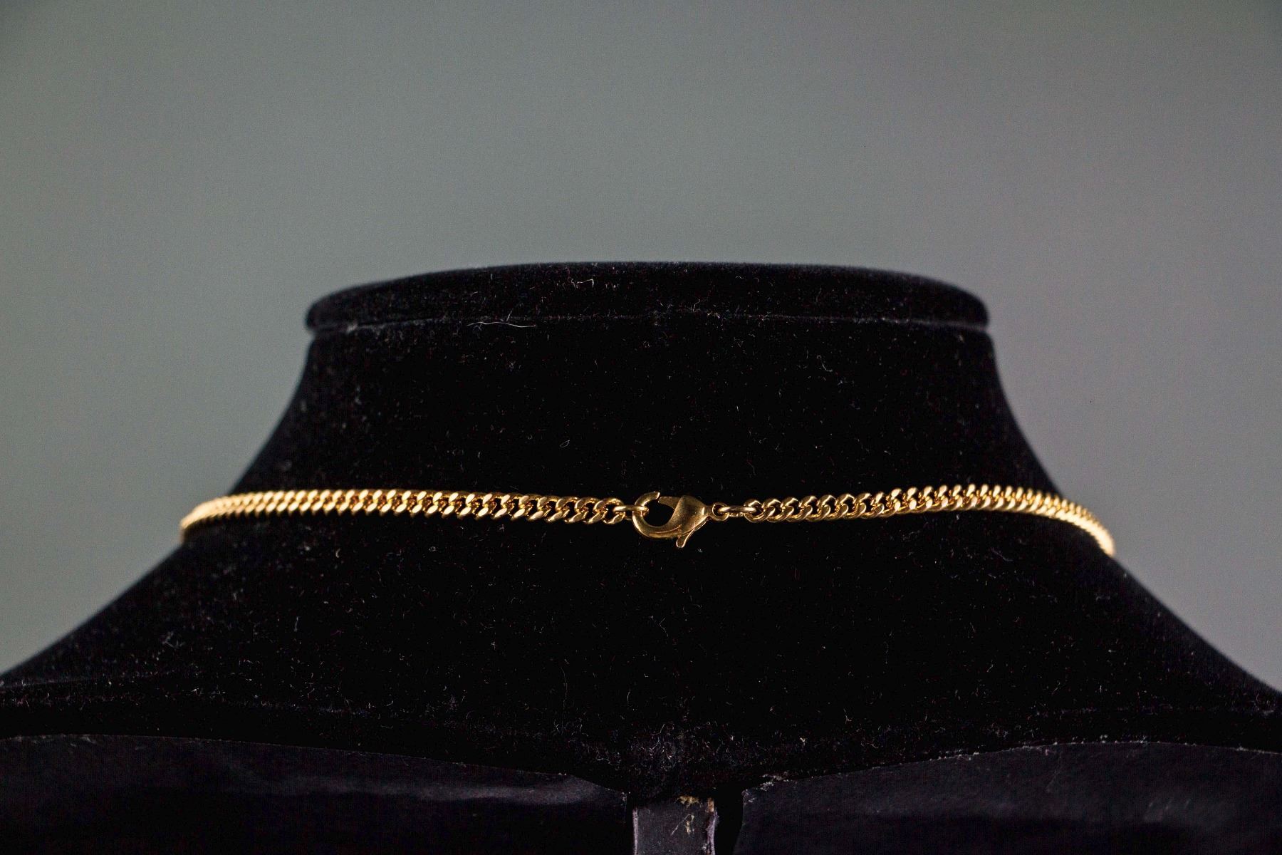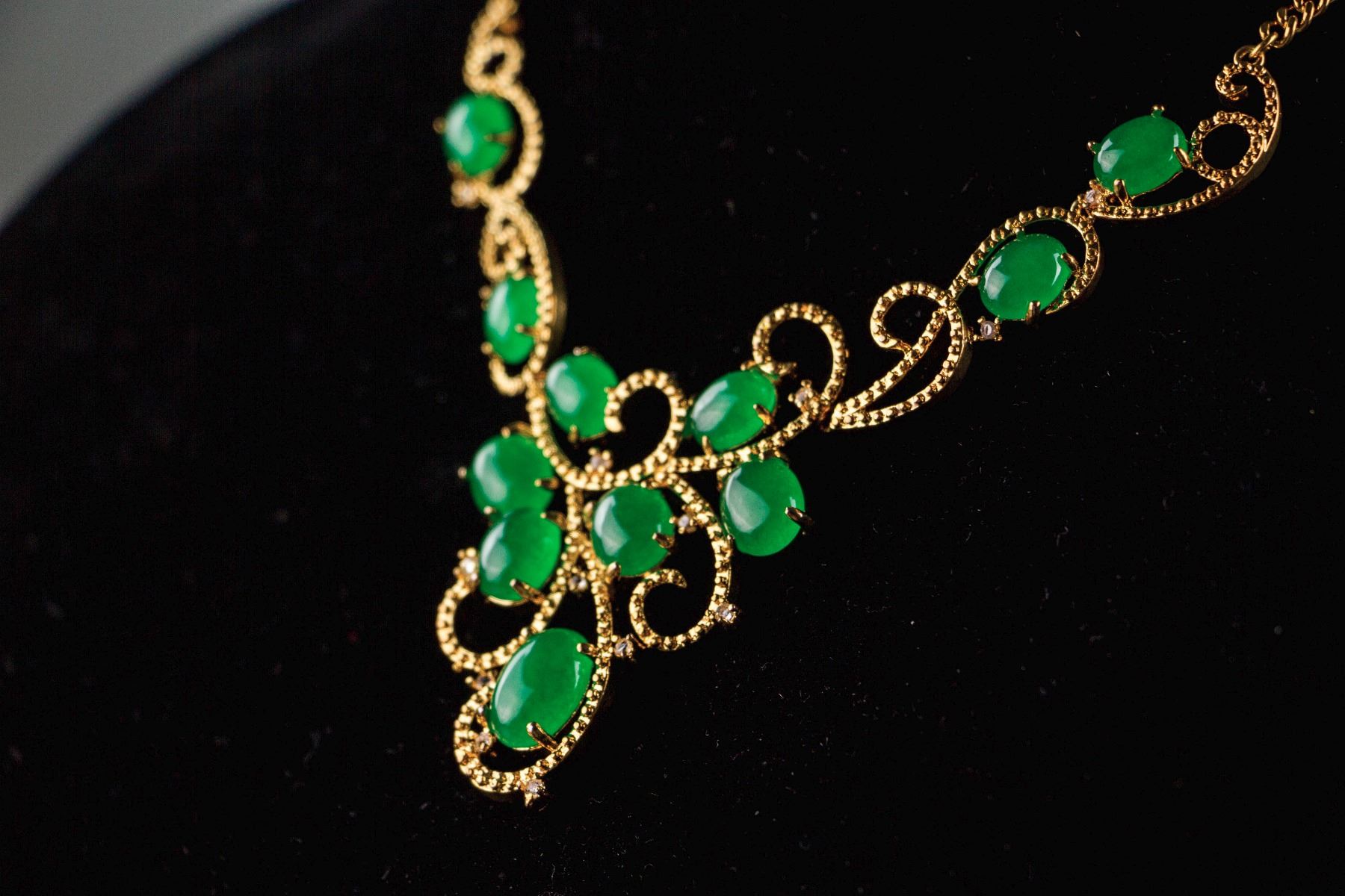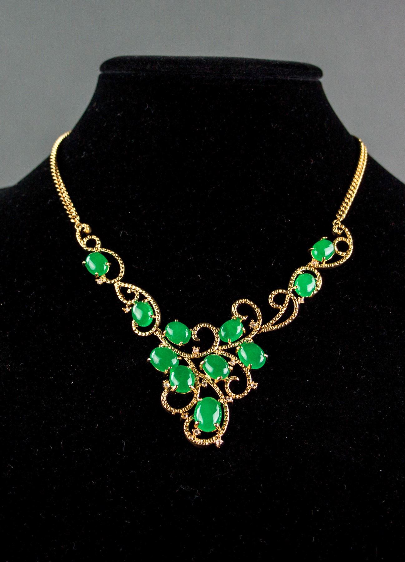 Chinese green hardstone carved gilt necklace; of floral form; set with 11 green hardstone; D: 6.5 cm, W: 1.2 cm, 46 grams