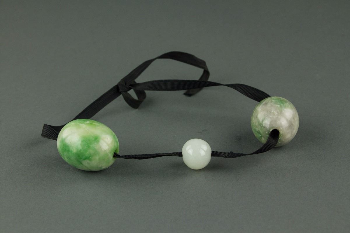 Chinese green jade necklace; comprised of two oval jade beads and one rounded white agate bead; H: 4.2 cm, 2 cm, W: 3.8 cm, 2 cm, 165 grams total