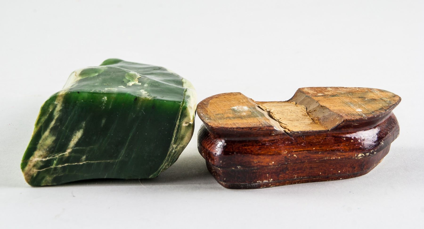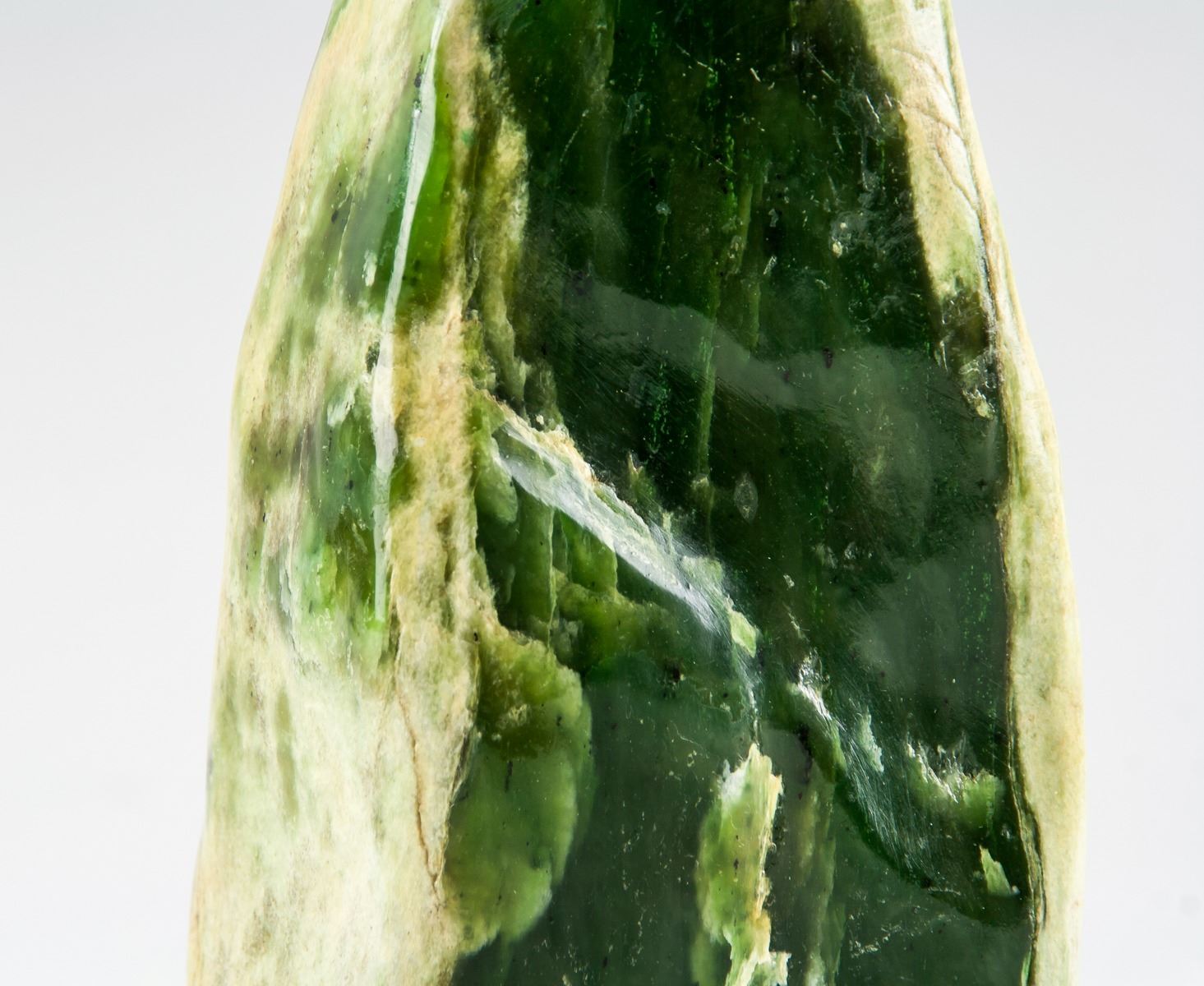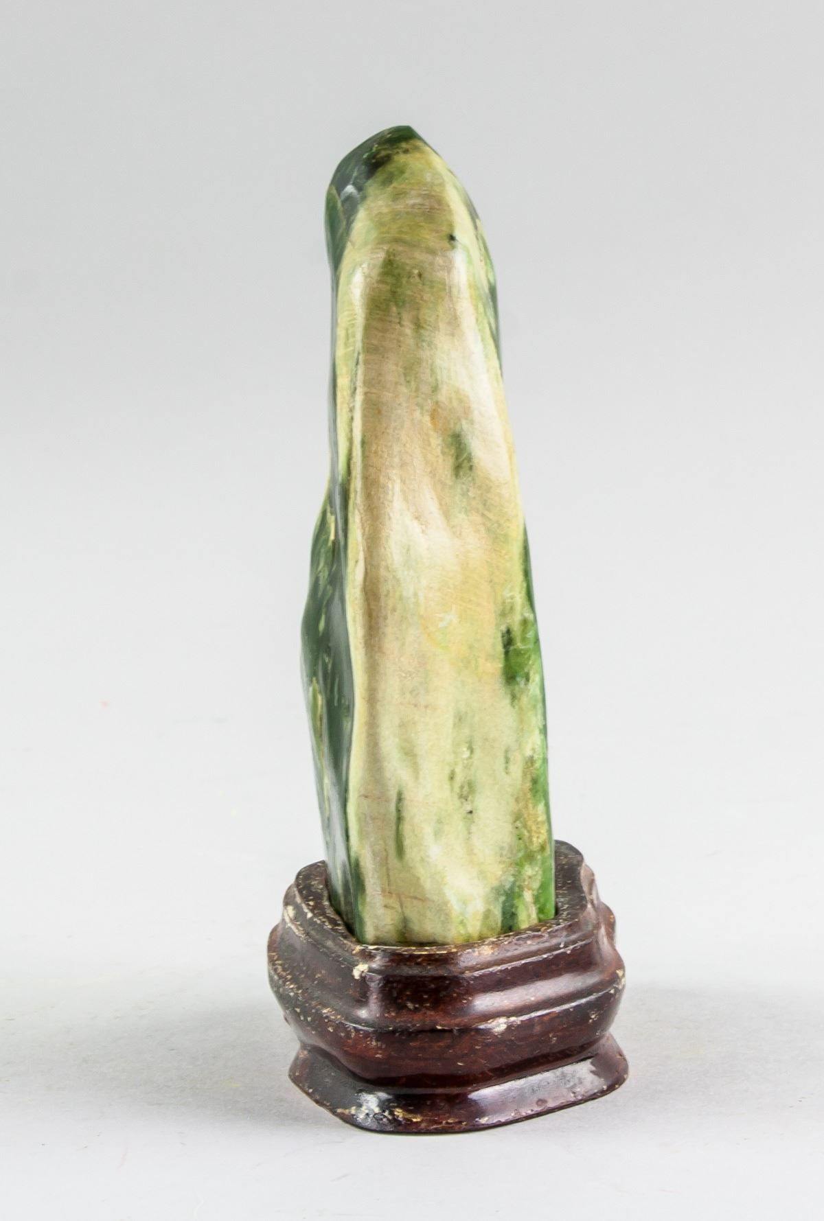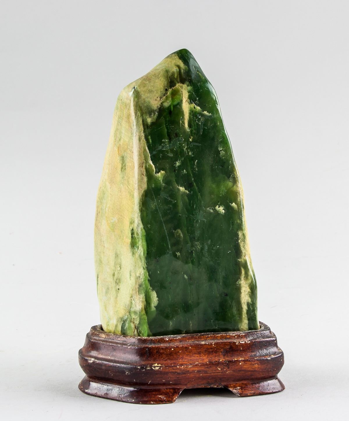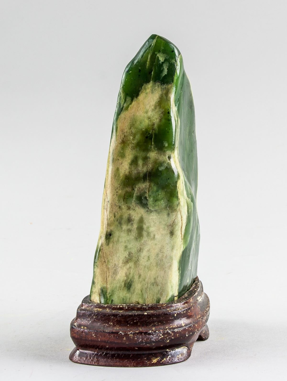 Chinese green jade boulder, of mountain form, of spinach green tone, with customized wood stand, 14 x 7 cm, 713 grams. PROVENANCE: Atef Elshikh He was ambassador in China 1975-1977. Then ambassador in Austria and then Italy. Died in September 1984.