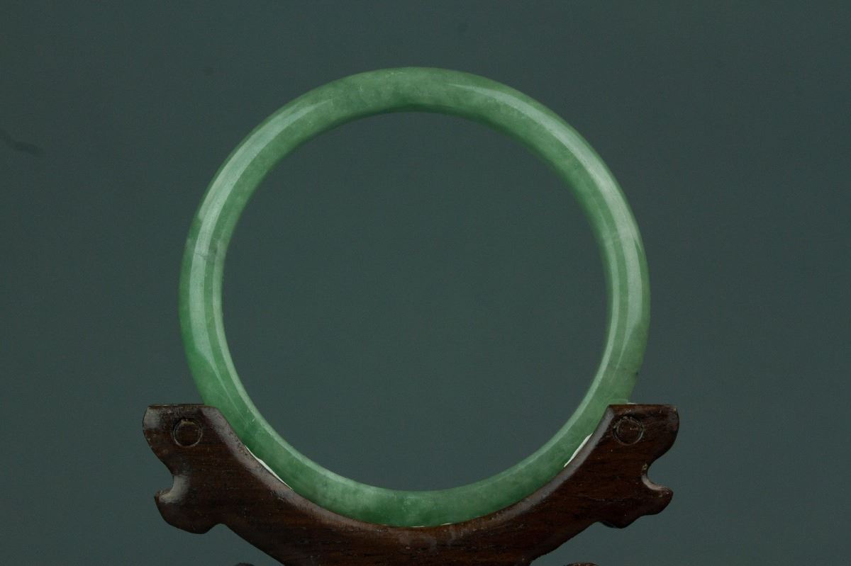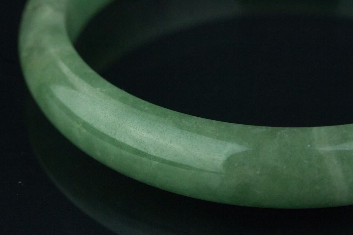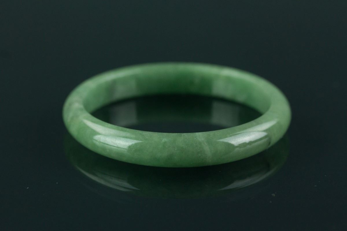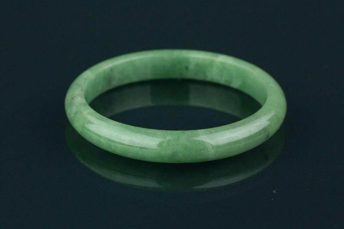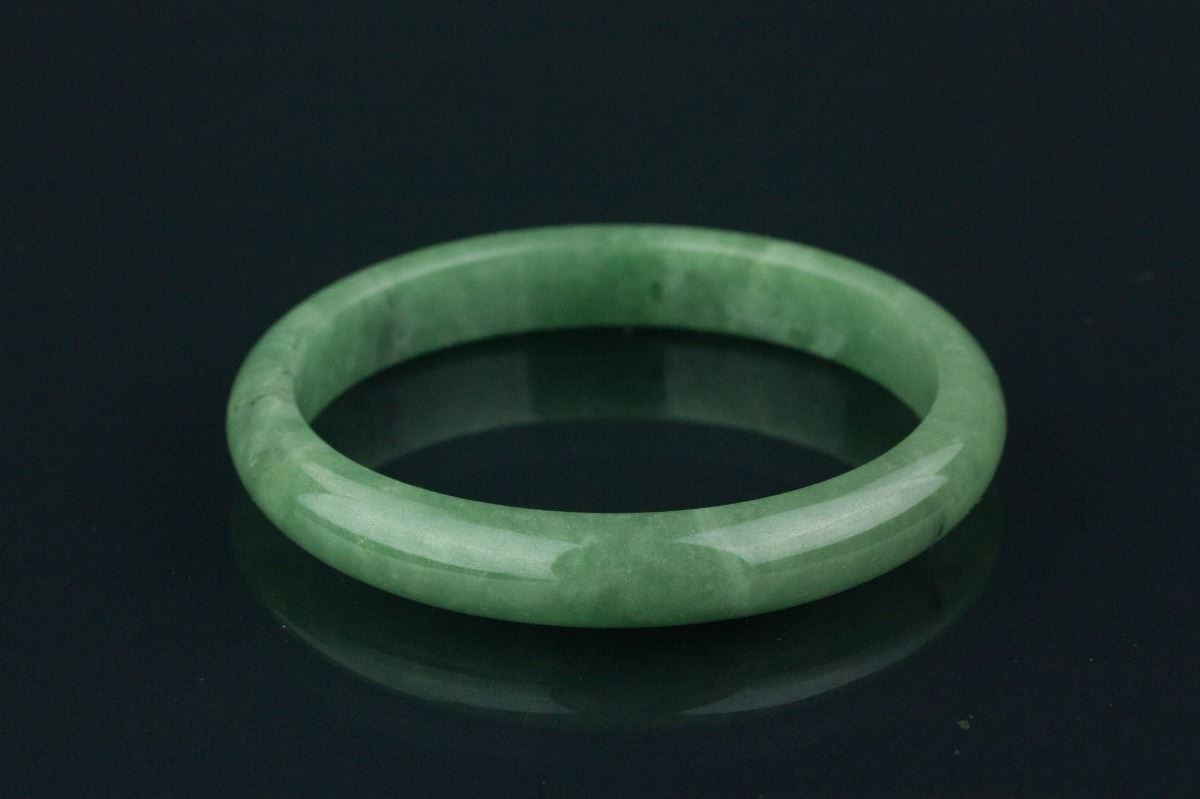 Chinese green jade bangle; rounded outside and flatten inside; of olive green tone; Inner D: 5.8 cm, 32 grams, Density: 3.16