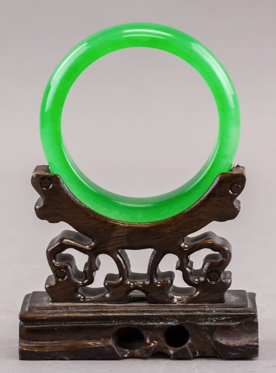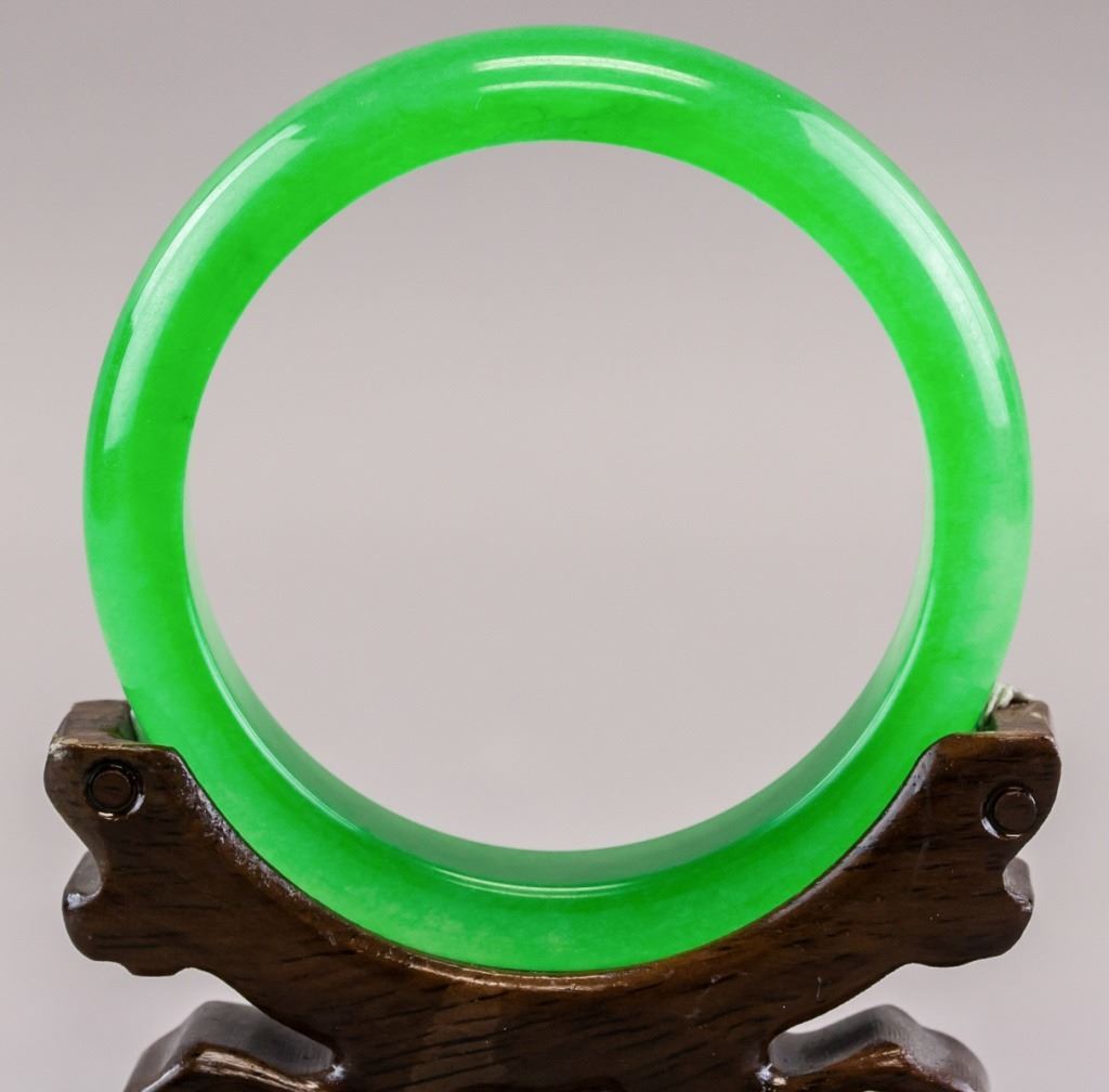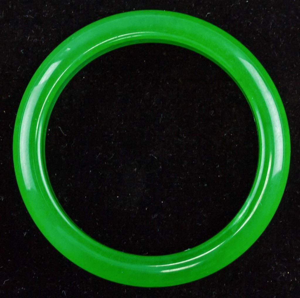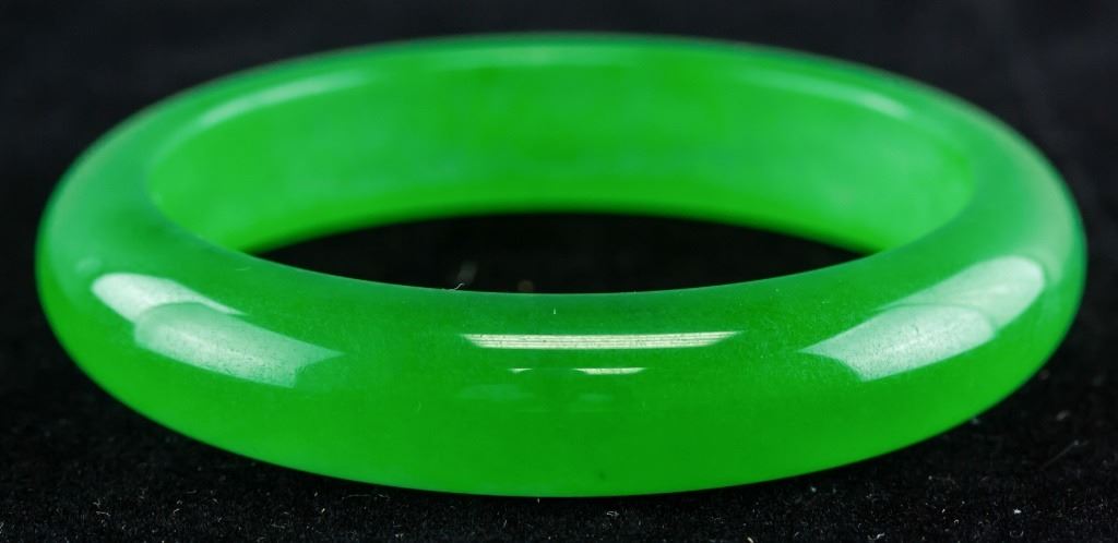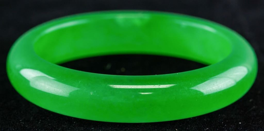 Chinese jade carved bangle. Of green tone. Of flat inside and rounded outside. Inner diameter: 6 cm. Outer diameter: 7.5 cm. 48 grams.