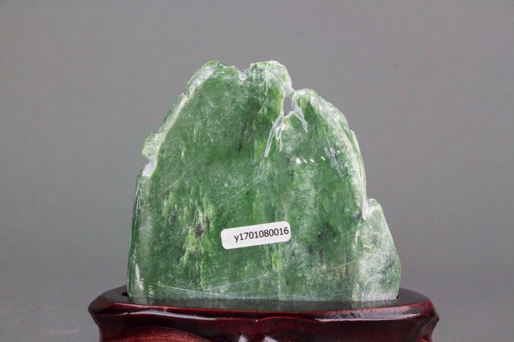 Chinese green jade nephrite carved boulder; of a mountain form; carved with landscape in high relief; accompanied with a wood stand; 13 cm x 13 cm, 575 grams (with stand)