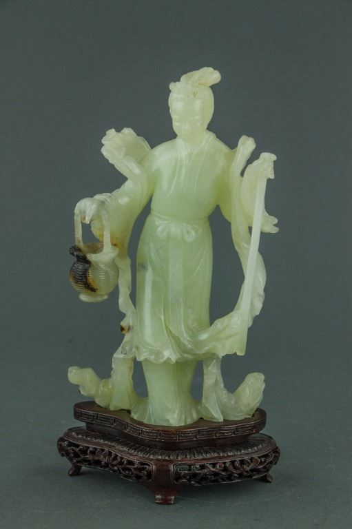 Chinese green jade figure; carved with a lady carrying a bamboo basket; of celadon tone with dark russet splash; custom-made wood stand included; H: 22 cm, W: 6 cm, L: 12 cm, 548 grams include base