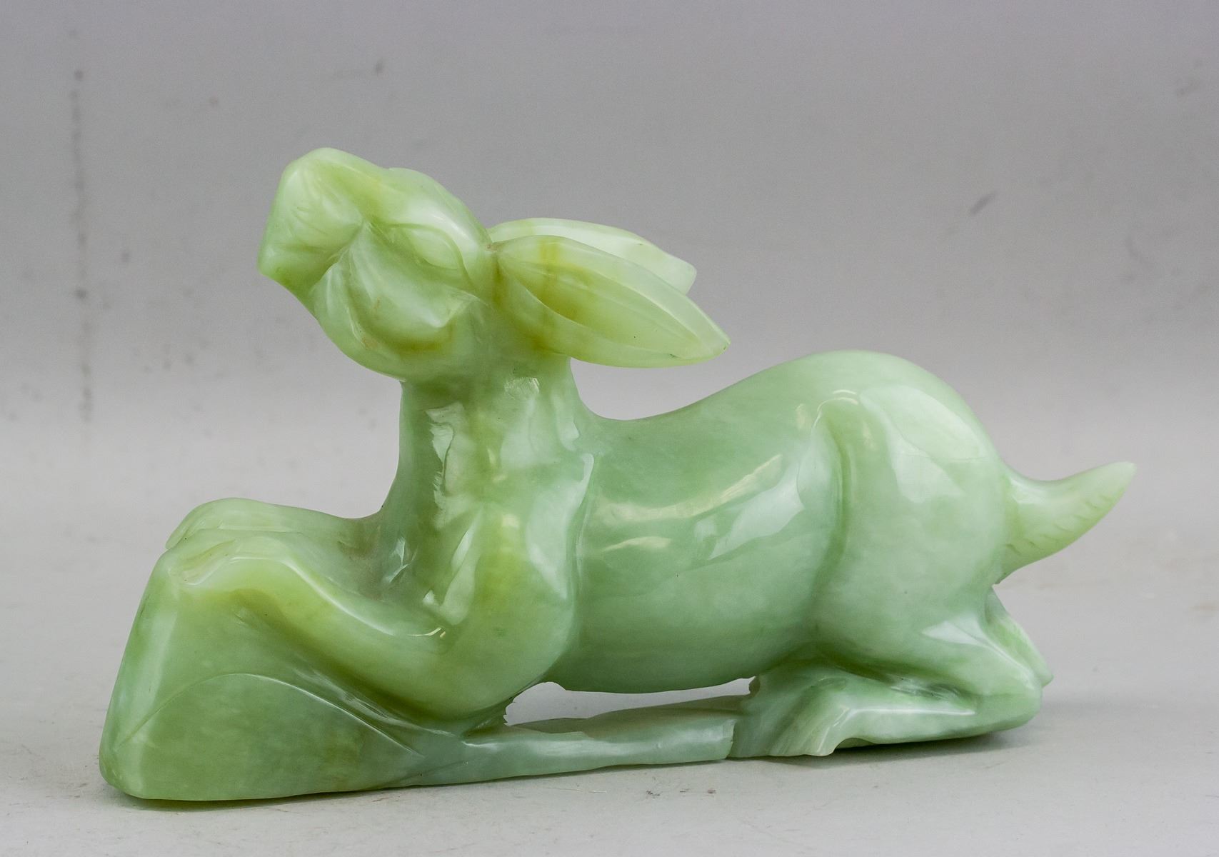 Chinese green jade carved statue. Featuring a crouching rabbit form. 13 x 20 cm, 1134 grams