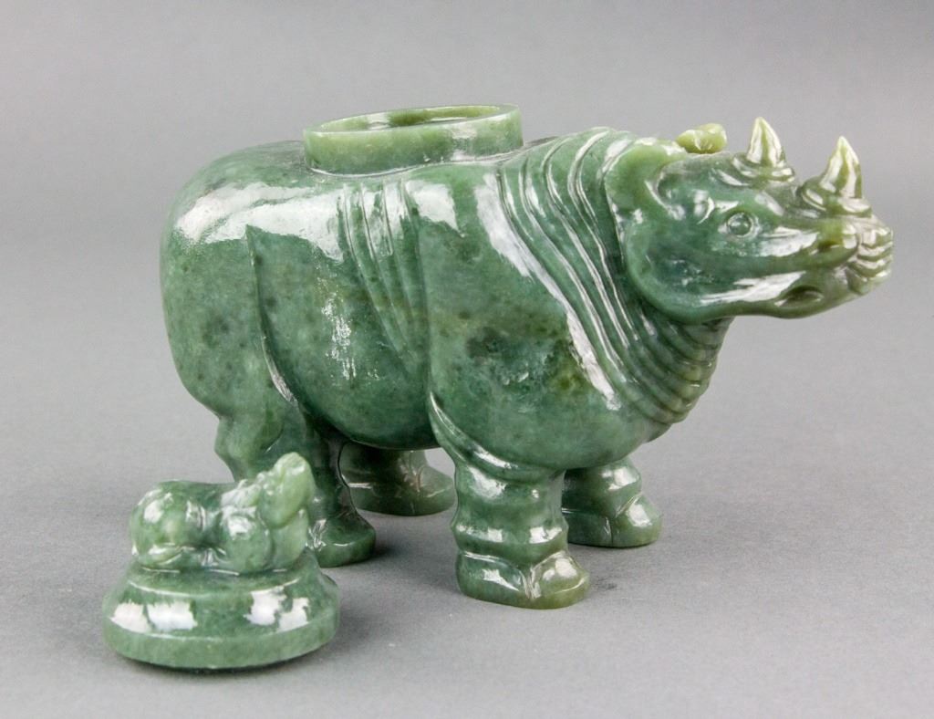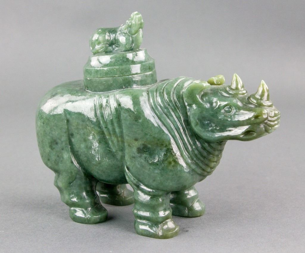 Chinese green jade vase; the body is in form of a two-horn rhinoceros surmounted by a circular lid with a baby rhinoceros handle; the stone of mottled spinach green tone; H: 13 cm, W: 6 cm, L: 16 cm, 1322 grams