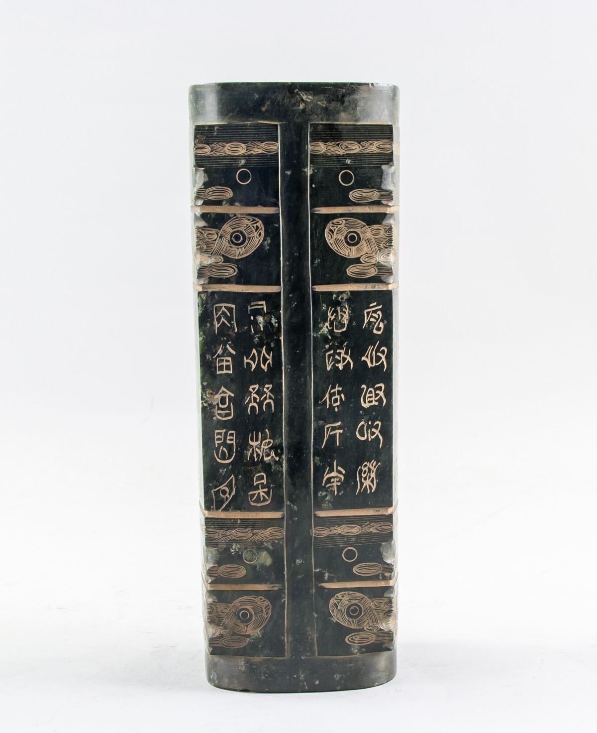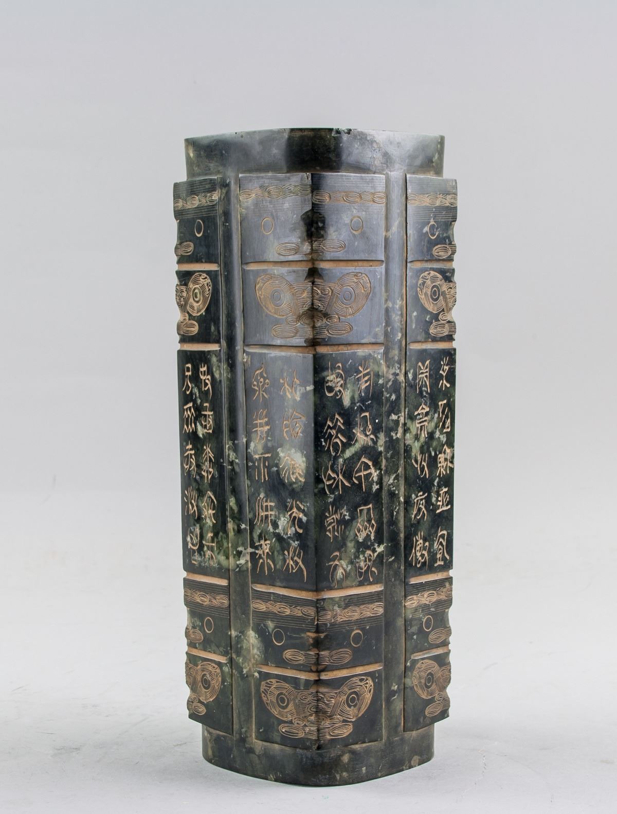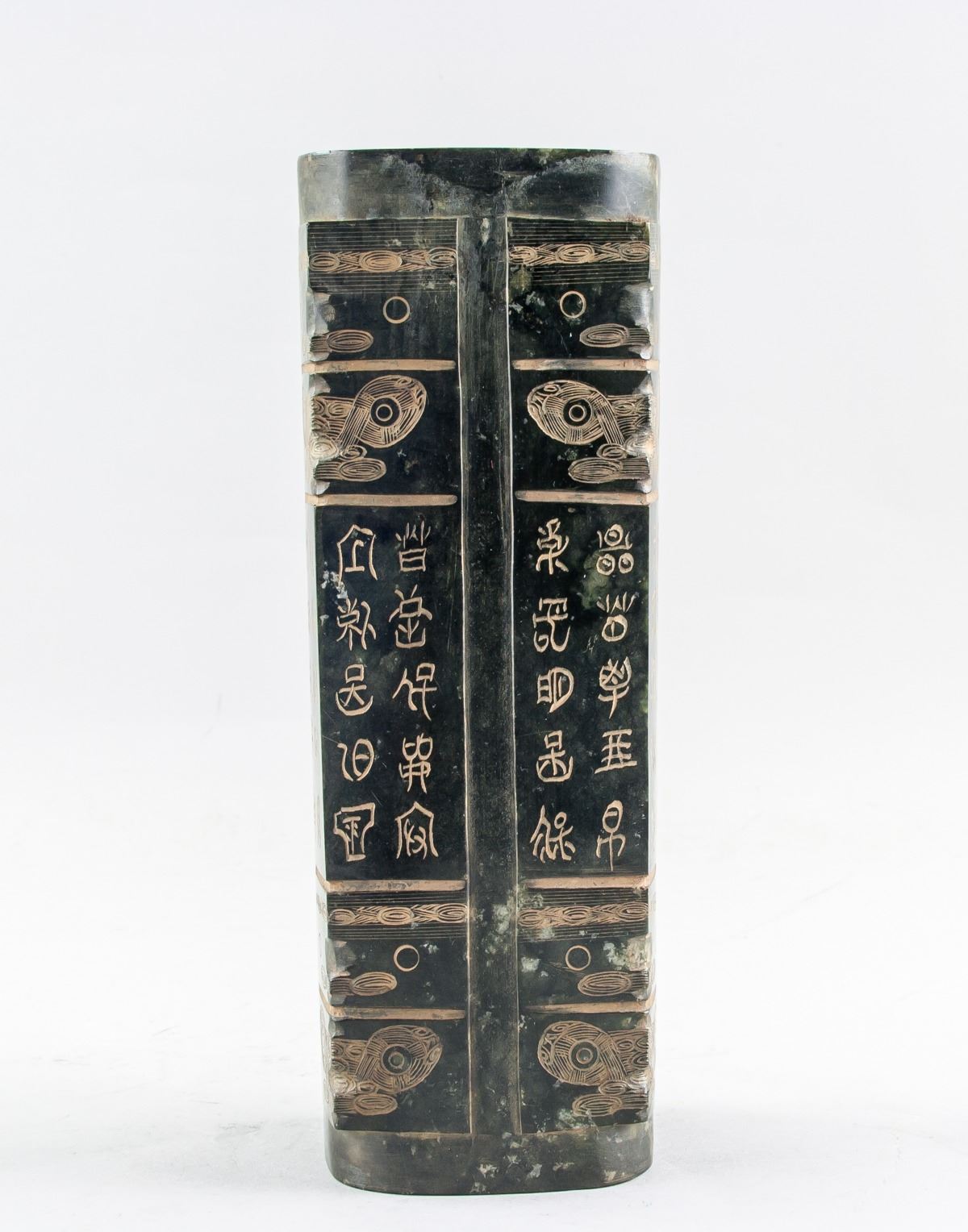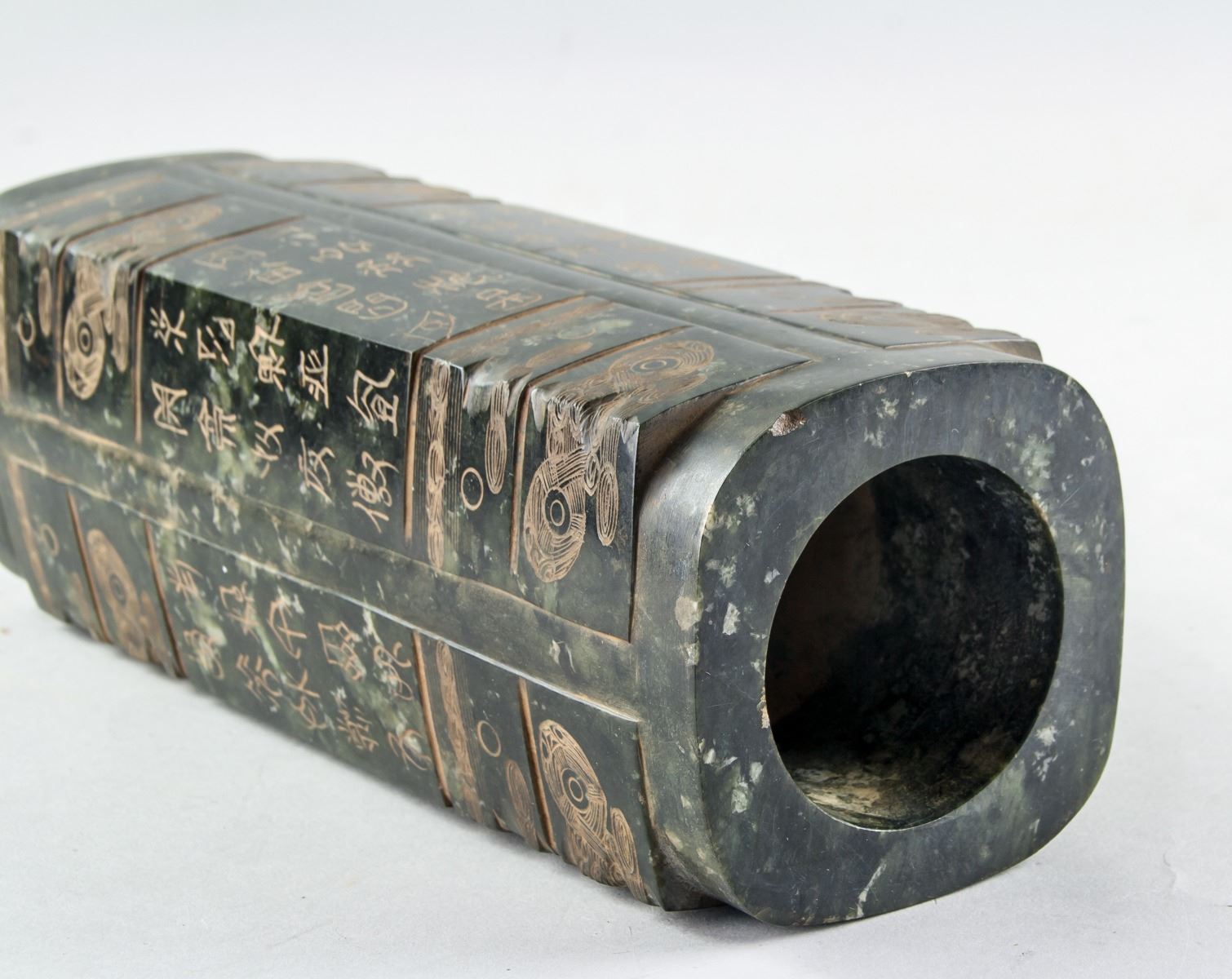 Chinese green jade carved cong, of square outside and round inside, carved with Taotie pattern and Chinese characters in seal scritp, 25 x 8 cm, 2936 grams