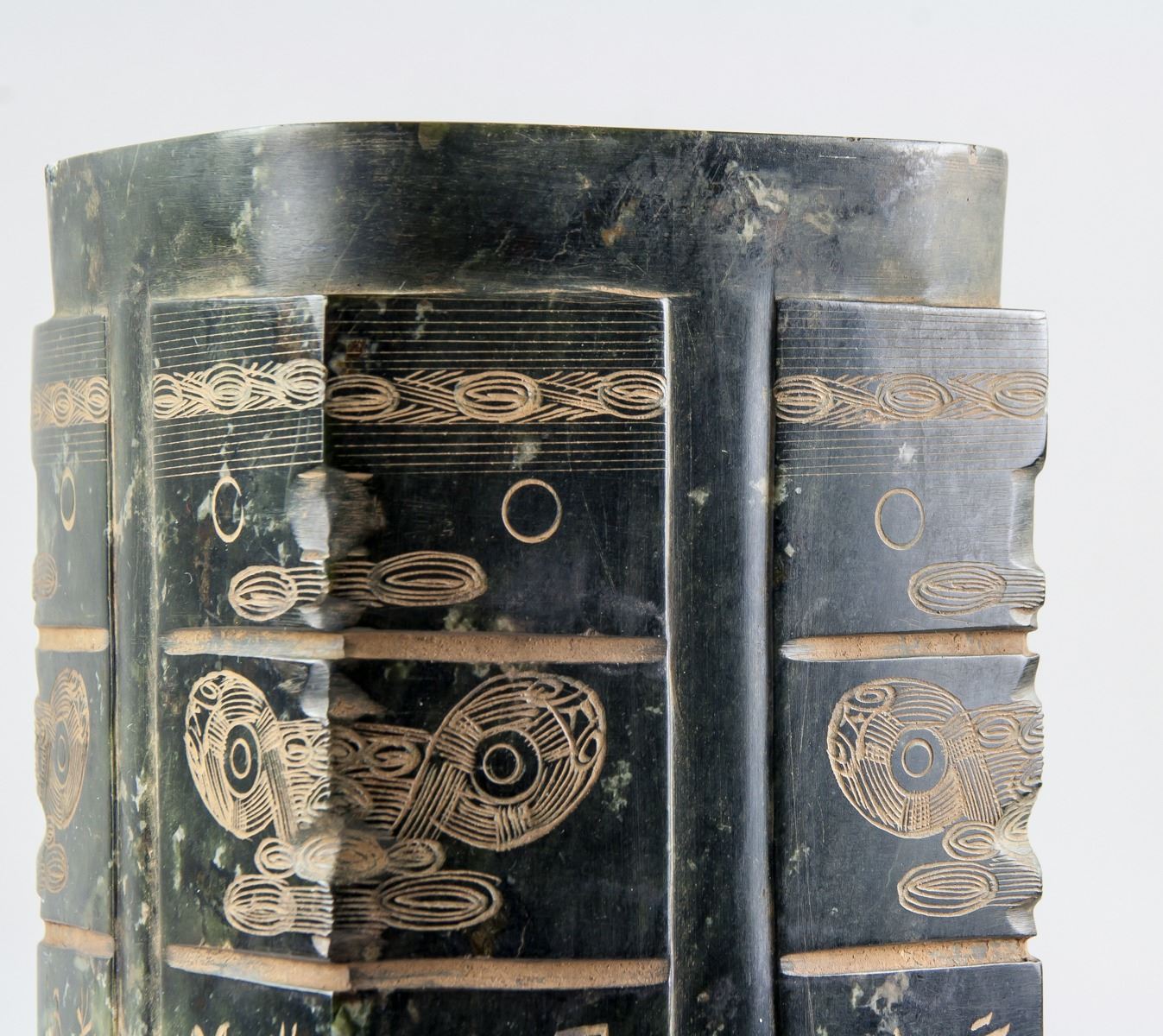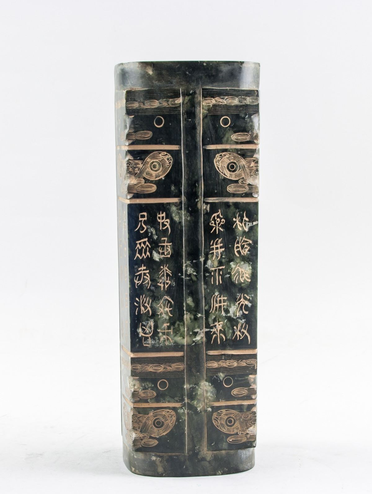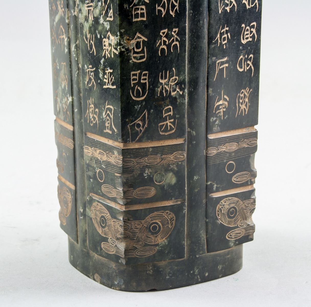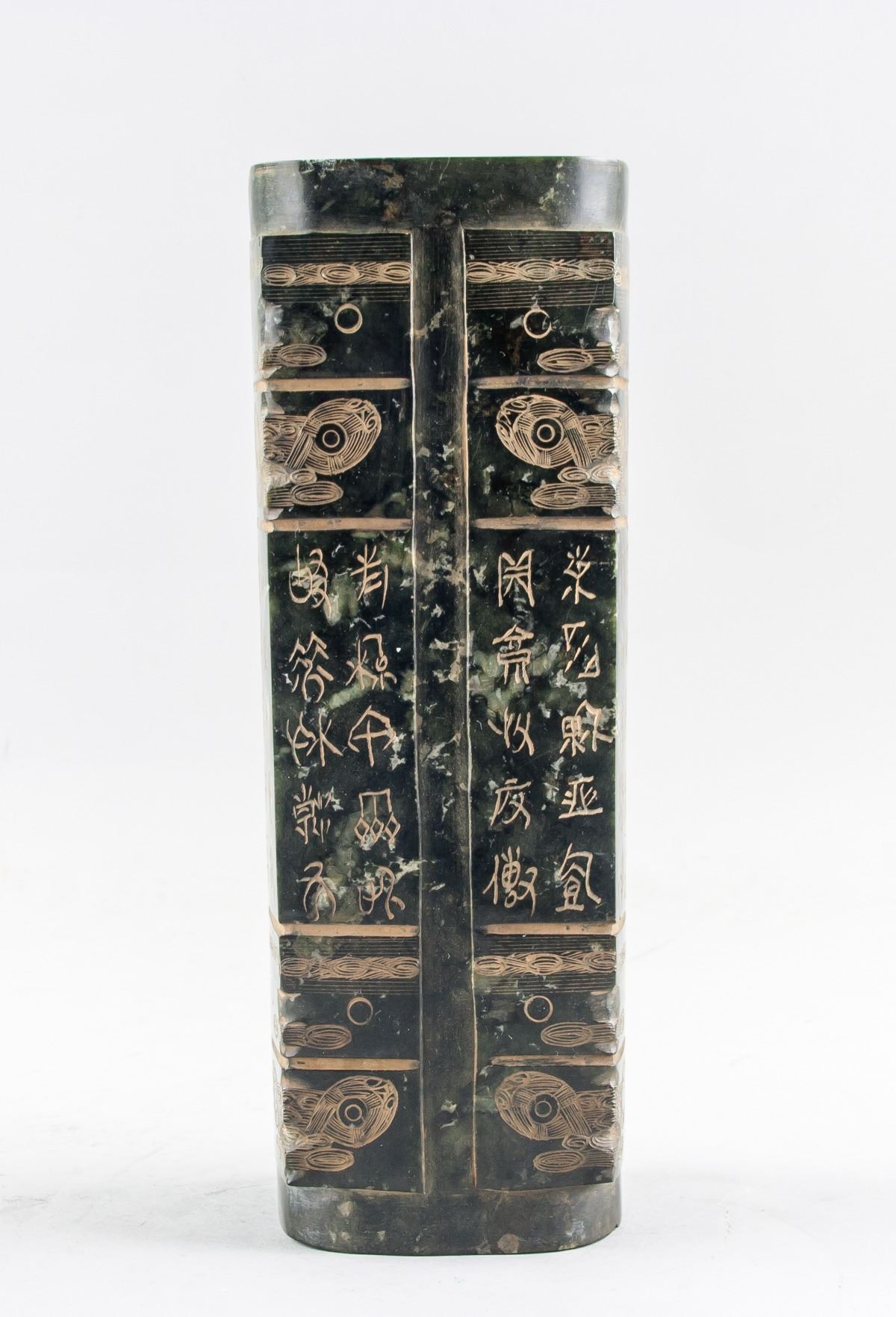 Chinese green jade carved cong, of square outside and round inside, carved with Taotie pattern and Chinese characters in seal scritp, 25 x 8 cm, 2936 grams
