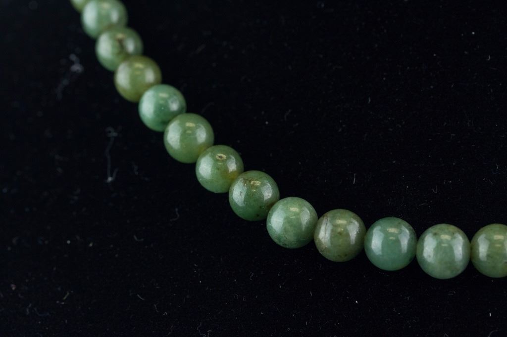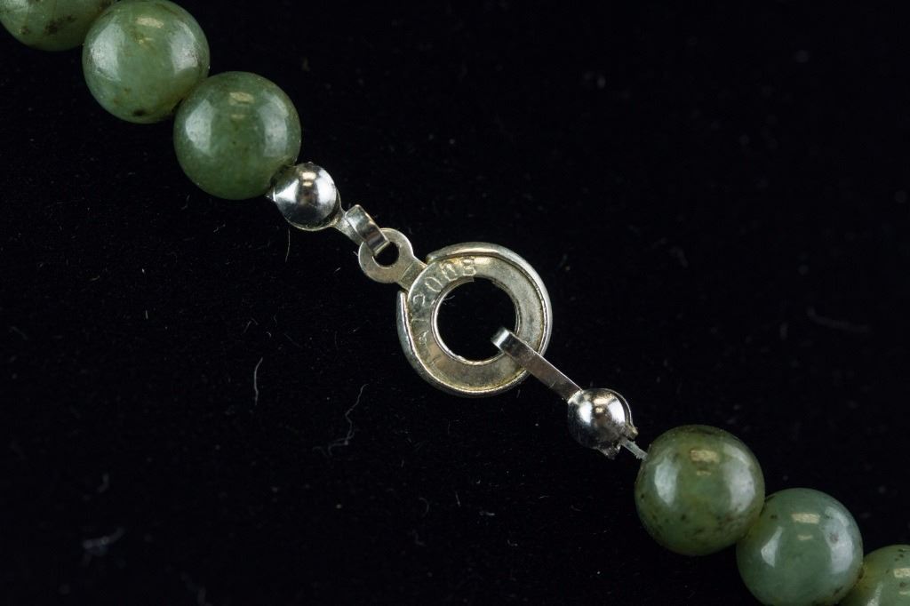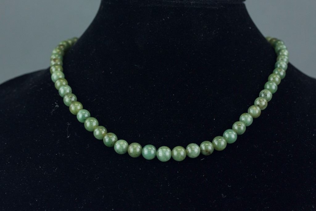 Chinese green jade necklace with clasp; comprised of rounded jade beads; the stone of celadon tone with spinach green spots; L: 46 cm, D: 0.7 cm each bead, 47 grams; Density ~ 3.19