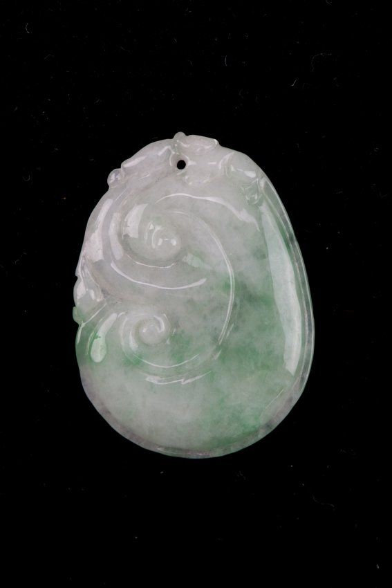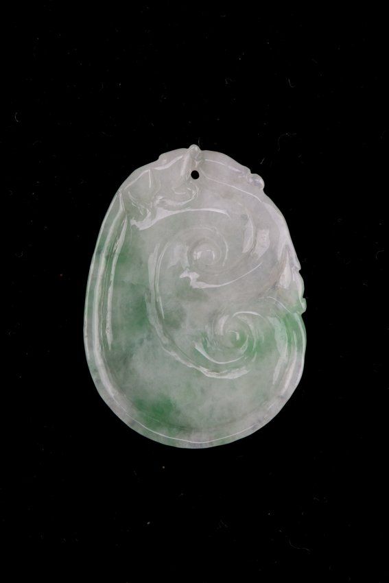 Chinese carved jade pendant; ovoid form featuring stylized ruyi-head in relief; of translucent white tone with apple green suffusions; pierced for suspension; H: 3.9 cm, W: 2.9 cm, 8 grams