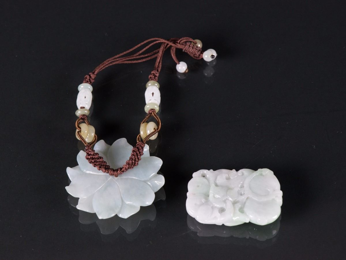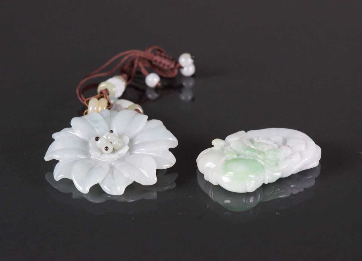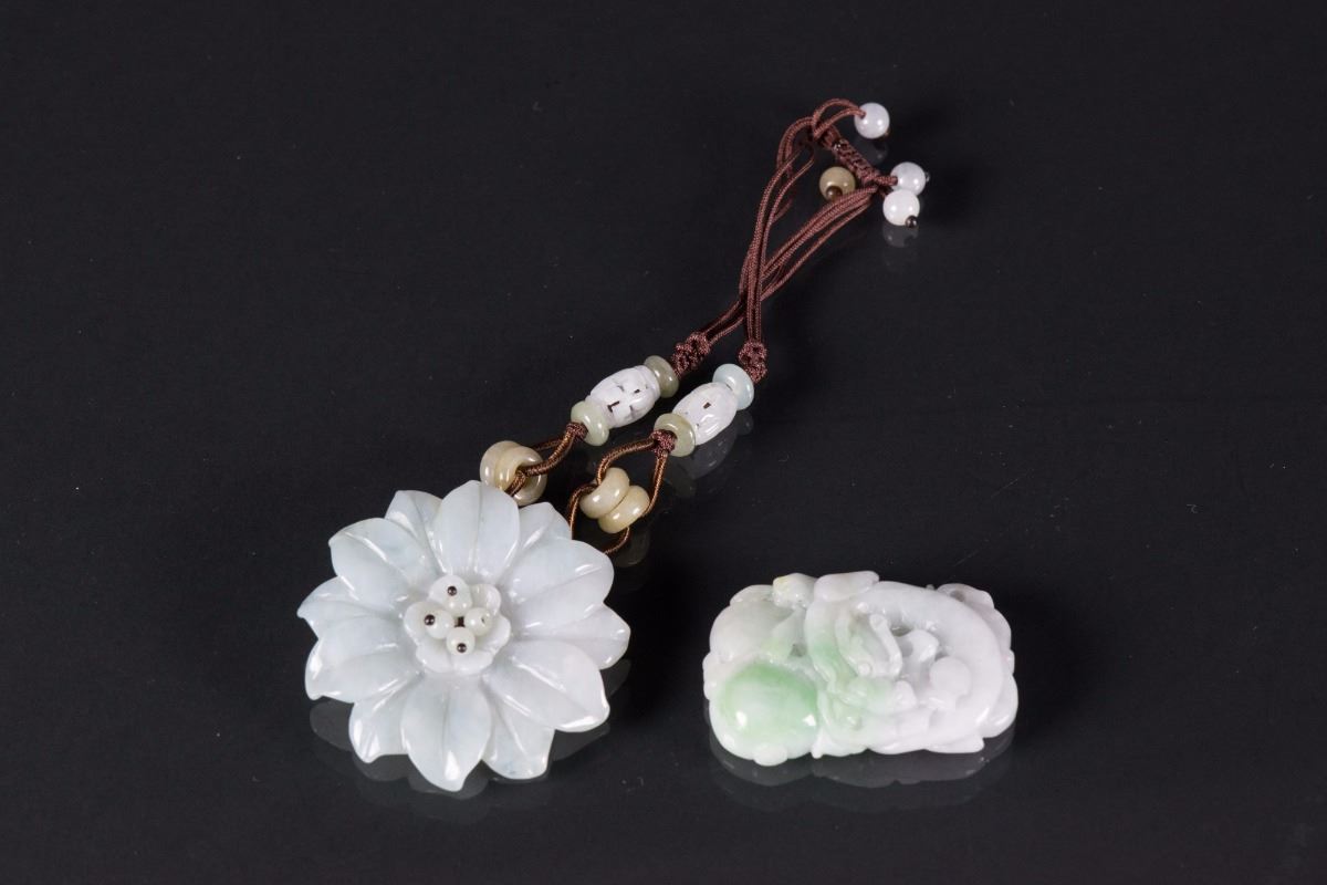 Chinese green jade and hardstone pendant; comprised of a white flower pendant and a carved dragon pendant; both pierced for suspension; (1/2) H: 4.5 cm, W: 3 cm, 27 grams; (2/2) D: 5 cm, 22 grams