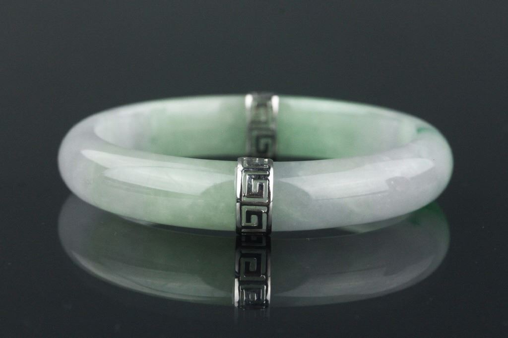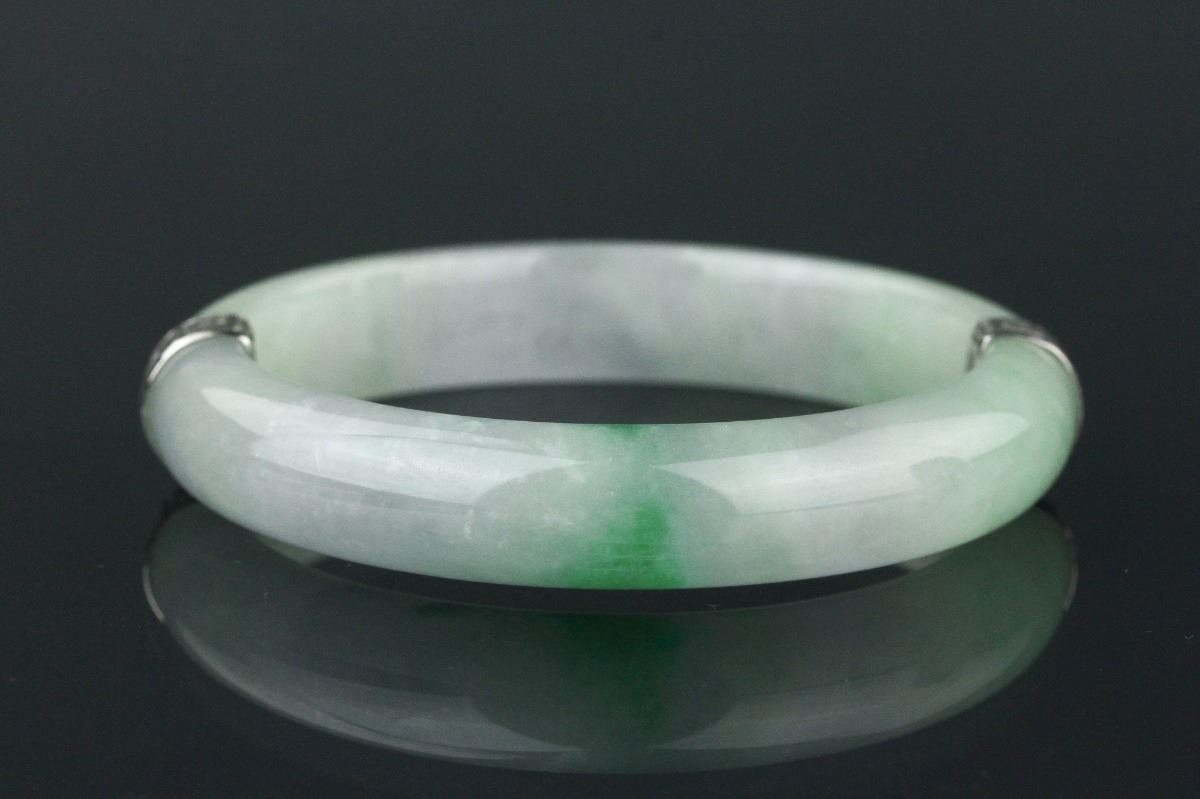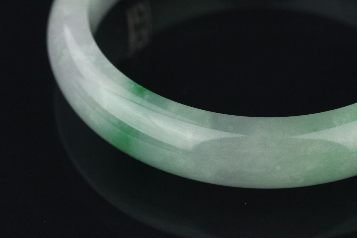 Chinese jadeite bangle; rounded outside and flatten inside; featuring two openwork carved clasps; D: 7 cm, Inner D: 5.5 cm, 45 grams; Density ~ 3.36