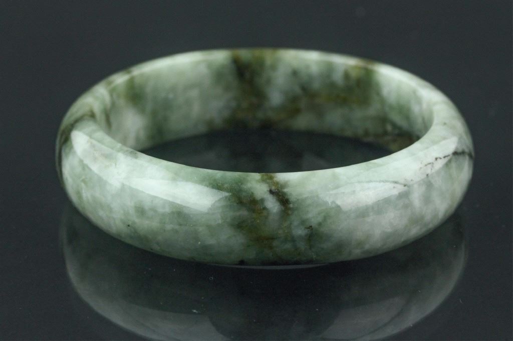 Chinese jadeite bangle; rounded outside and flatten inside; of pale green tone with spinach green suffusions; with Grade A jadeite certificate; D: 5.75 cm, 63 grams