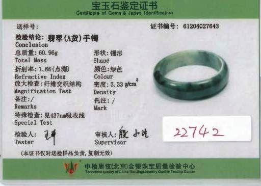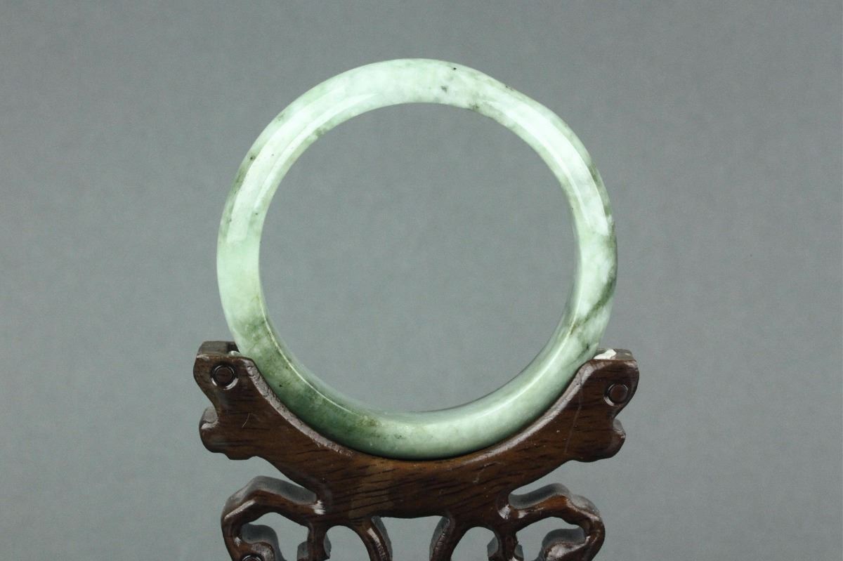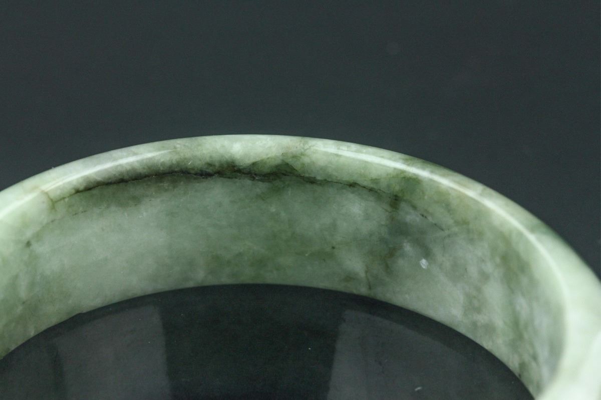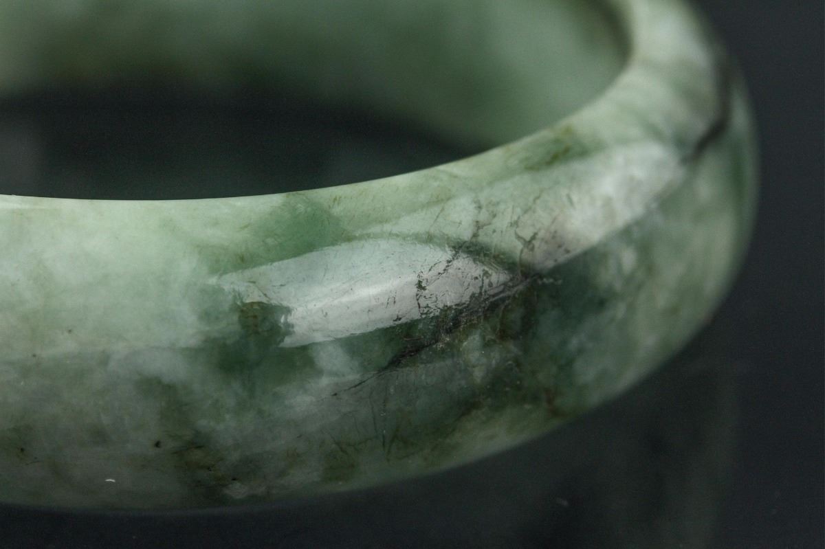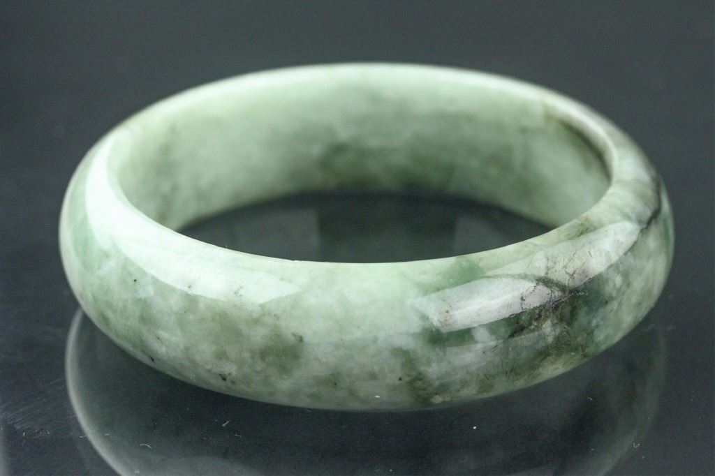 Chinese jadeite bangle; rounded outside and flatten inside; of pale green tone with spinach green suffusions; with Grade A jadeite certificate; D: 5.5 cm, 63 grams