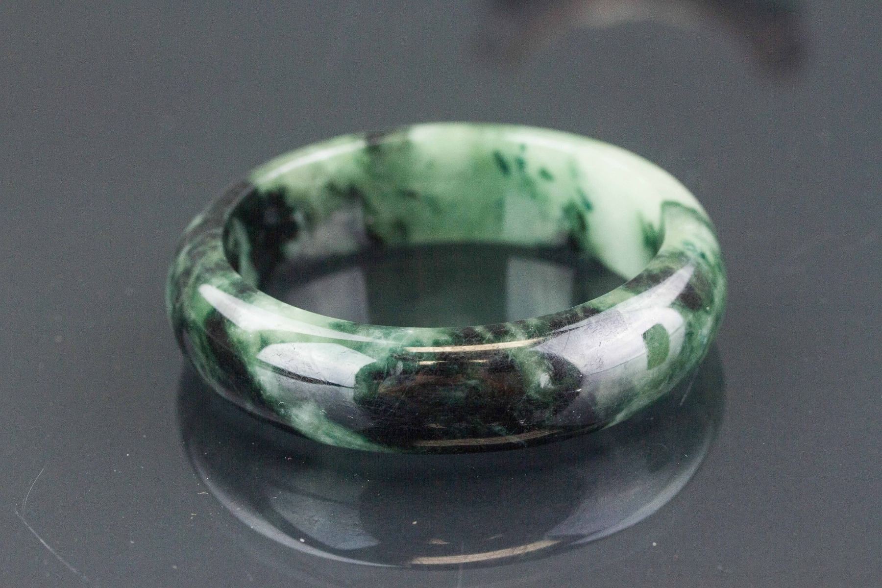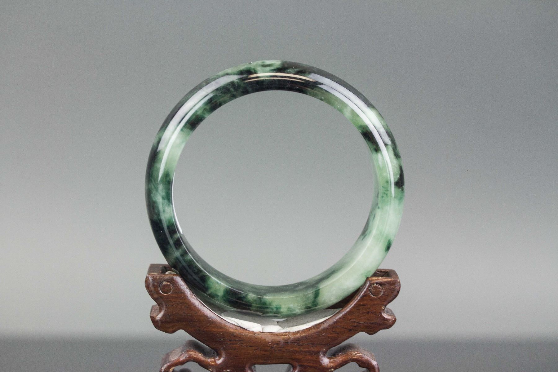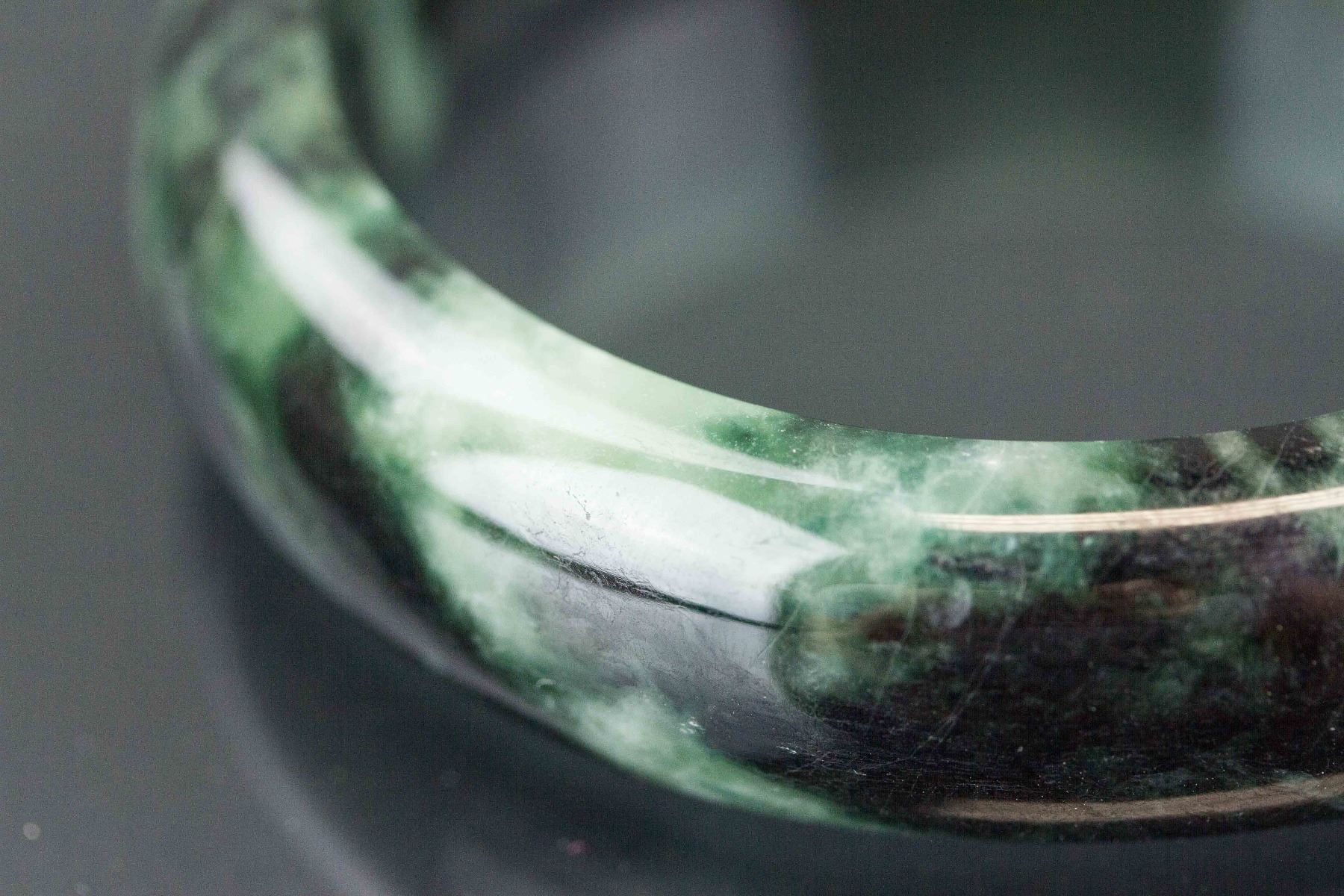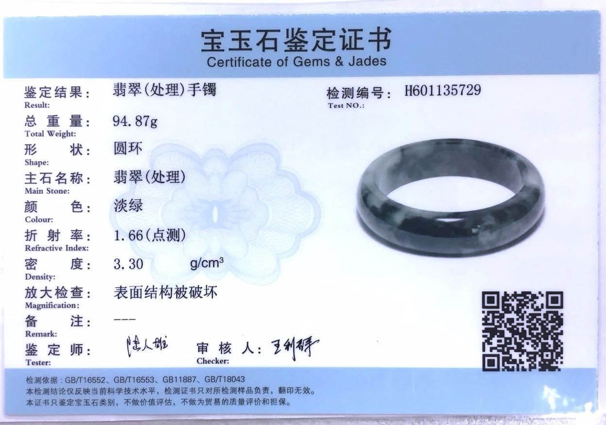 Chinese green jadeite bangle; rounded outside and flatten inside; of pale green tone with spinach green tinges; accompanied with certificate; Inner D: 6.5 cm, D: 7.5 cm, 95 grams, Density: 3.3
