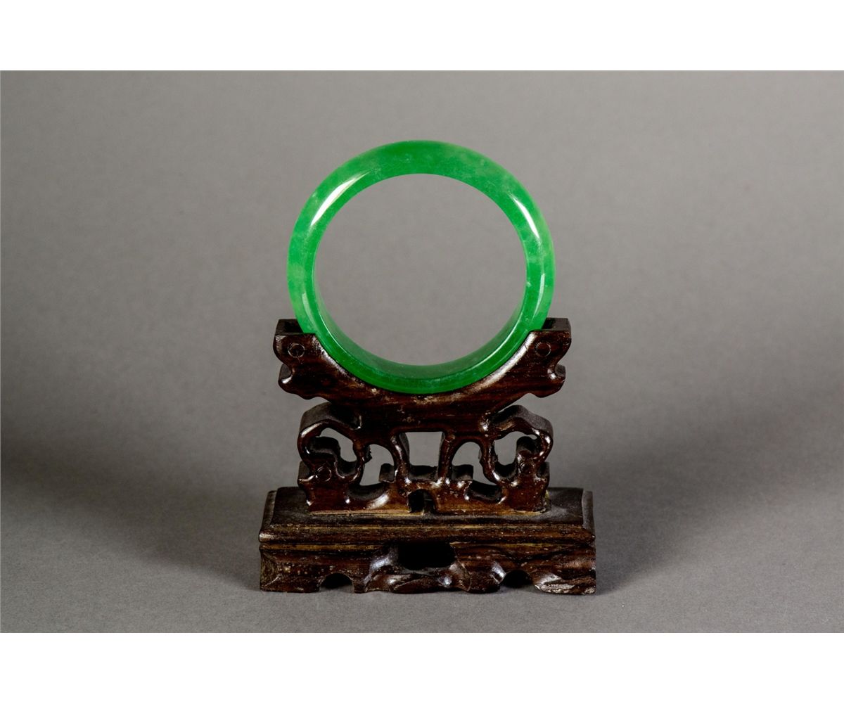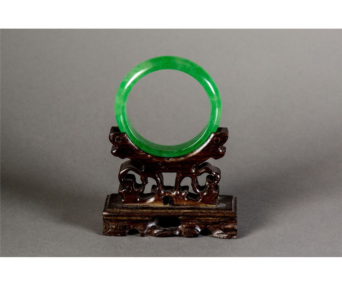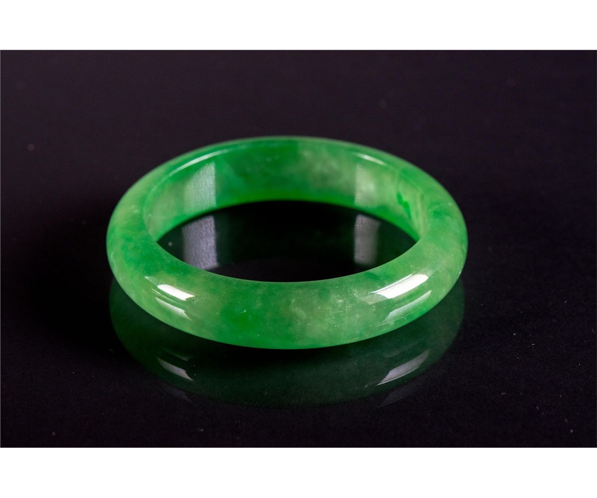 Chinese emerald green jadeite carved bangle; rounded outside and flatten inside; D: 7 cm, 53 grams; Density: 3.31