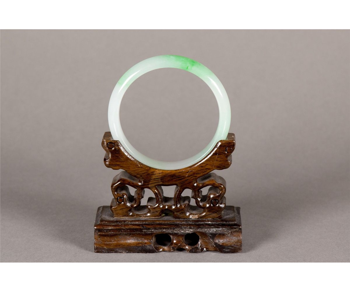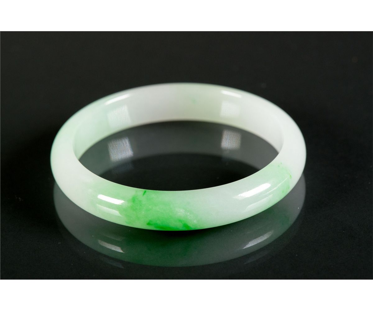 Chinese green jadeite carved bangle; of rounded outside and flatten inside; of white tone with touch of apple green tone; D: 7.5 cm, Inner D: 7 cm 43 grams: Density: 3.29