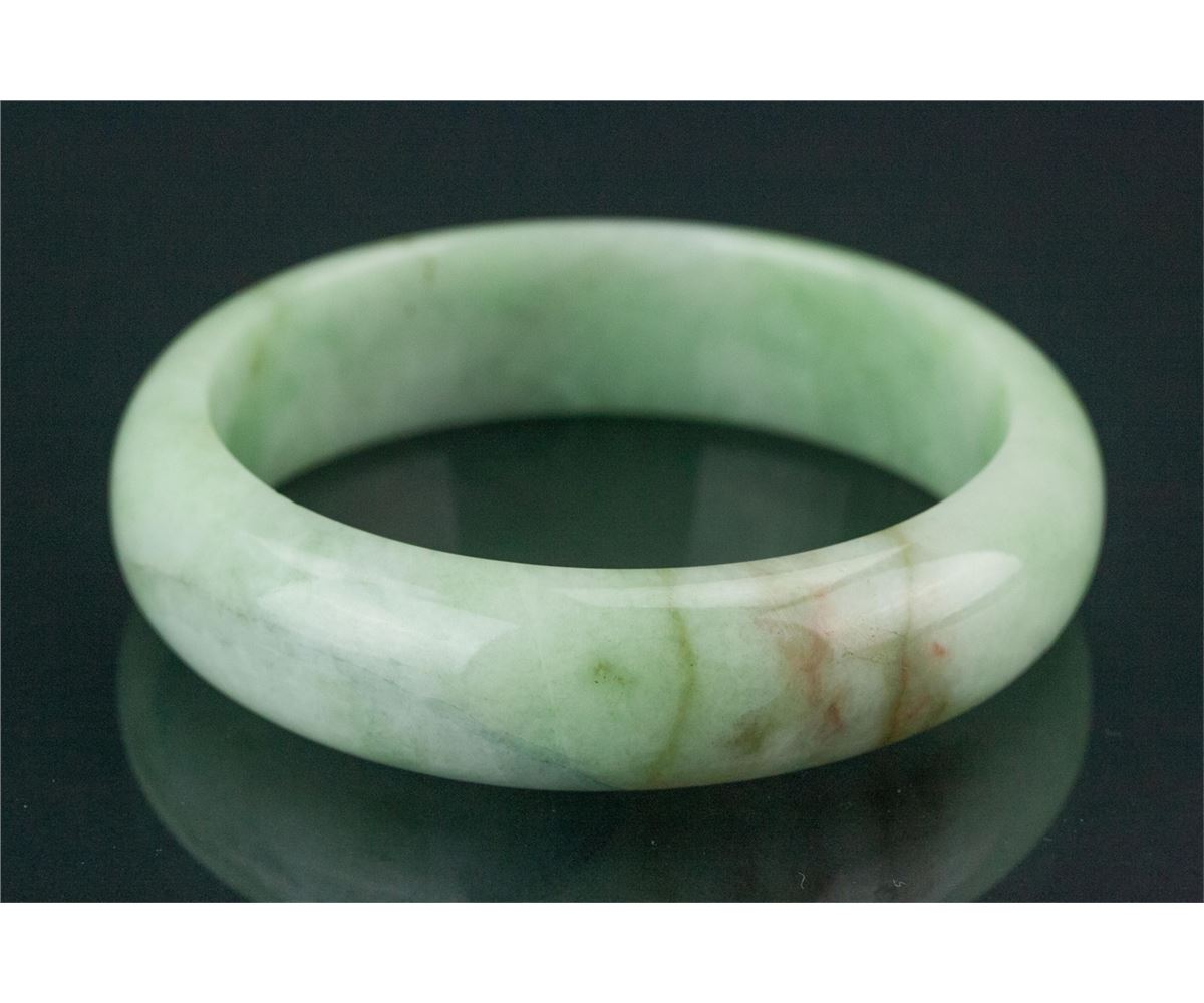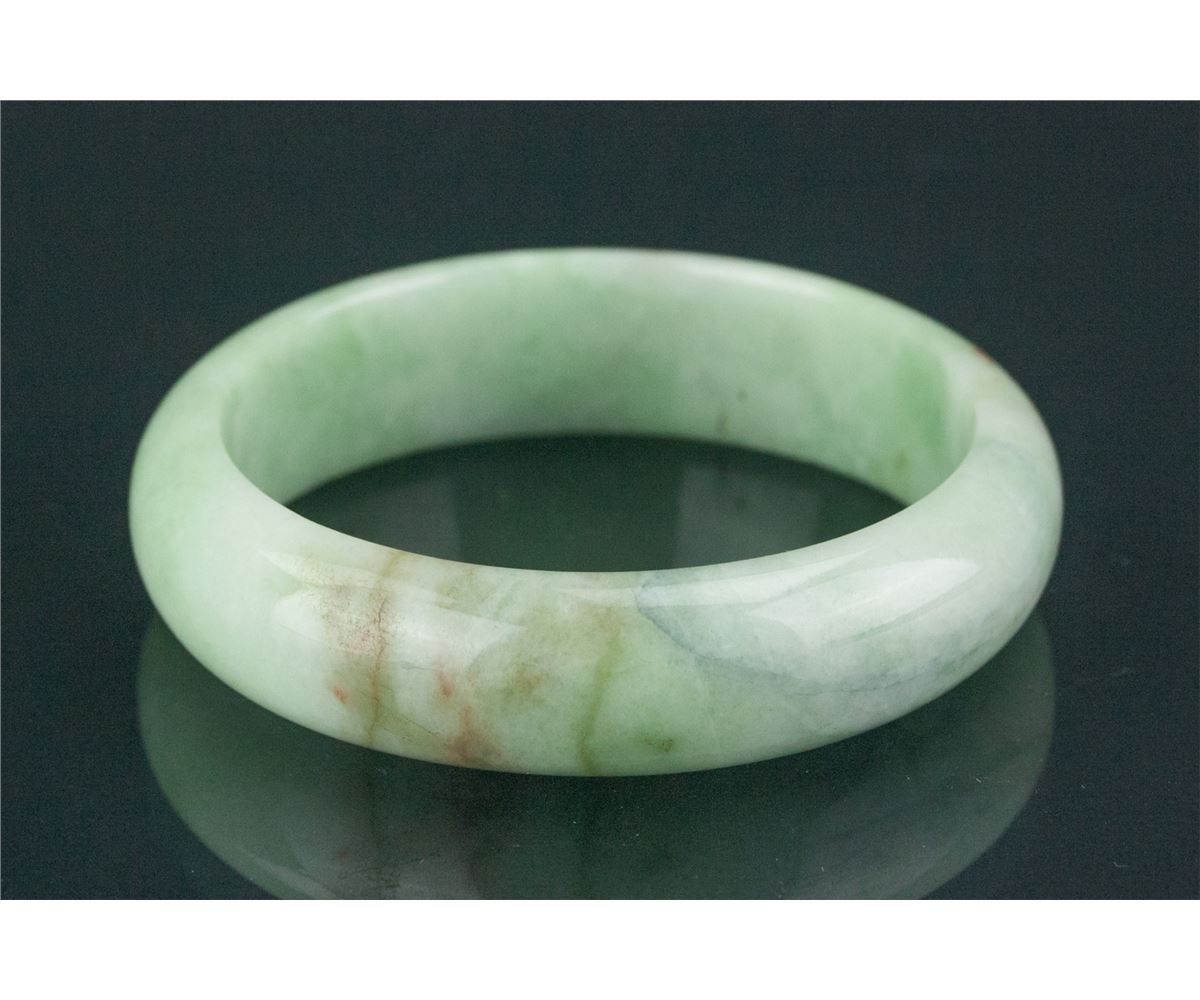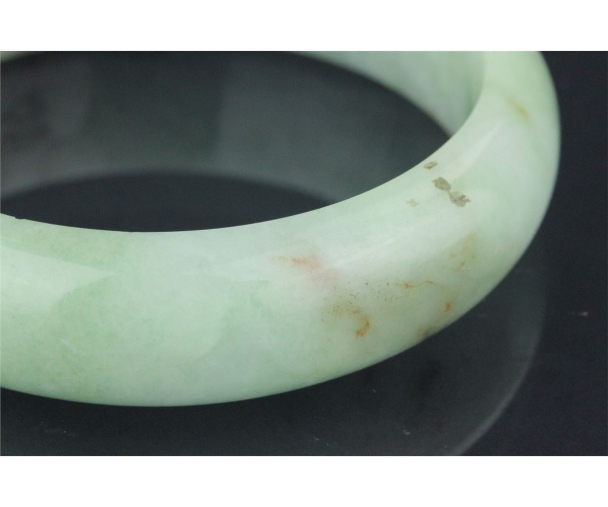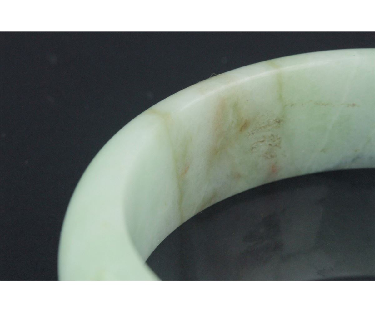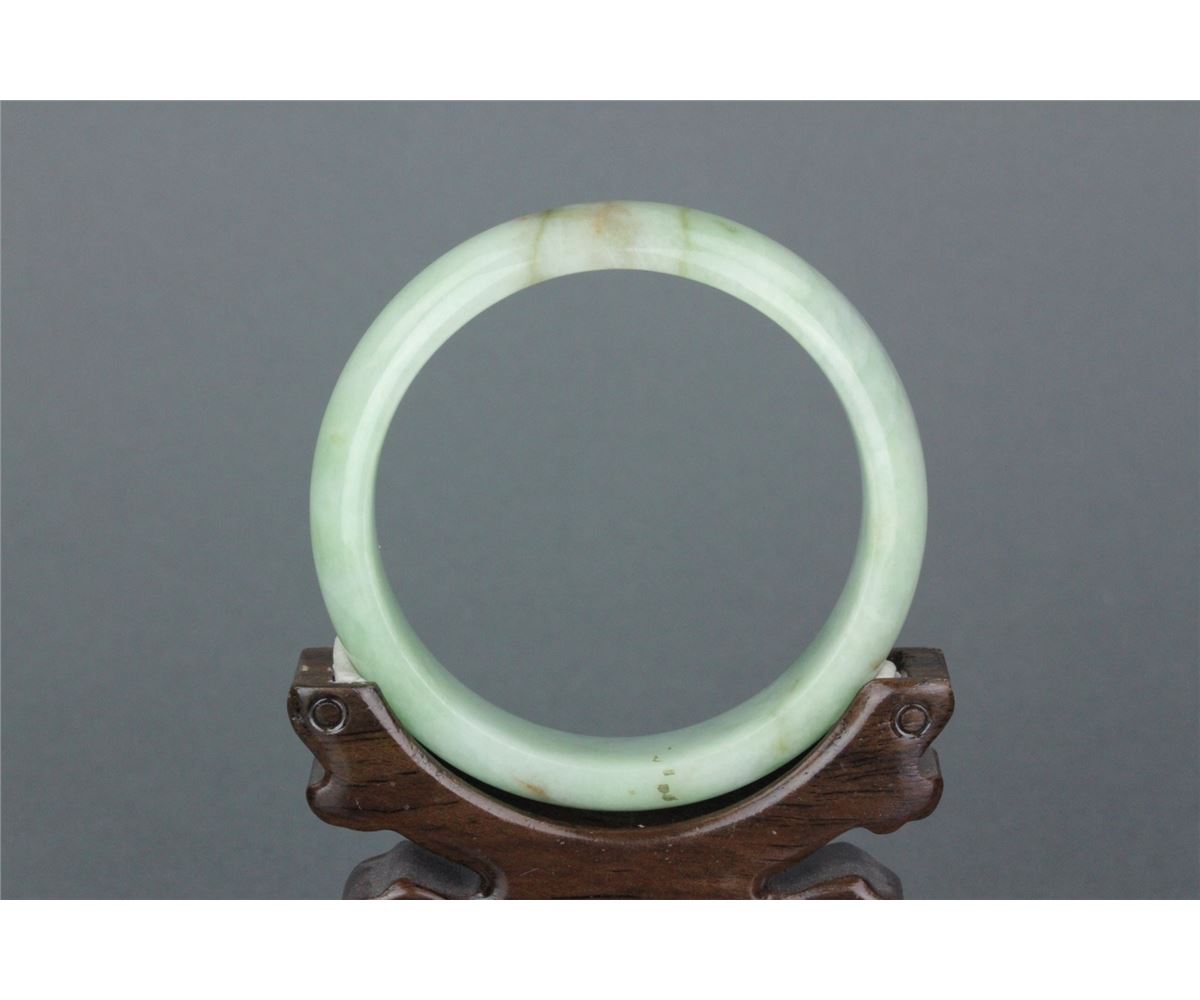 Chinese jadeite carved bangle; rounded outside and flatten inside; of apple green tone with spinach green vein; D: 7.2 cm, 67 grams, density: 3.31