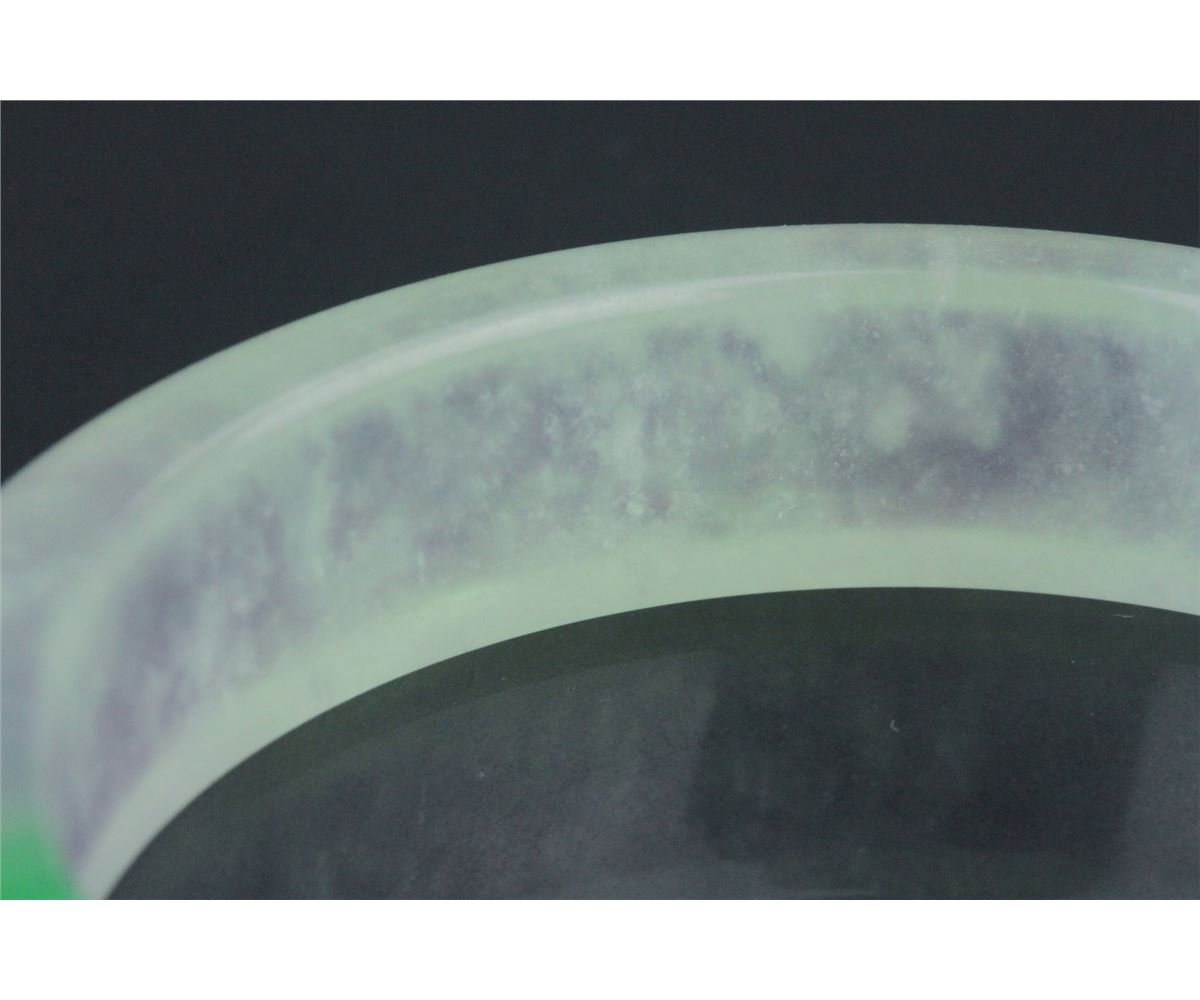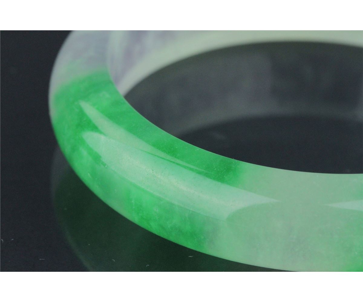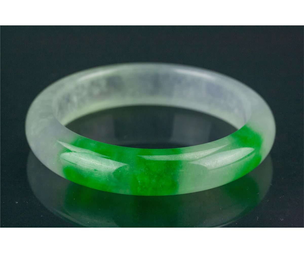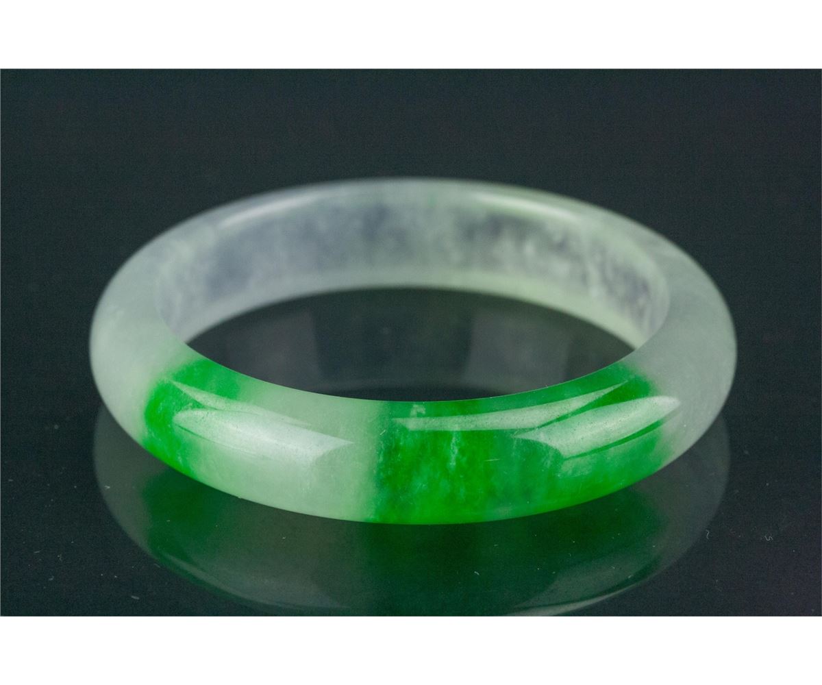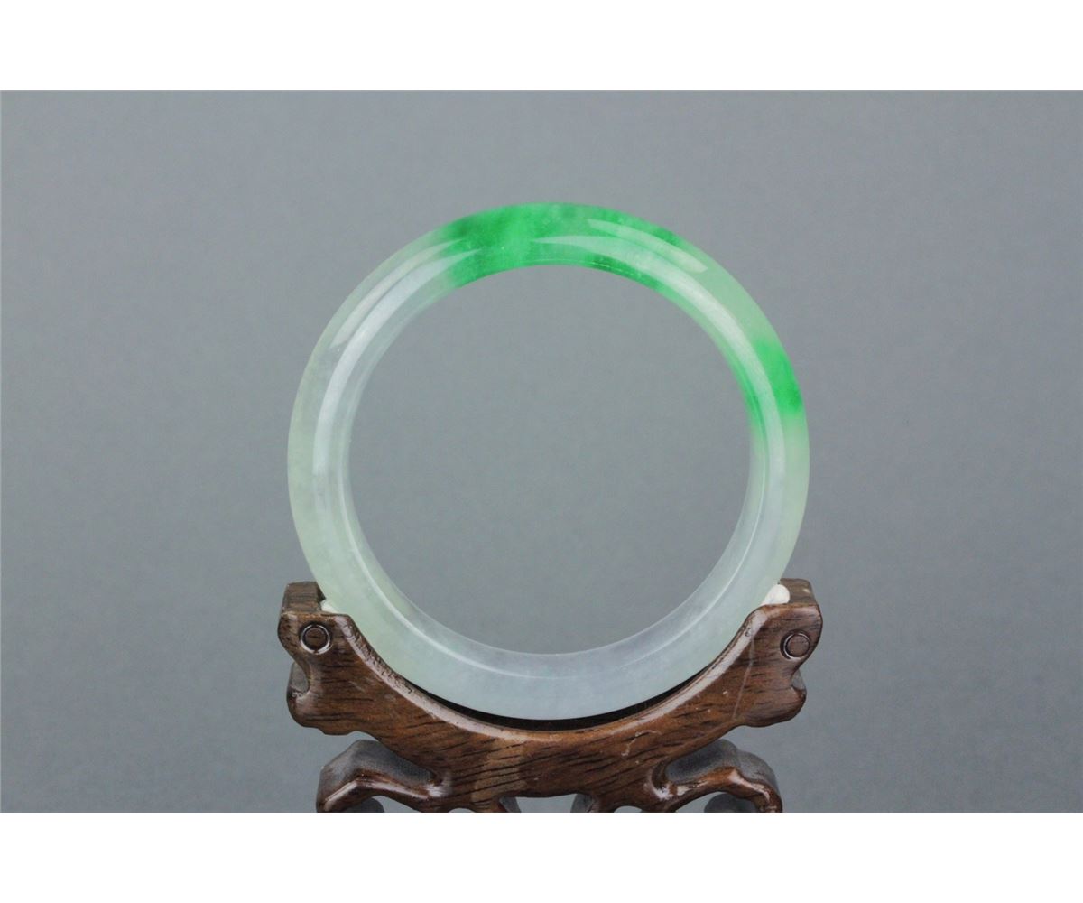 Chinese jadeite carved bangle; rounded outside and flatten inside; of translucent white tone with emerald green suffusions; D: 6 cm, 67 grams, density: 3.31